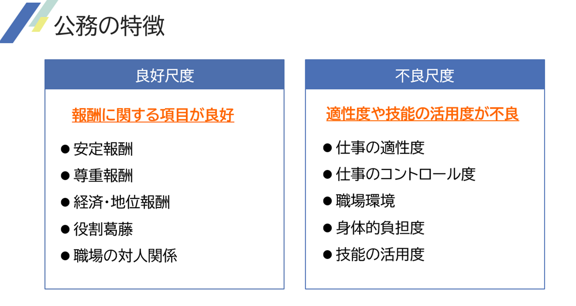 さらに、国家公務と地方公務の違いに着目すると、国家公務が地方公務よりも良好だった項目(偏差値の差が6ポイント以上)には、「身体的負担度」「情緒的負担」「安定報酬」「疲労感」「役割葛藤」が挙げられました。