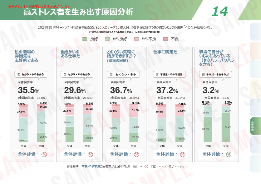 ドクタートラストが2024年度に実施した80項目版のストレスチェック全国データによると、次の5項目において不良な回答(最もネガティブな選択肢)をした人の中に高ストレス者が多く含まれていることが分かりました。