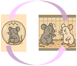 次に見知らぬラットと同じケージに入れ次の日まで過ごします。これを15日間 繰り返し、毎日新たな知らないラットととの同居生活。思春期特有の「社会ストレスモデル」だそうです。かわいそうに(図1)。