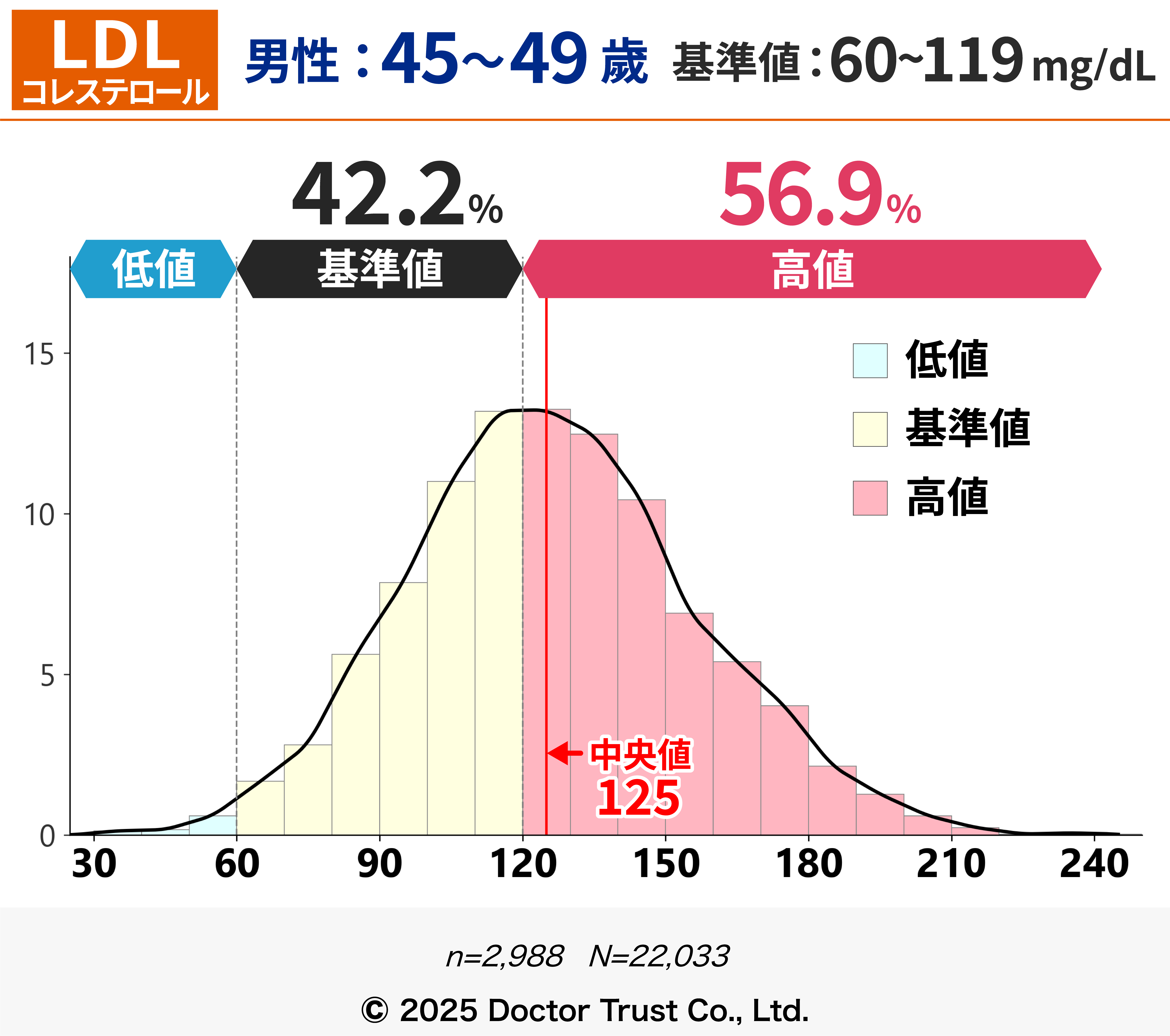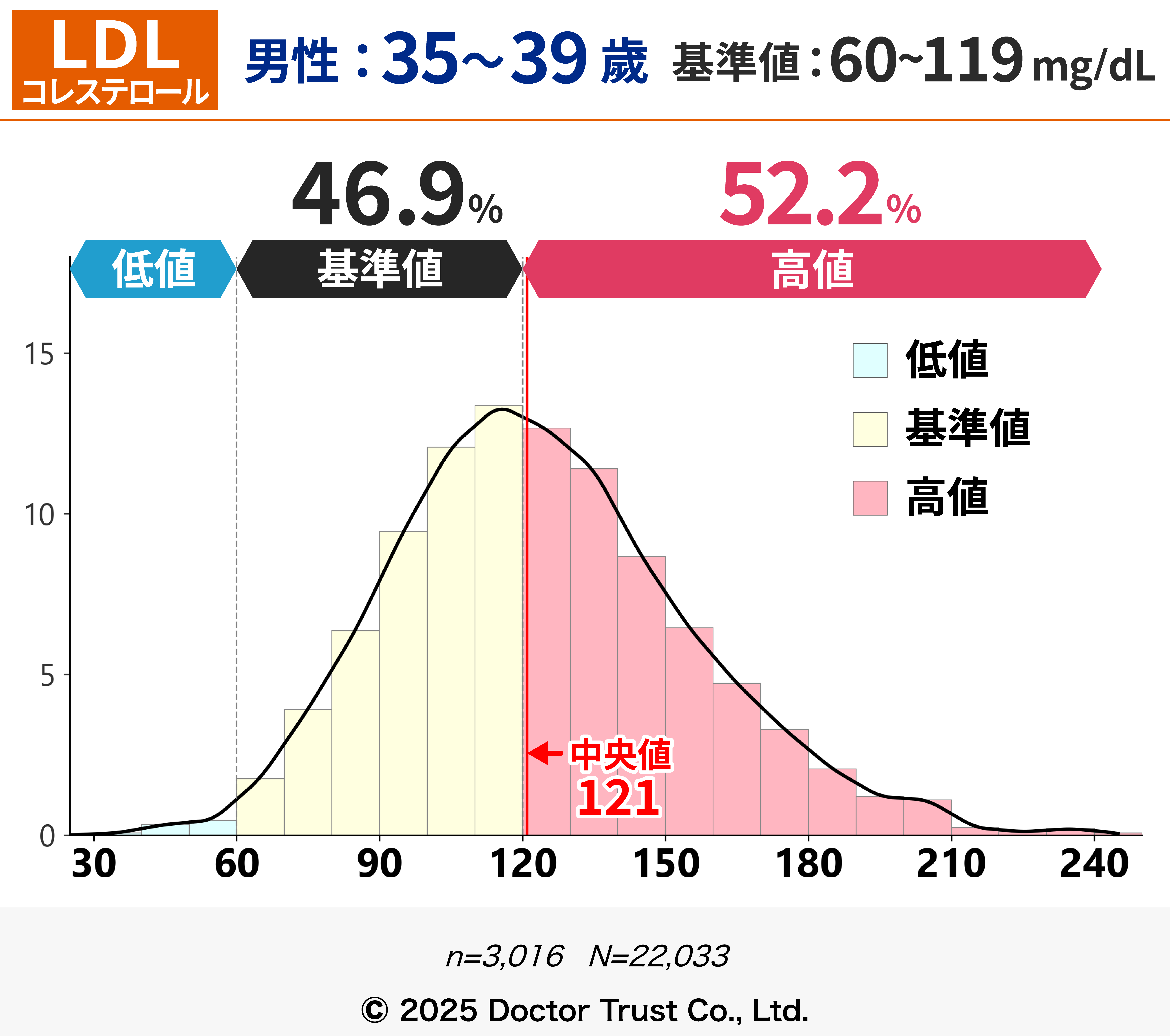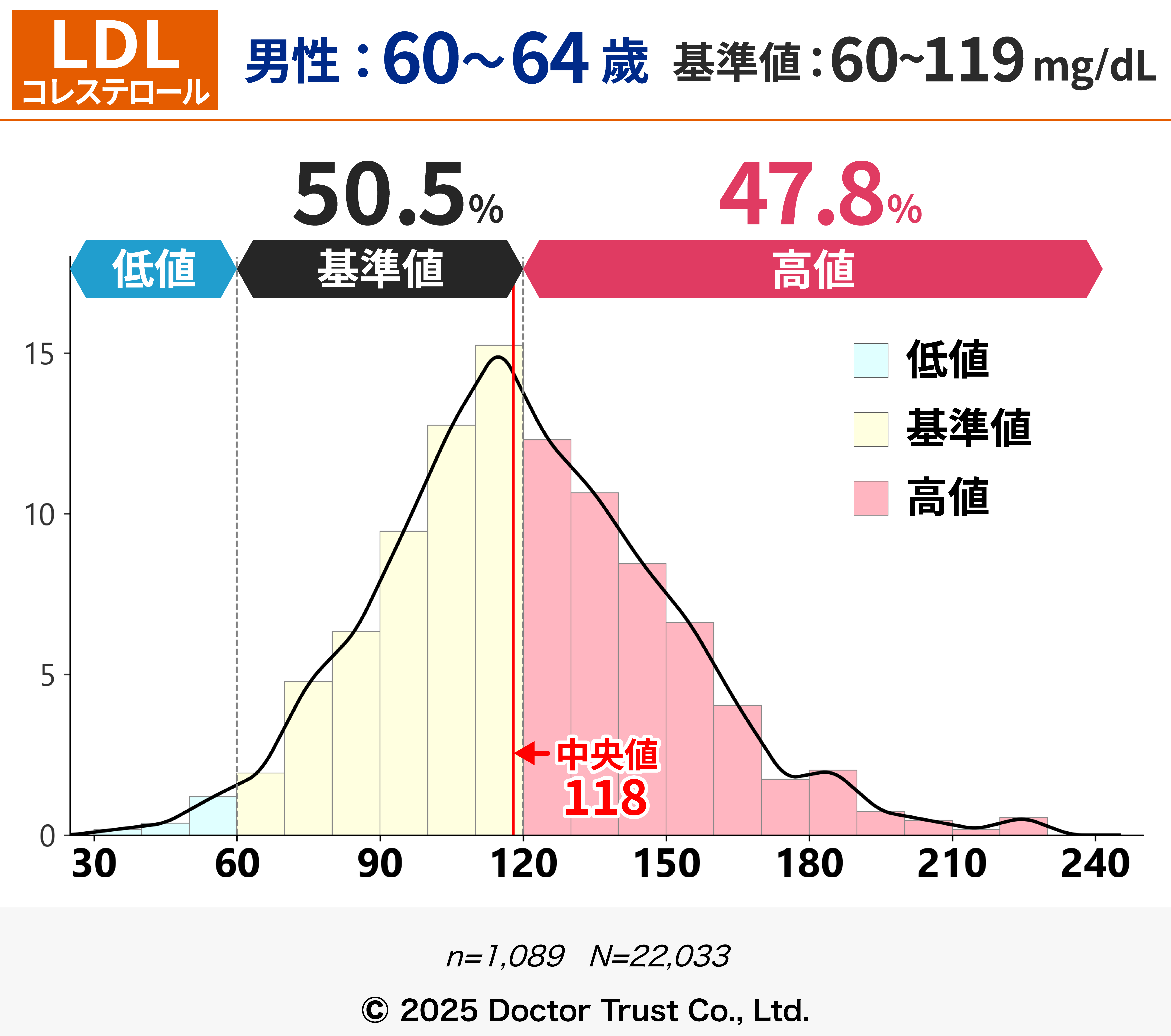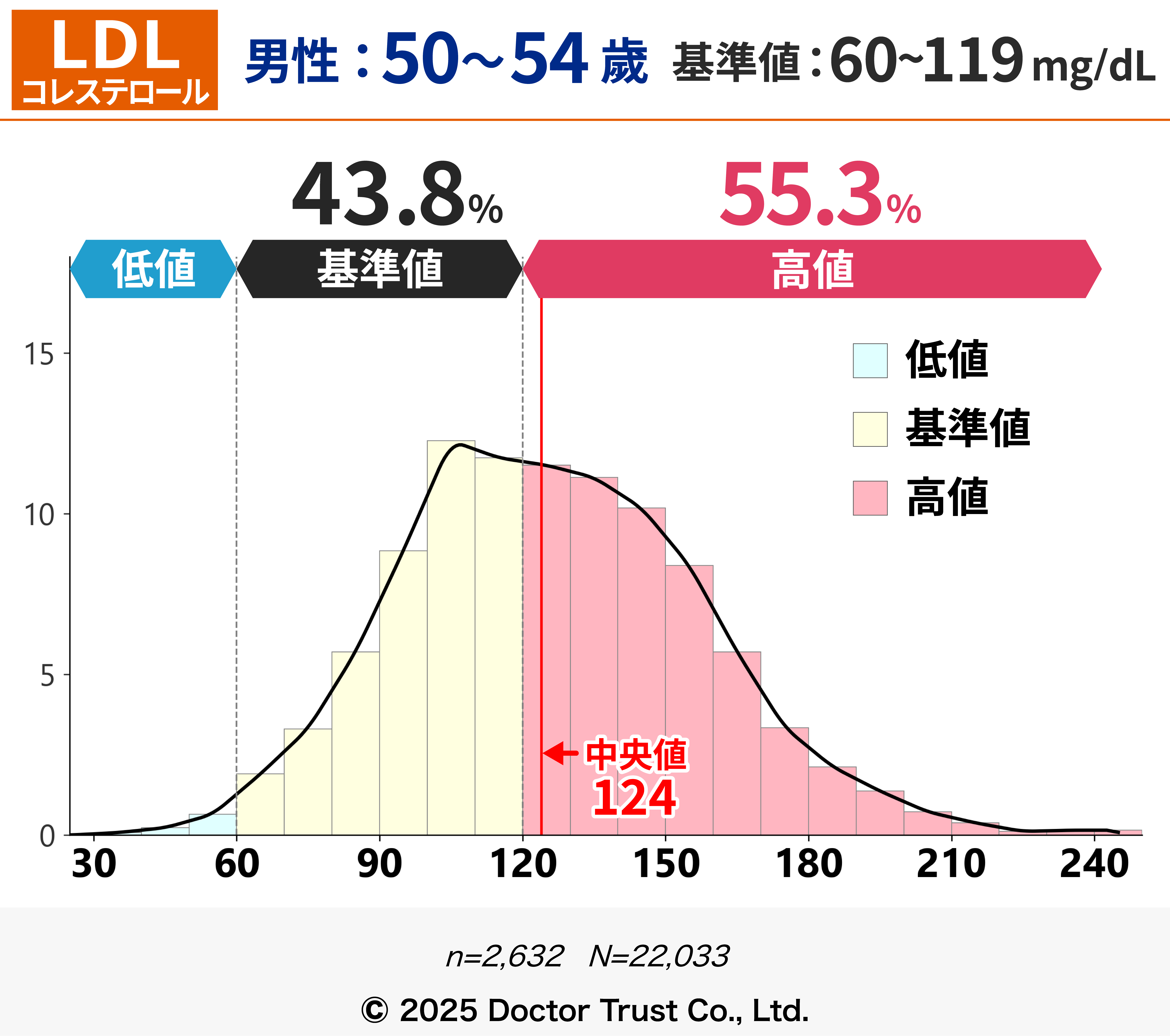 35~39歳では中央値が基準値の上限値119mg/dLを超えます。その後40代から50代までは中央値が基準値の上限値119mg/dLを超え続けています。基準値内であっても25歳以上は基準値に近い高値予備軍の割合も高めです。菓子パンやスナック菓子など、見えにくい脂の摂りすぎに注意をしましょう。