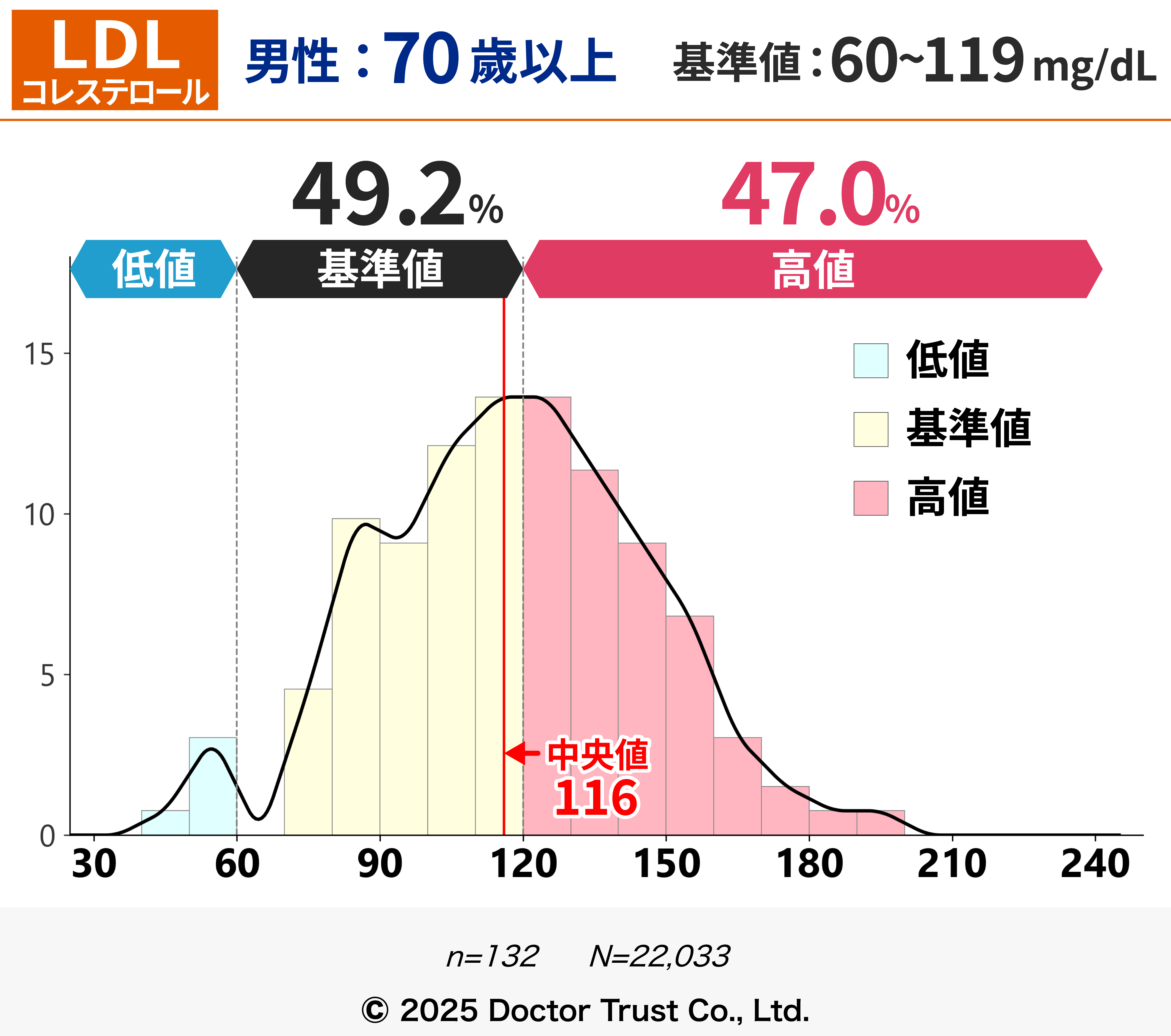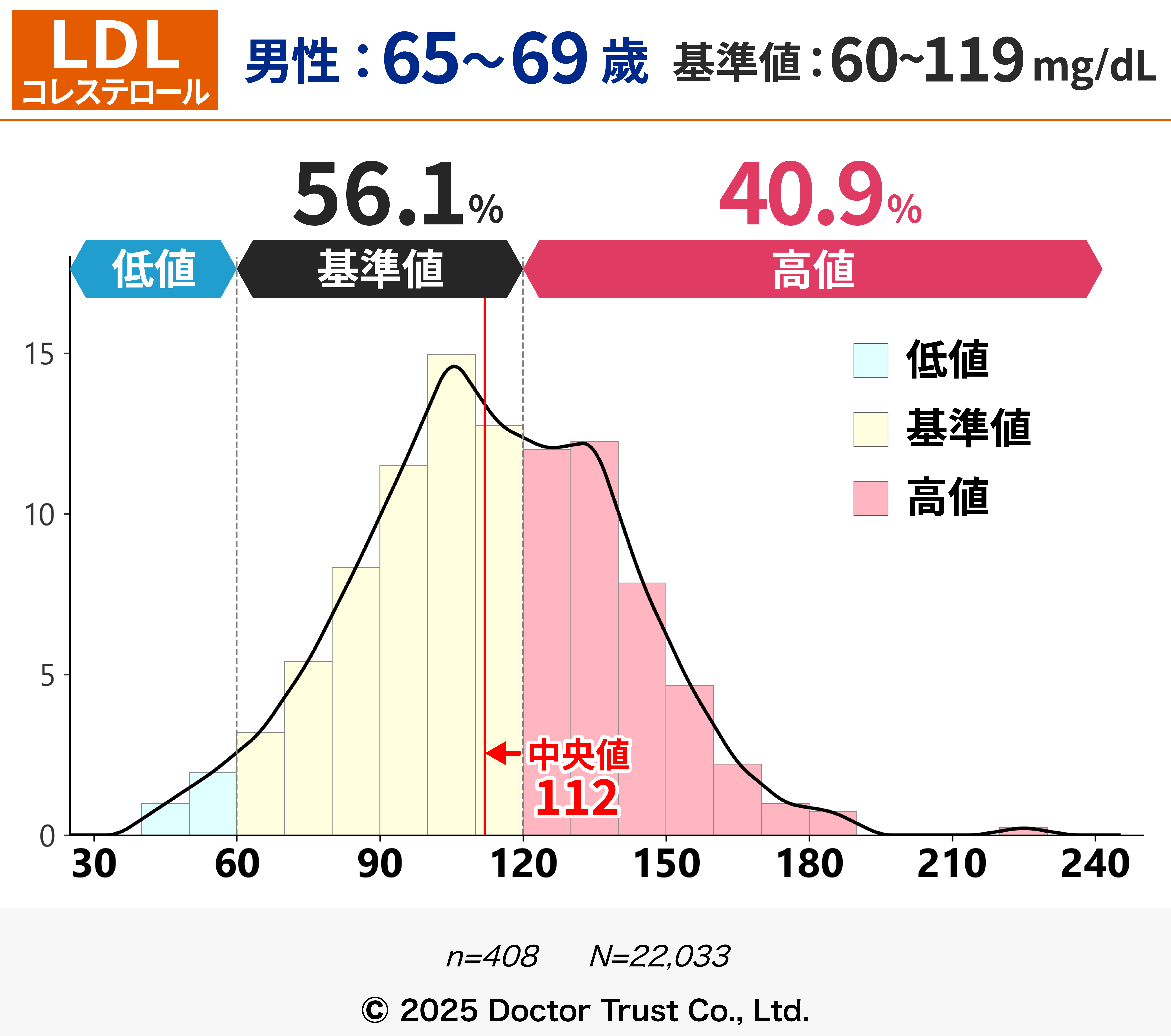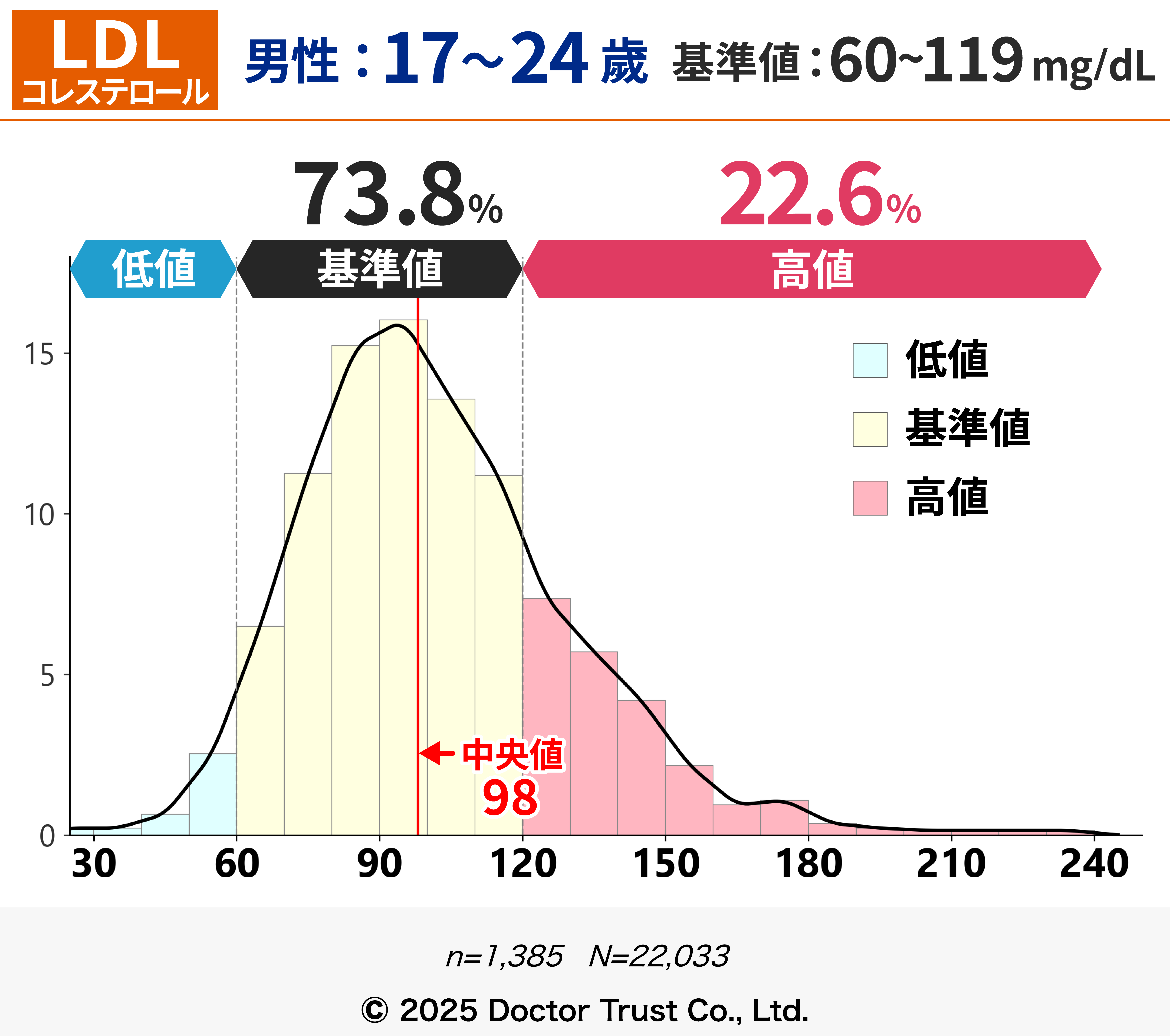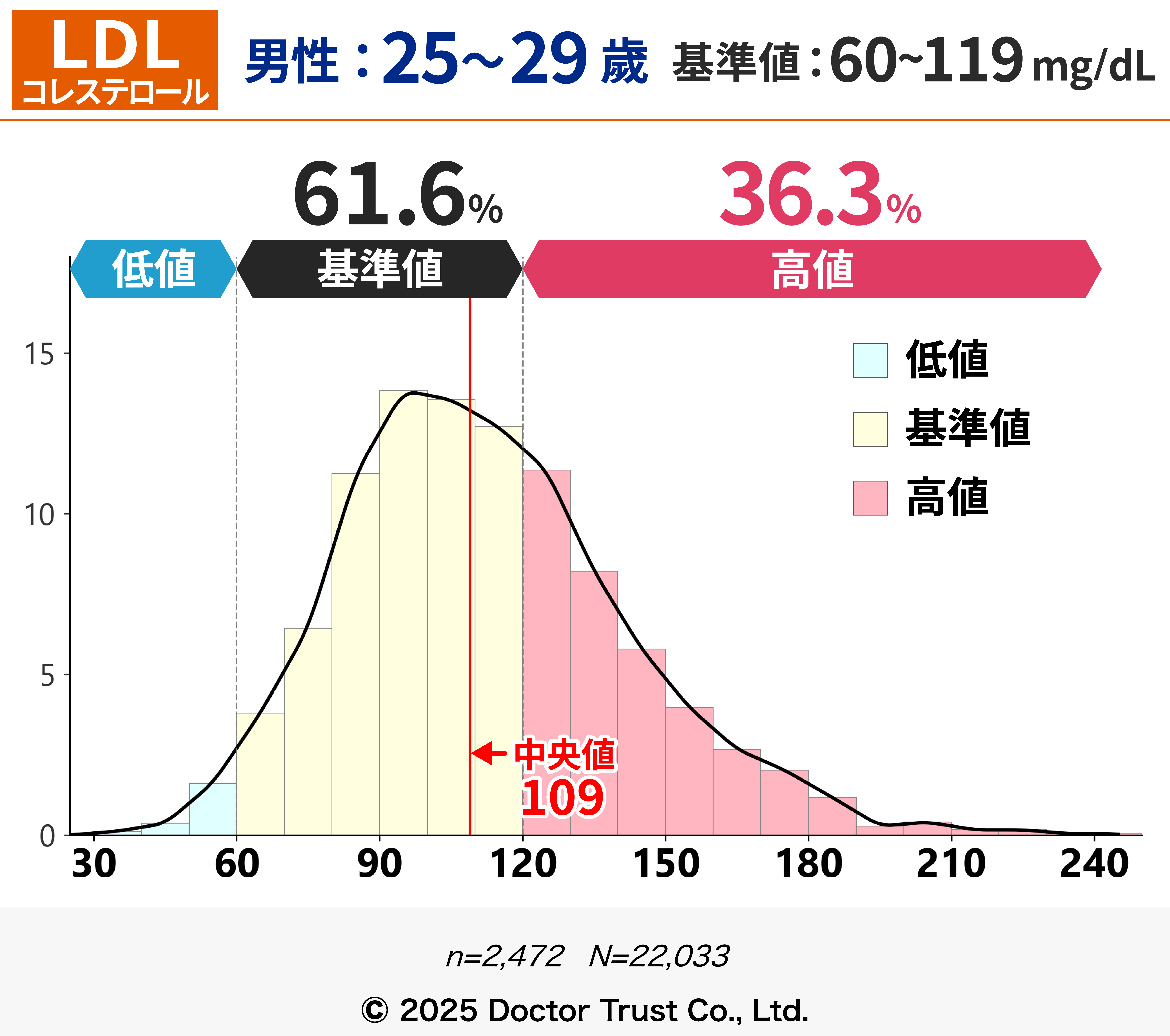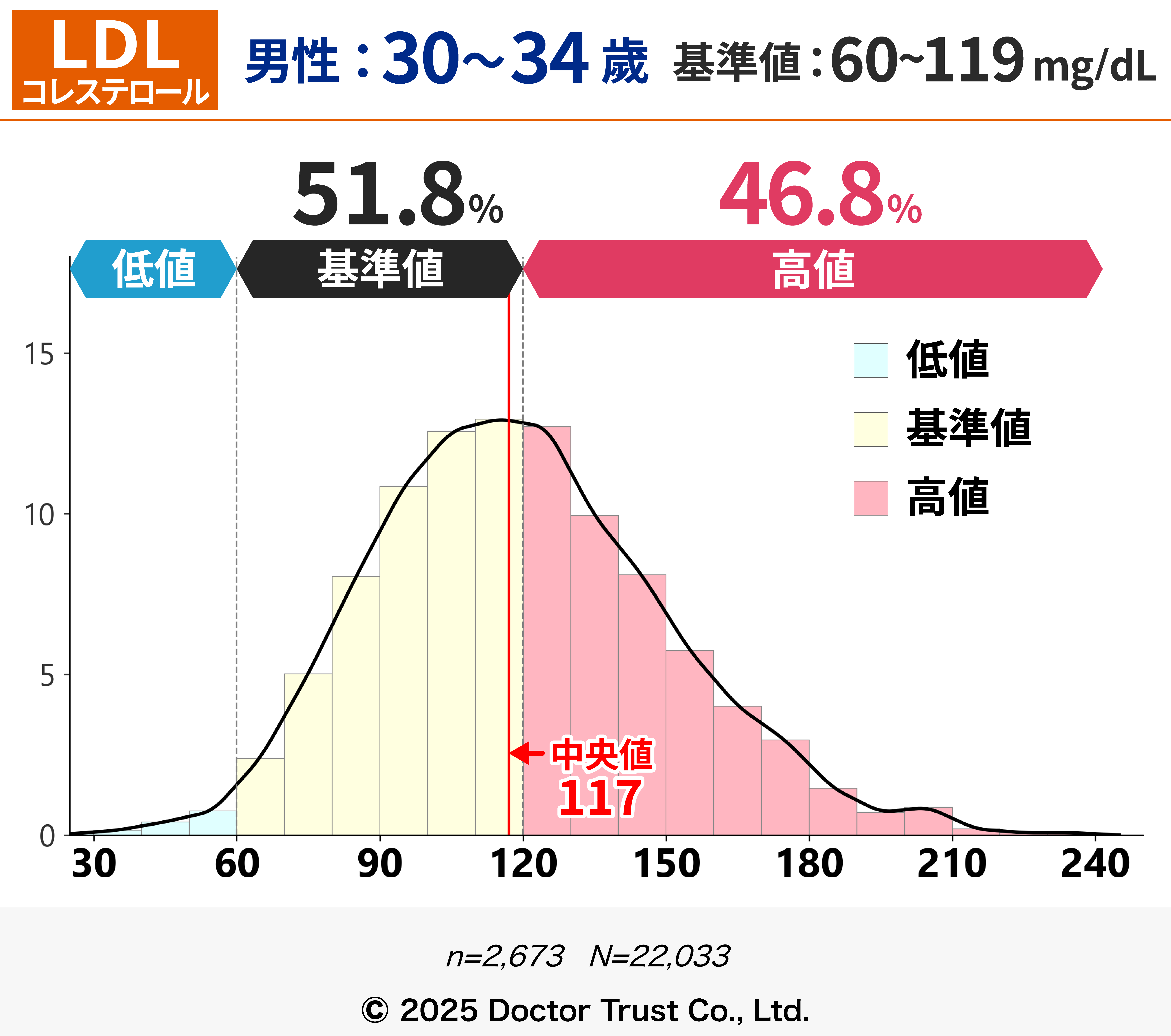 35~39歳では中央値が基準値の上限値119mg/dLを超えます。その後40代から50代までは中央値が基準値の上限値119mg/dLを超え続けています。基準値内であっても25歳以上は基準値に近い高値予備軍の割合も高めです。菓子パンやスナック菓子など、見えにくい脂の摂りすぎに注意をしましょう。