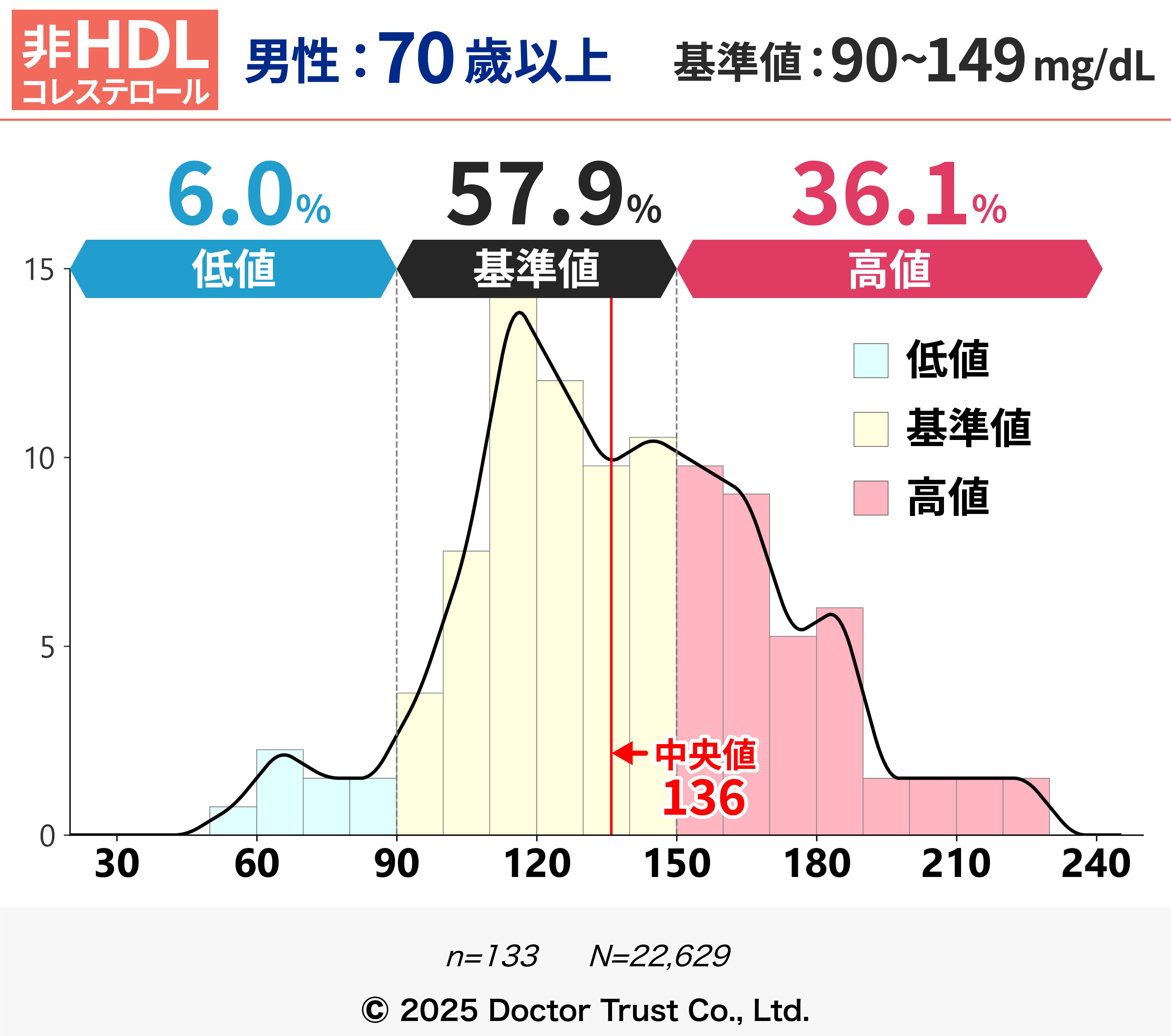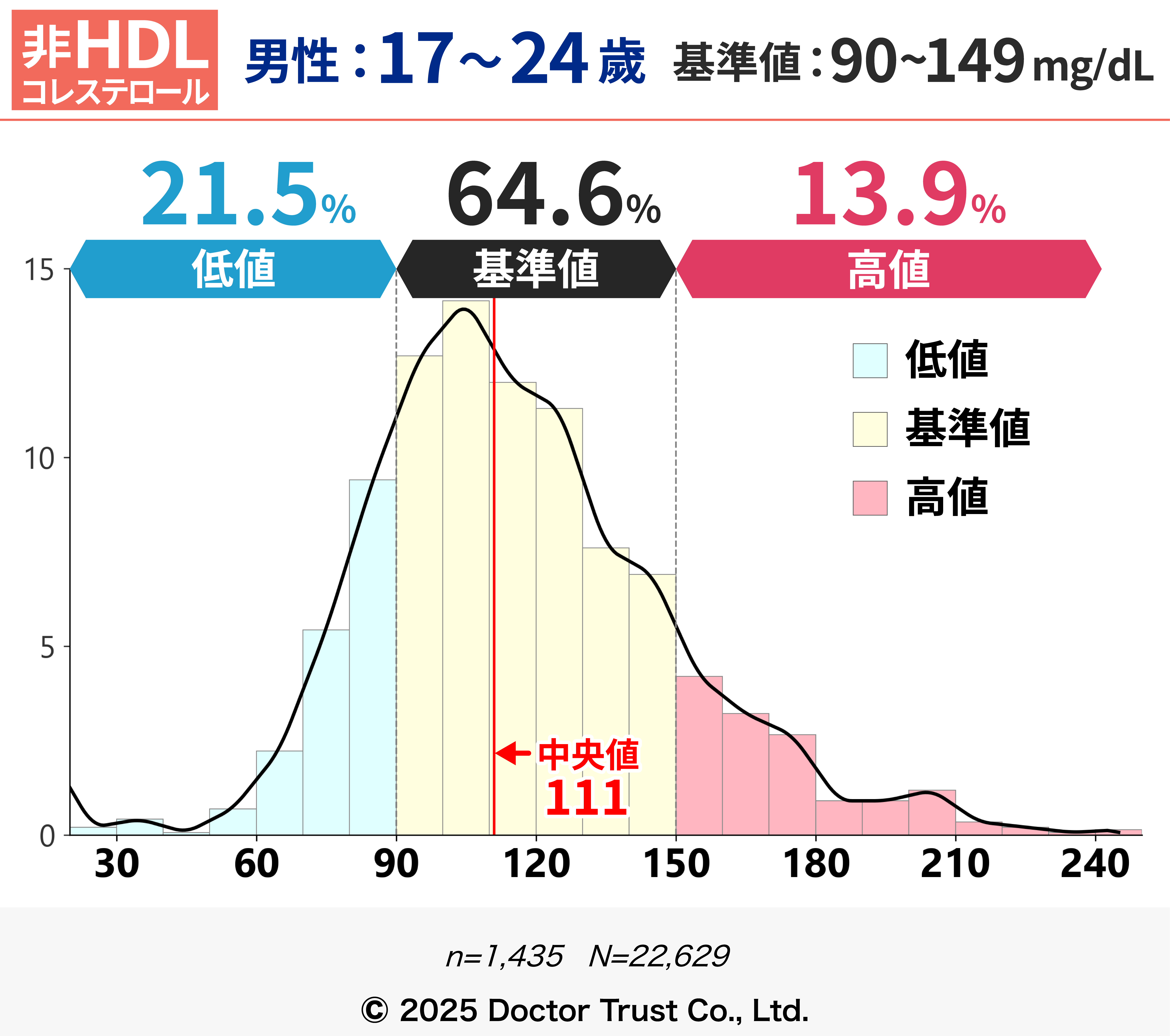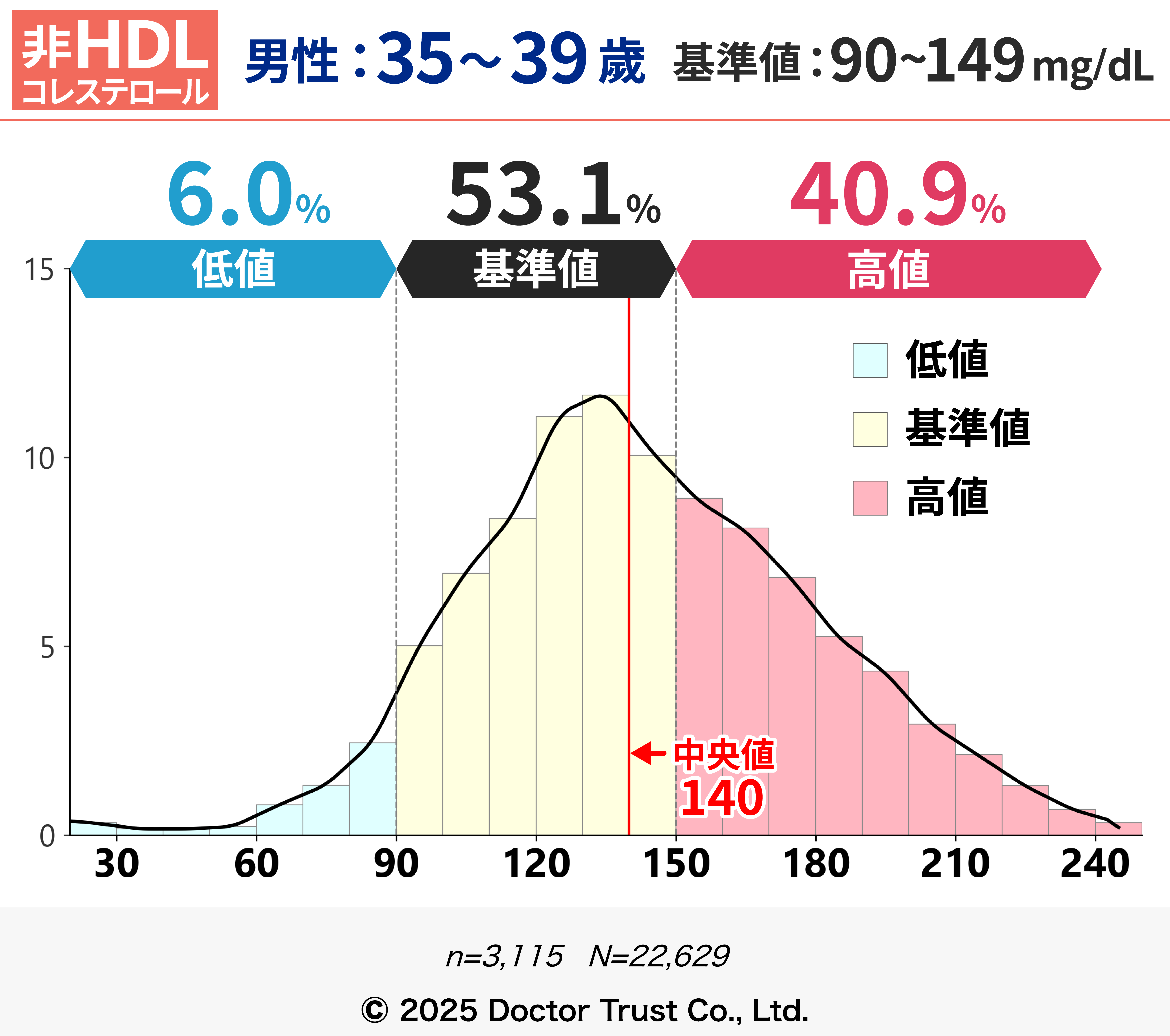 総コレステロールからHDLコレステロールを引いた値で、LDLコレステロールだけではなく、他の動脈硬化を促進する脂質も含みます。