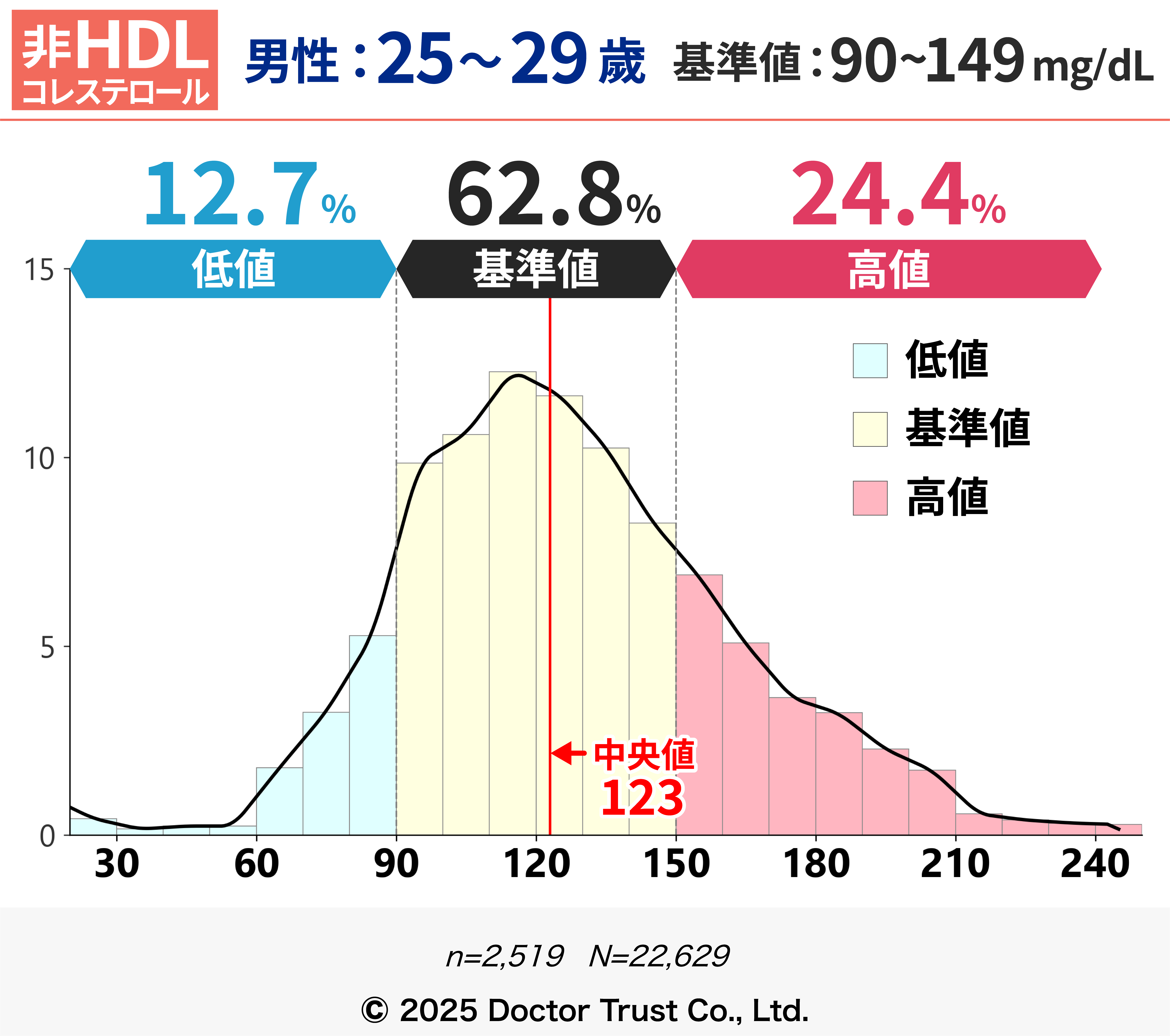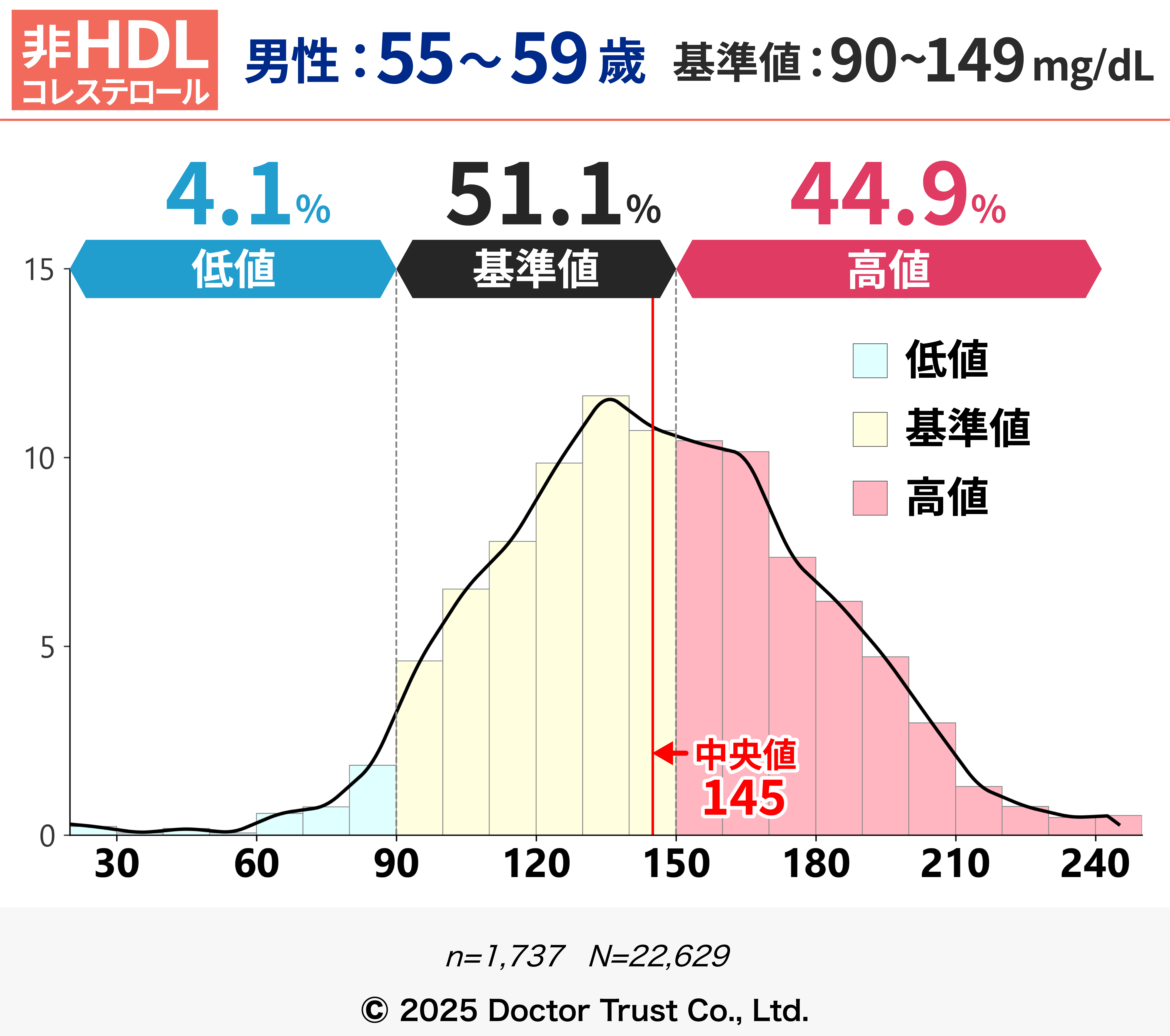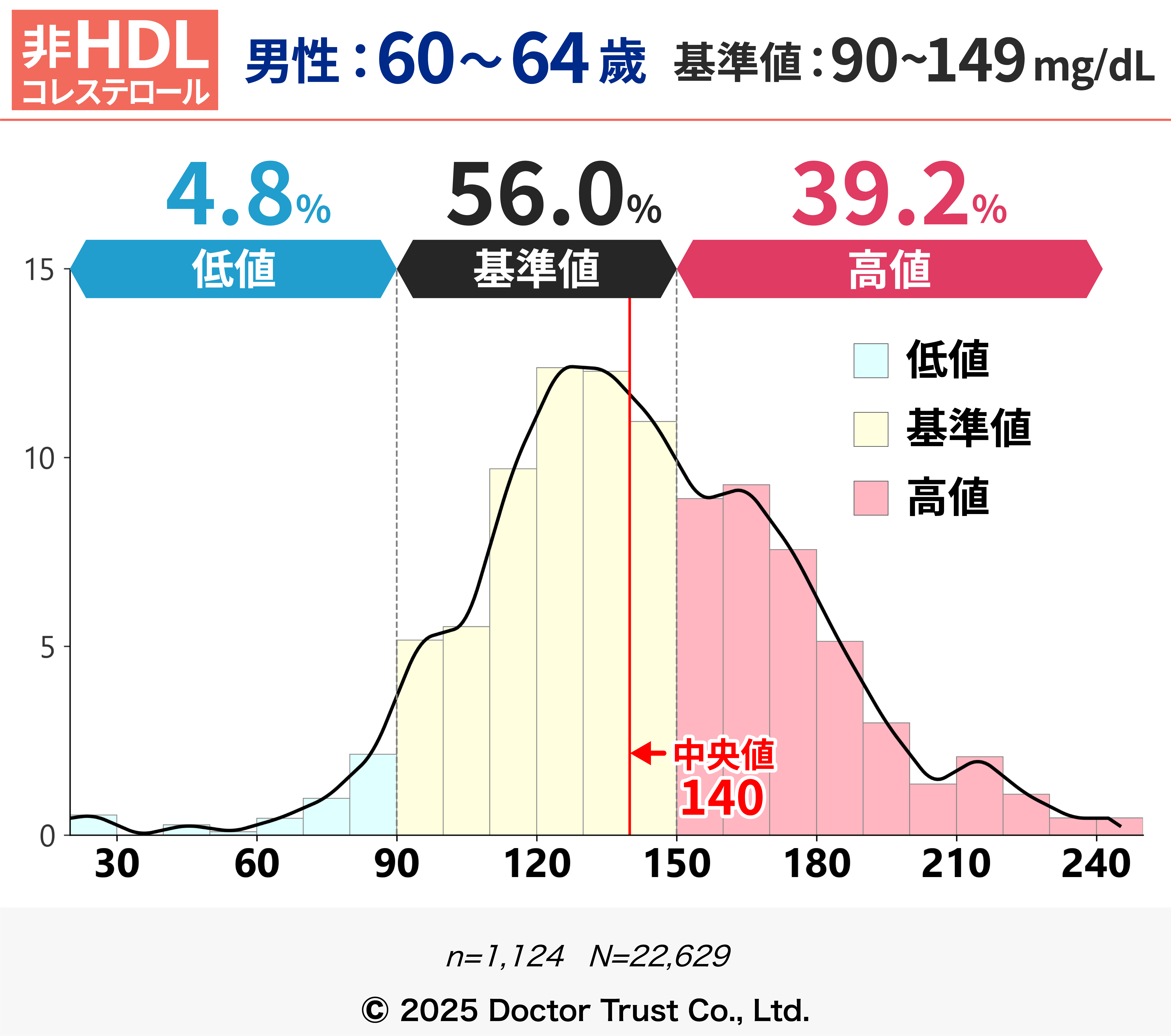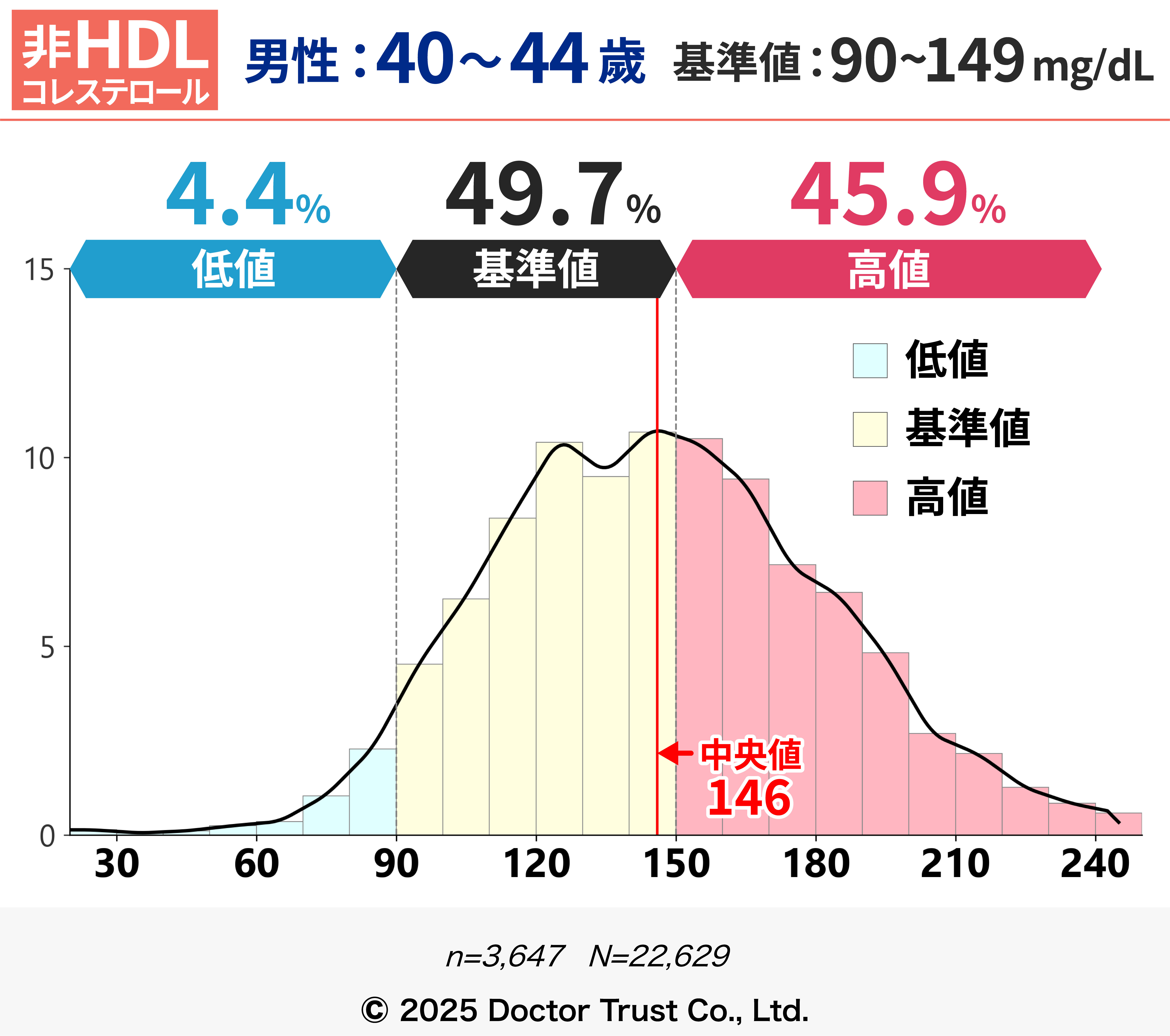 総コレステロールからHDLコレステロールを引いた値で、LDLコレステロールだけではなく、他の動脈硬化を促進する脂質も含みます。