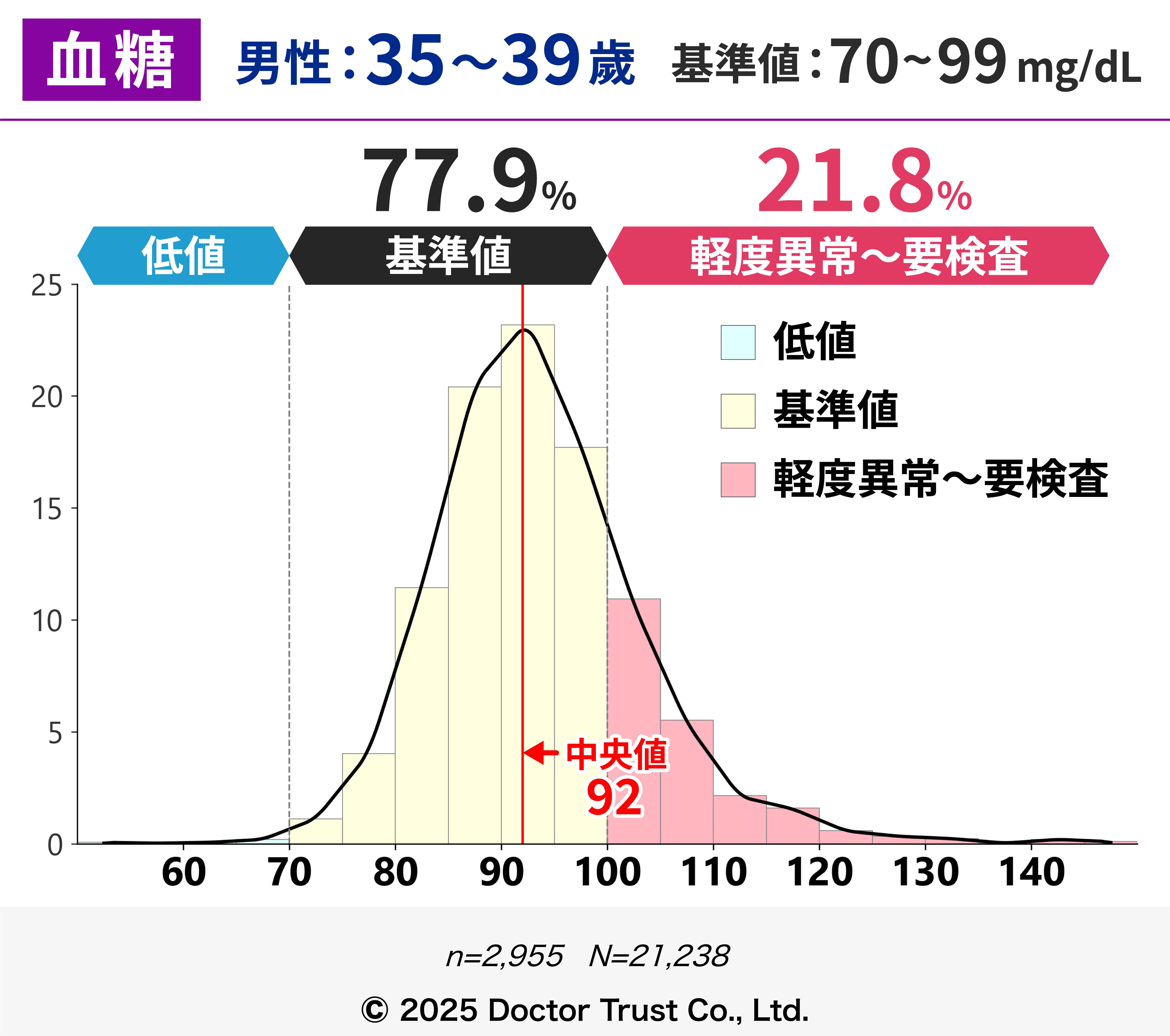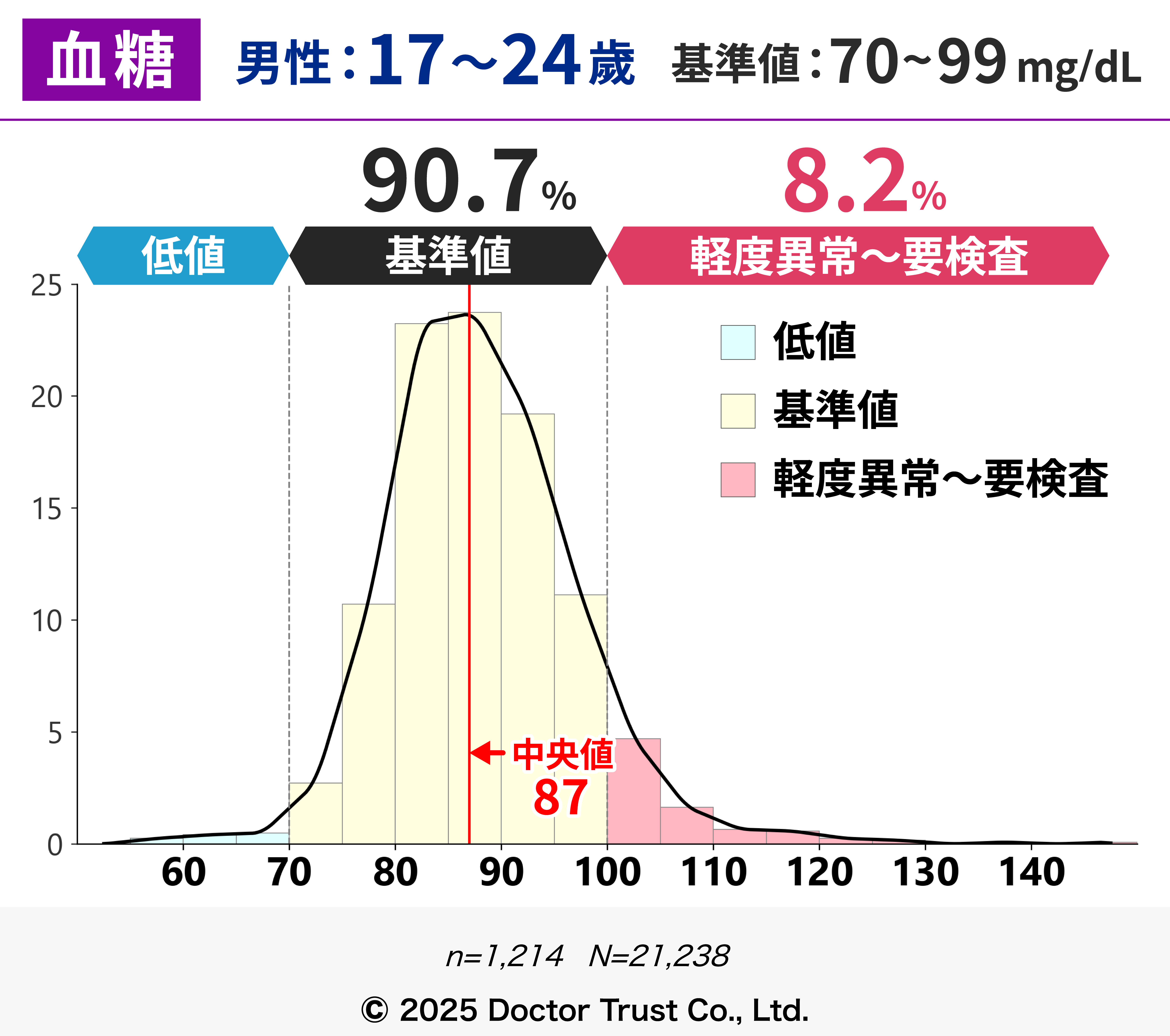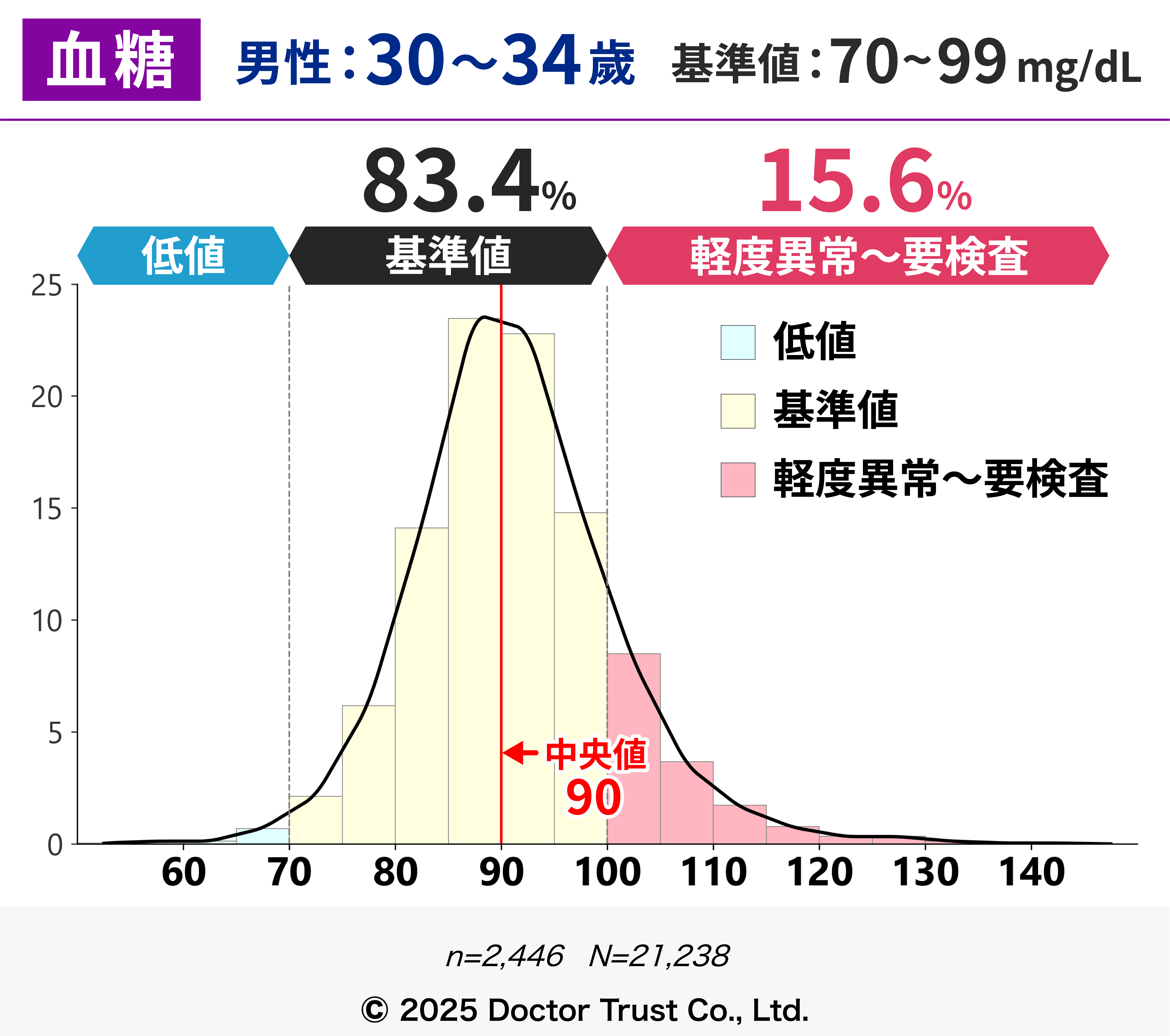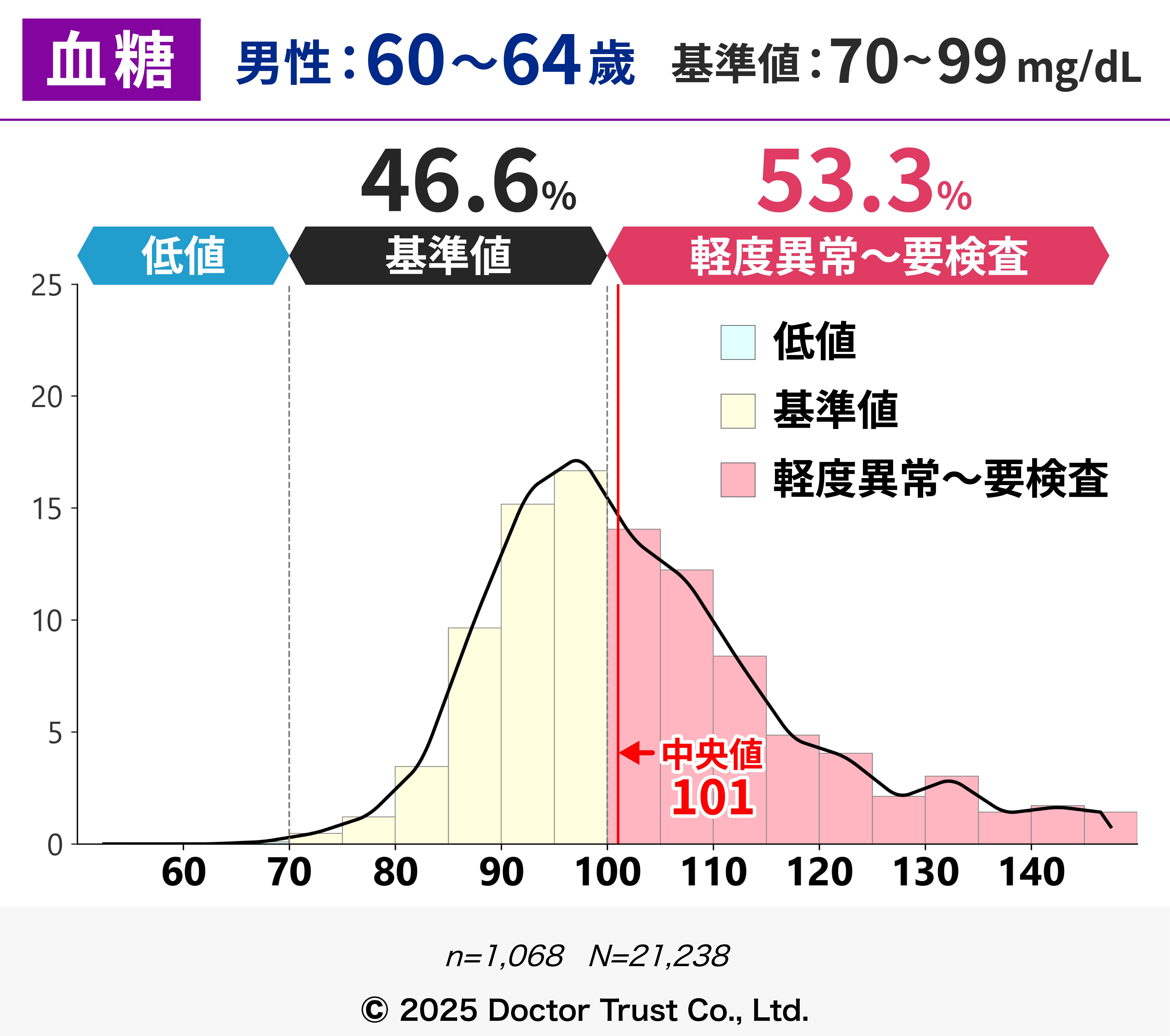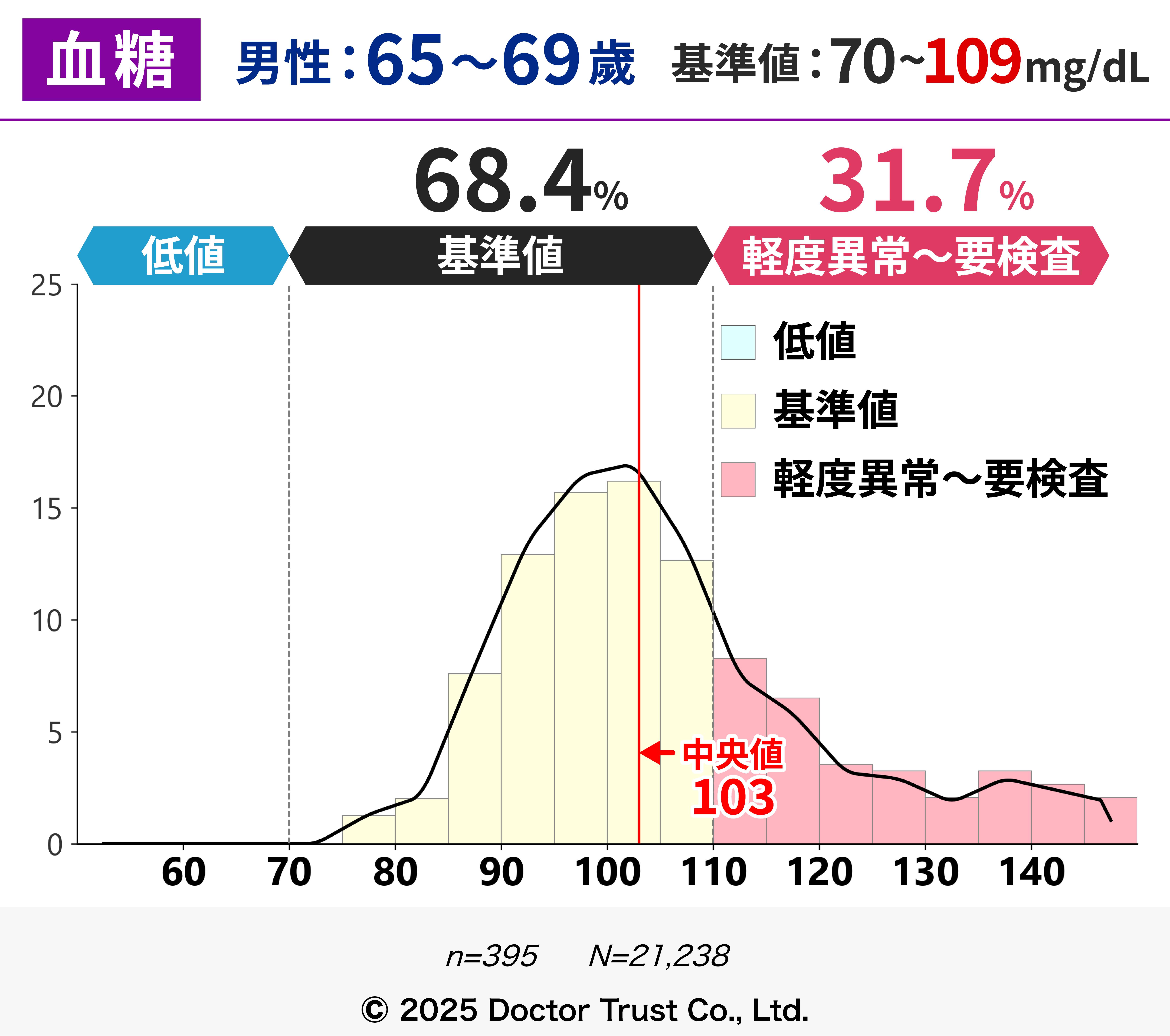 血液中のグルコース(ブドウ糖)の濃度。グルコースは砂糖の成分の一つで、多くの糖の構成分子です。あらゆる生物にとって重要なエネルギー源です。食事により血液中の濃度が上昇した後、膵臓のインスリンの作用により近傍の細胞に取り込まれ、血糖が正常値に下げられます。
