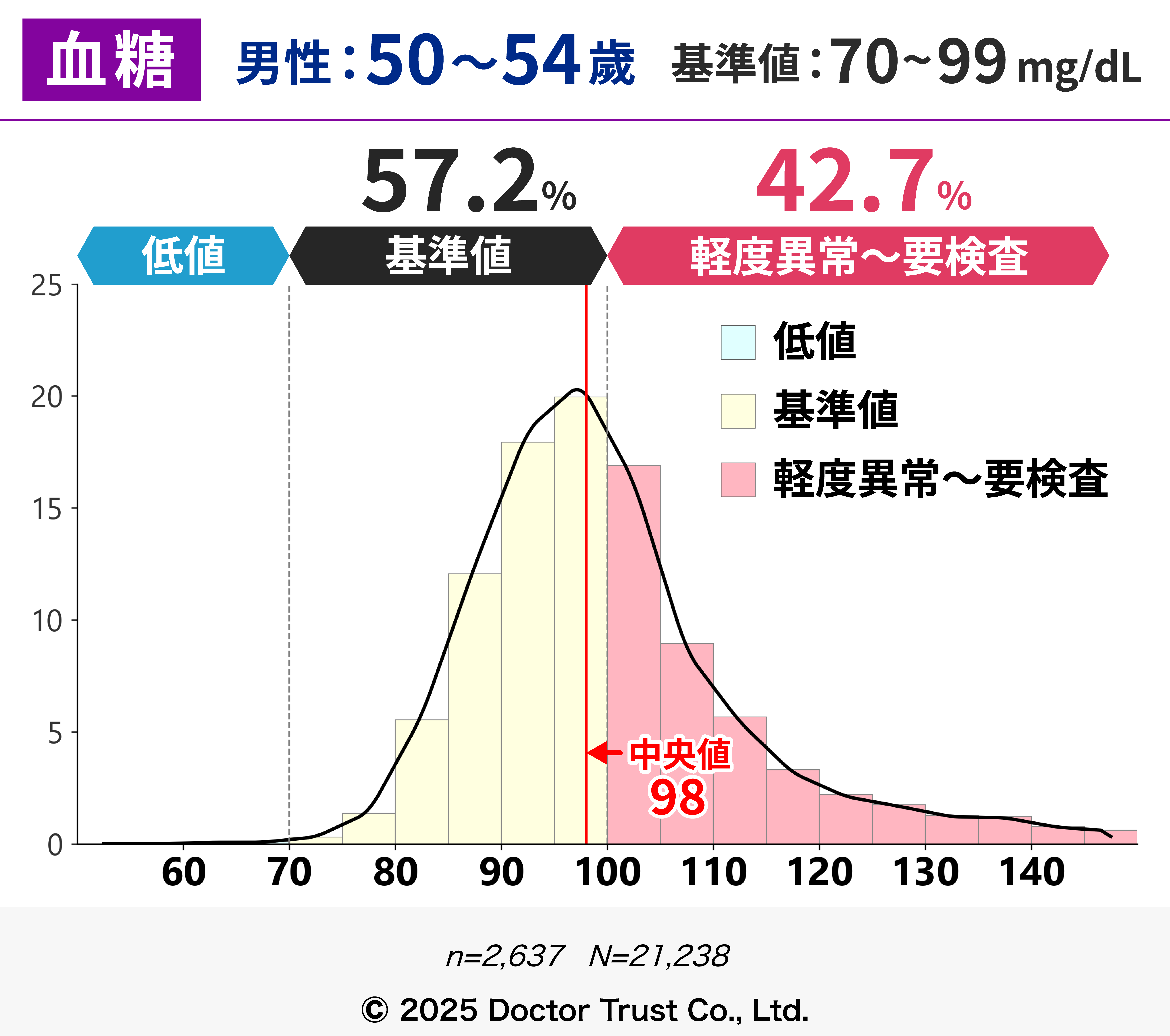 特定保健指導が始まる40歳以上の年代になると約3人に1人が軽度異常~要検査となっています。さらに50代に入ると約2人に1人が軽度異常~要検査となっており、年齢とともにその割合が増えていることが分かります。