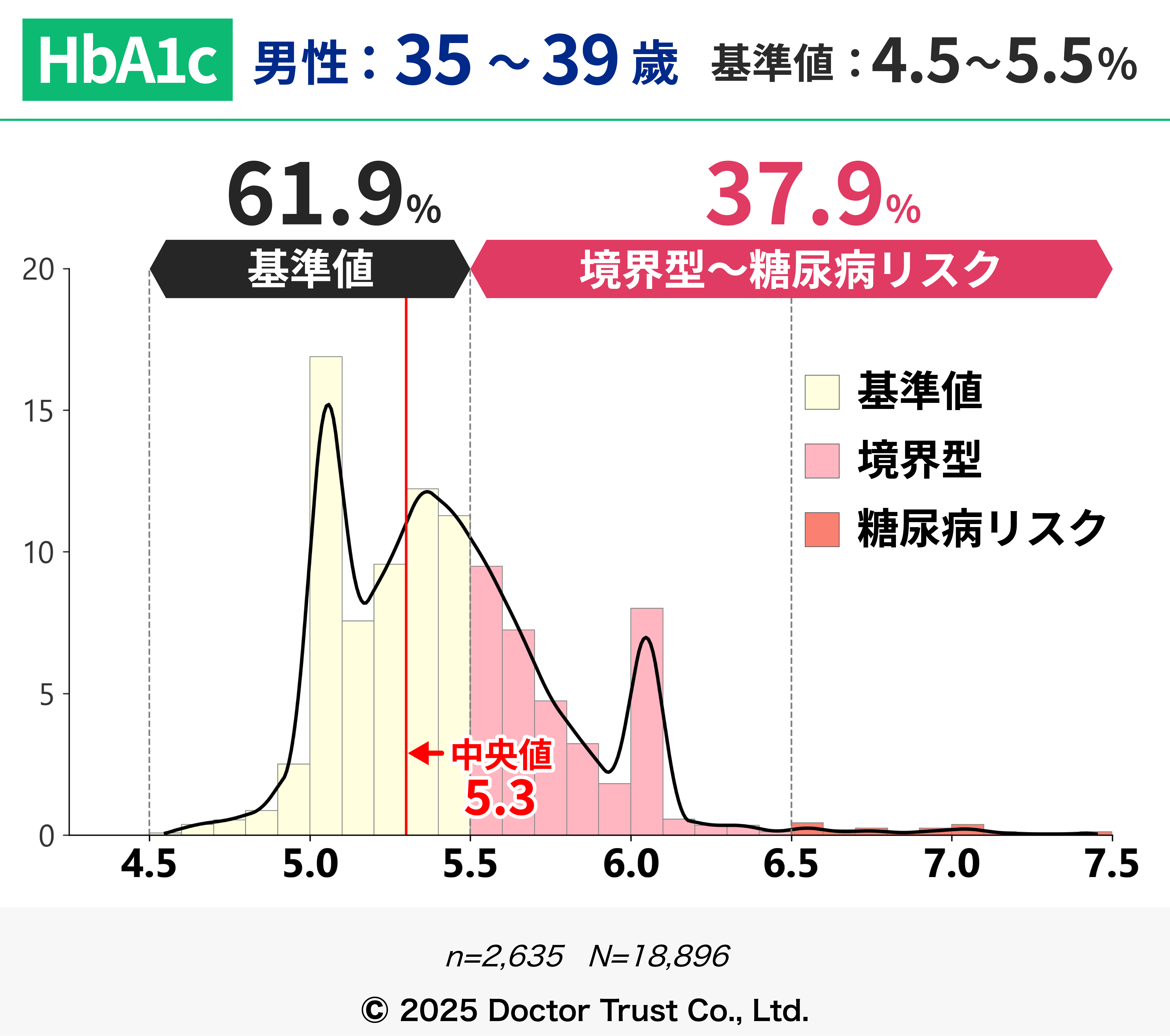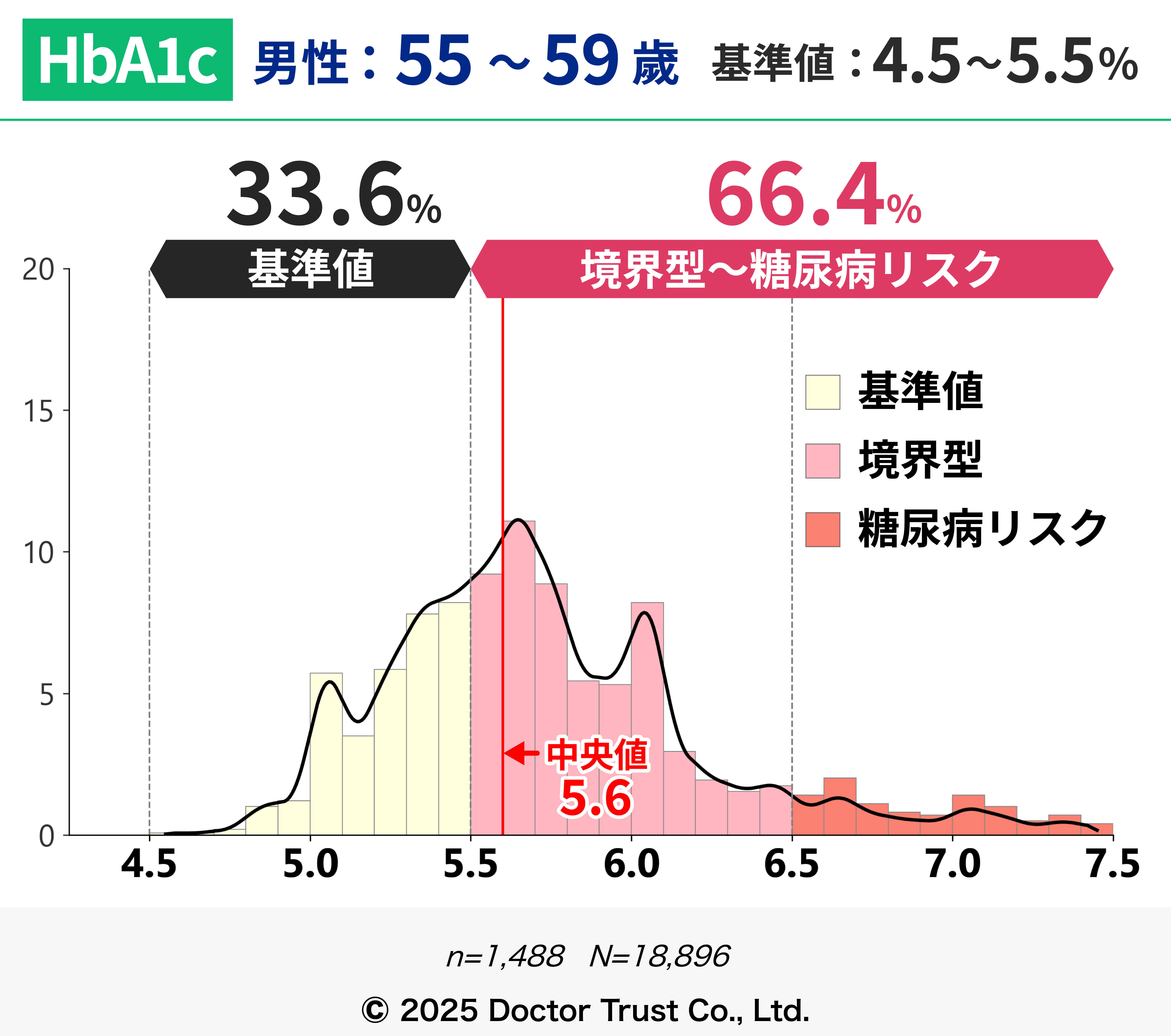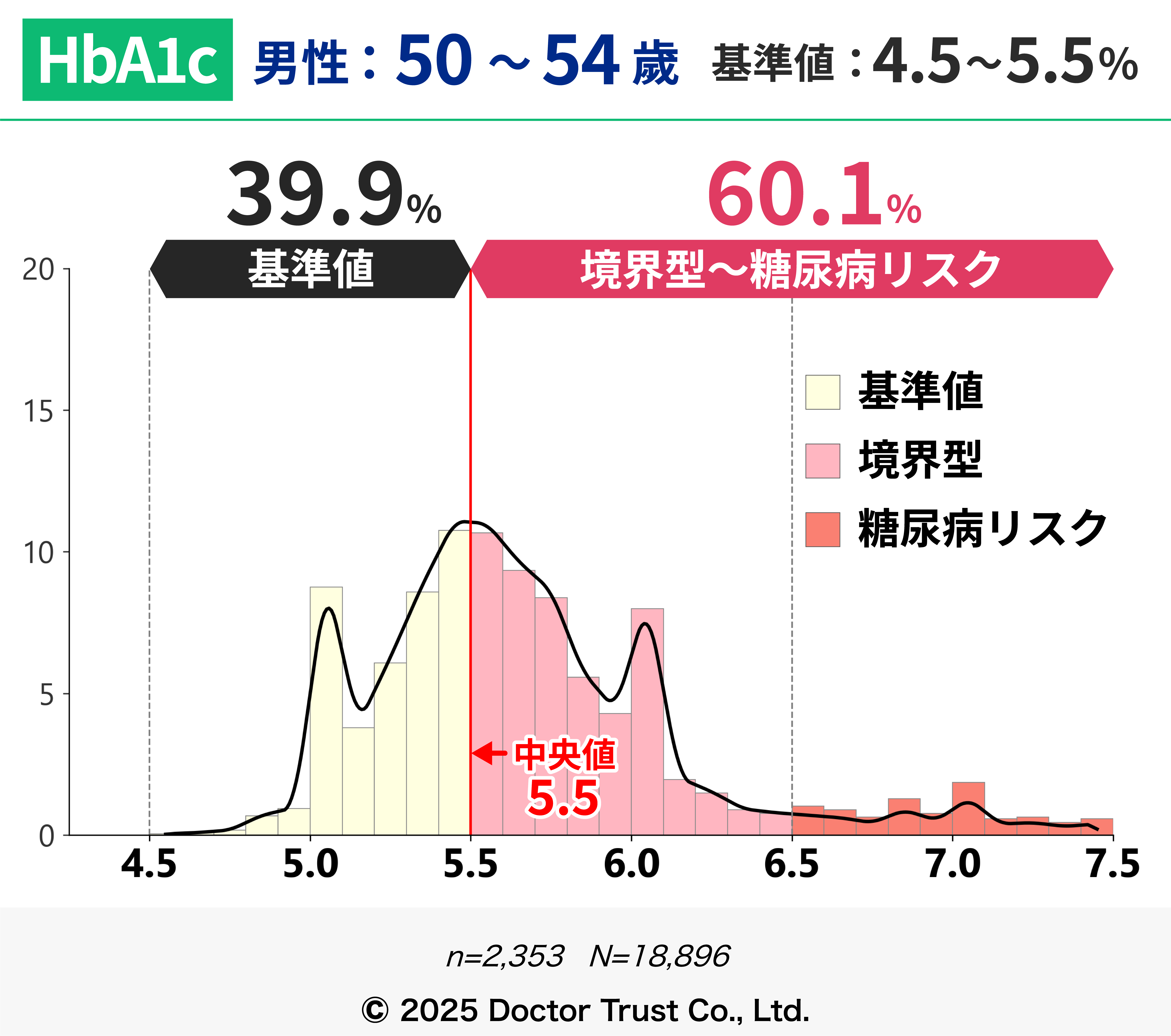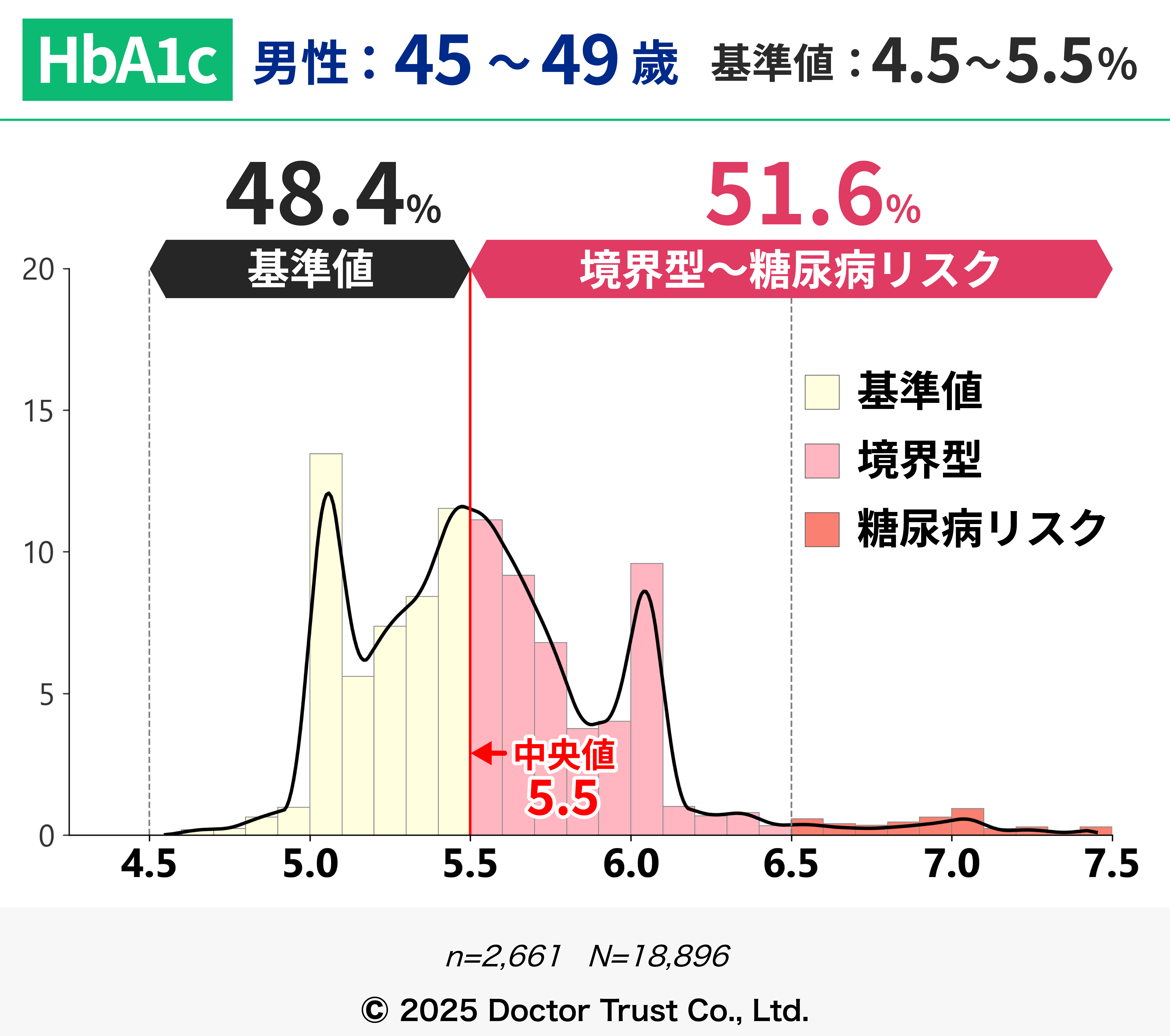 45歳を超えると、境界型~糖尿病リスクの方が51.6%となり、基準値内に収まっている割合の方が少ない結果です。