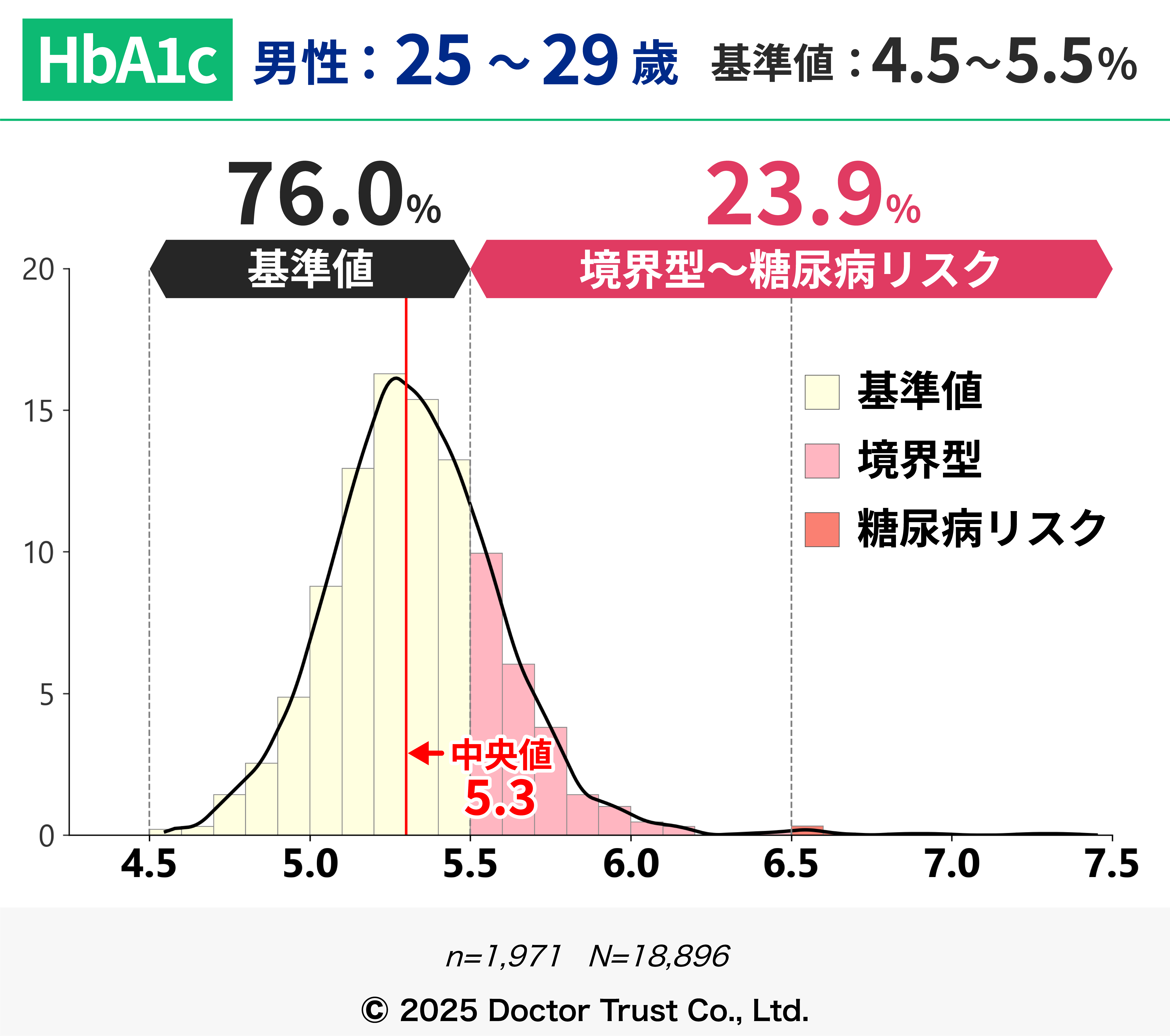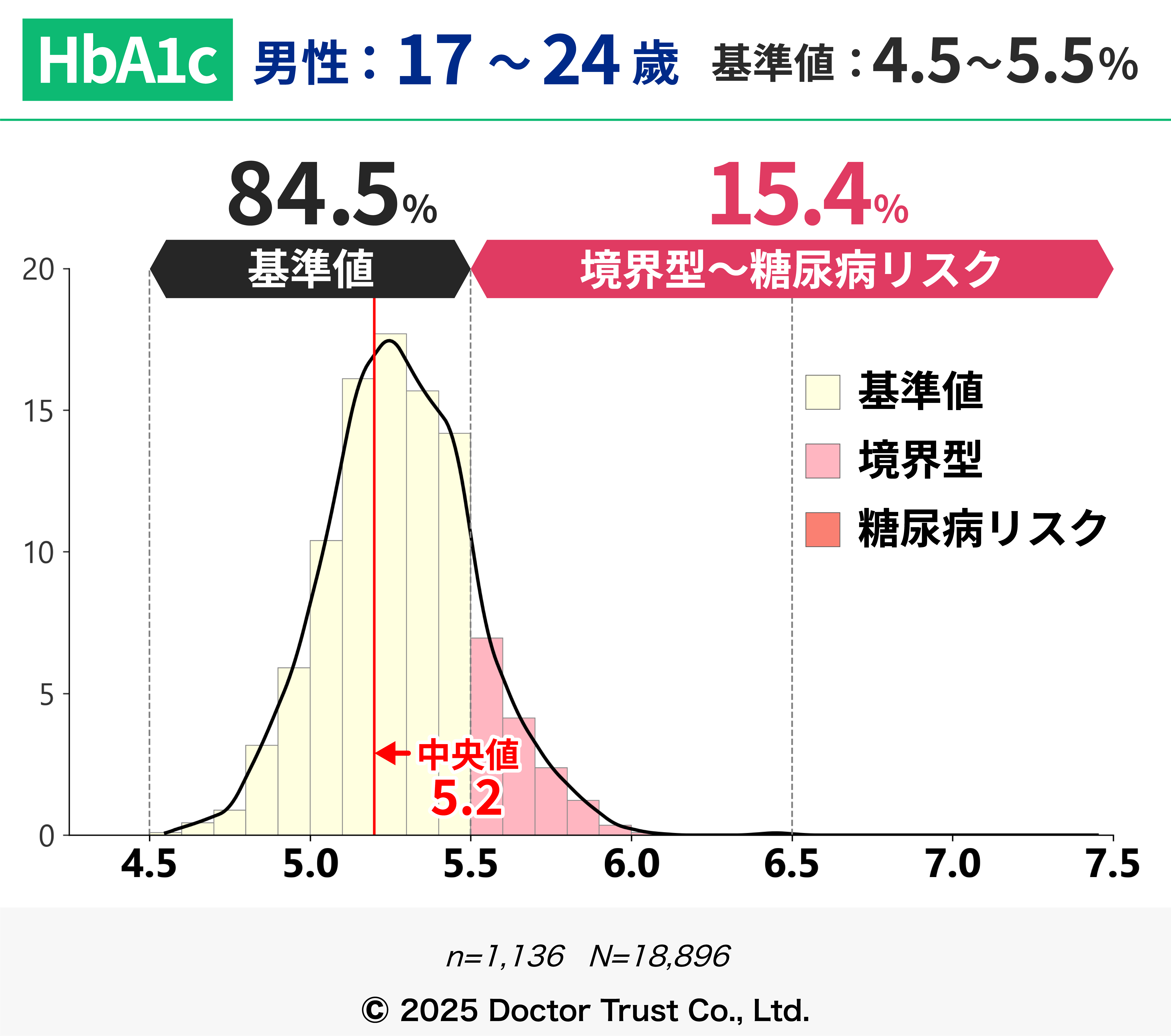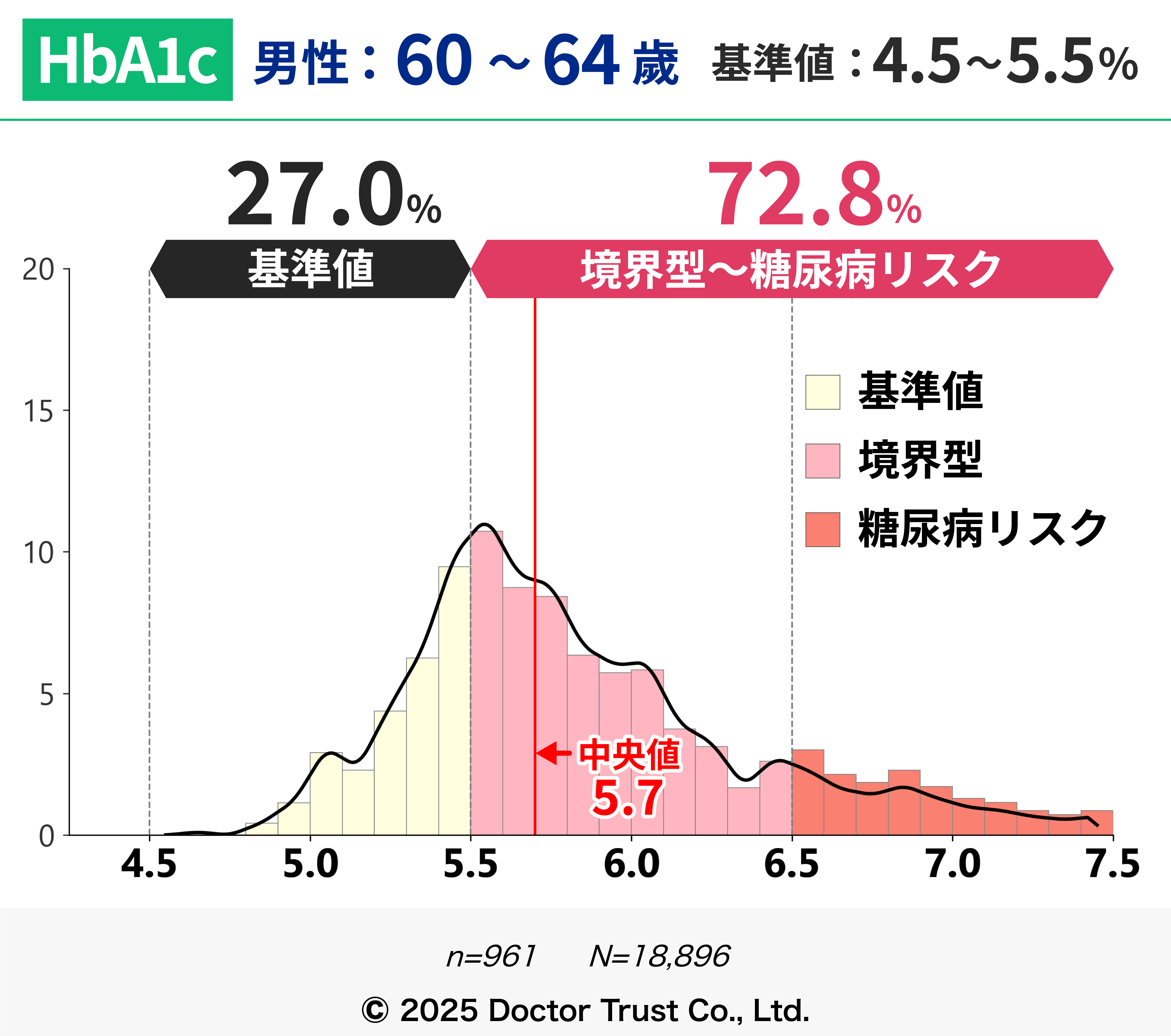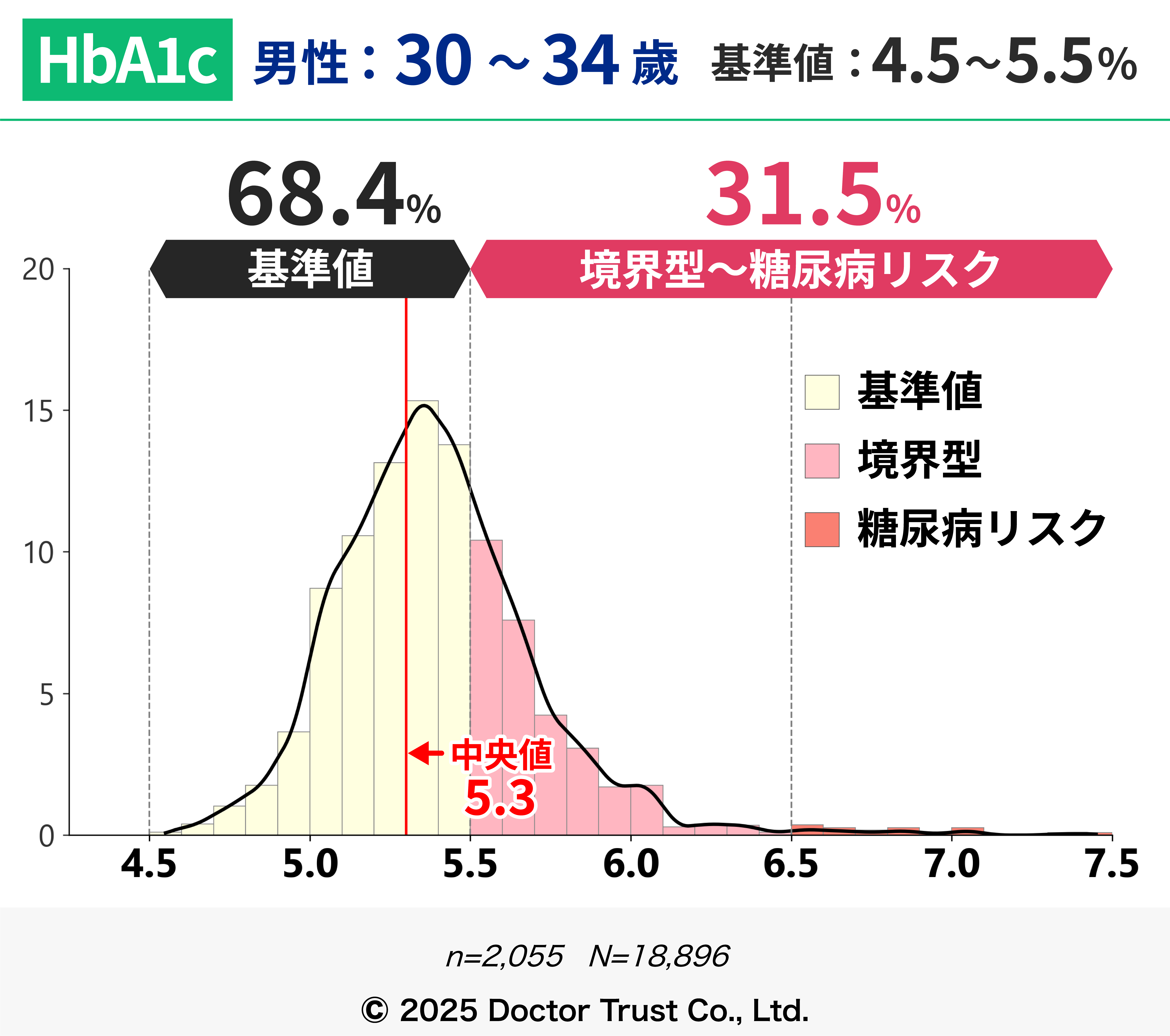 45歳を超えると、境界型~糖尿病リスクの方が51.6%となり、基準値内に収まっている割合の方が少ない結果です。