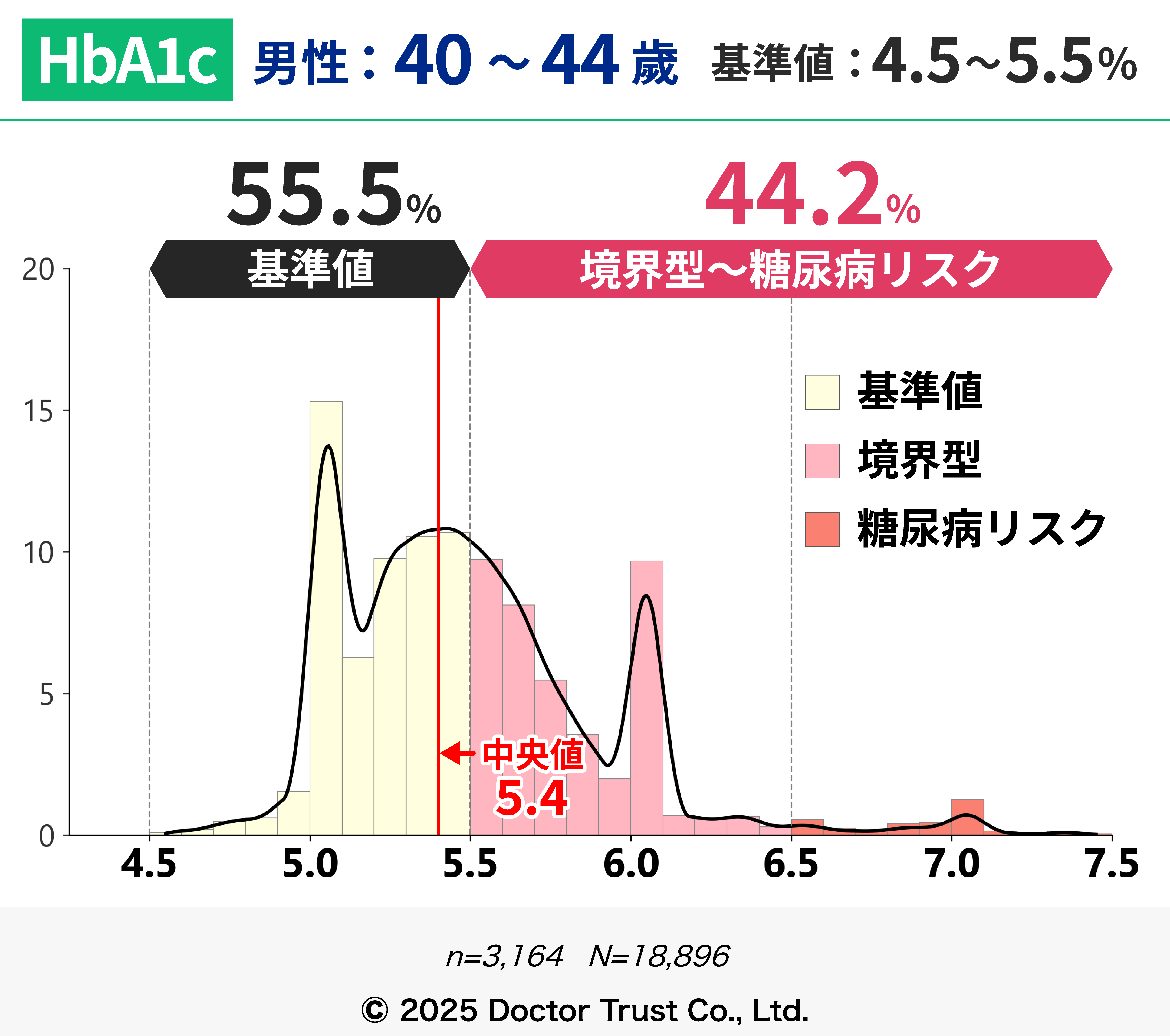 境界型~糖尿病リスクの割合に着目すると、特定保健指導が始まる40~44歳では44%と高い結果です。