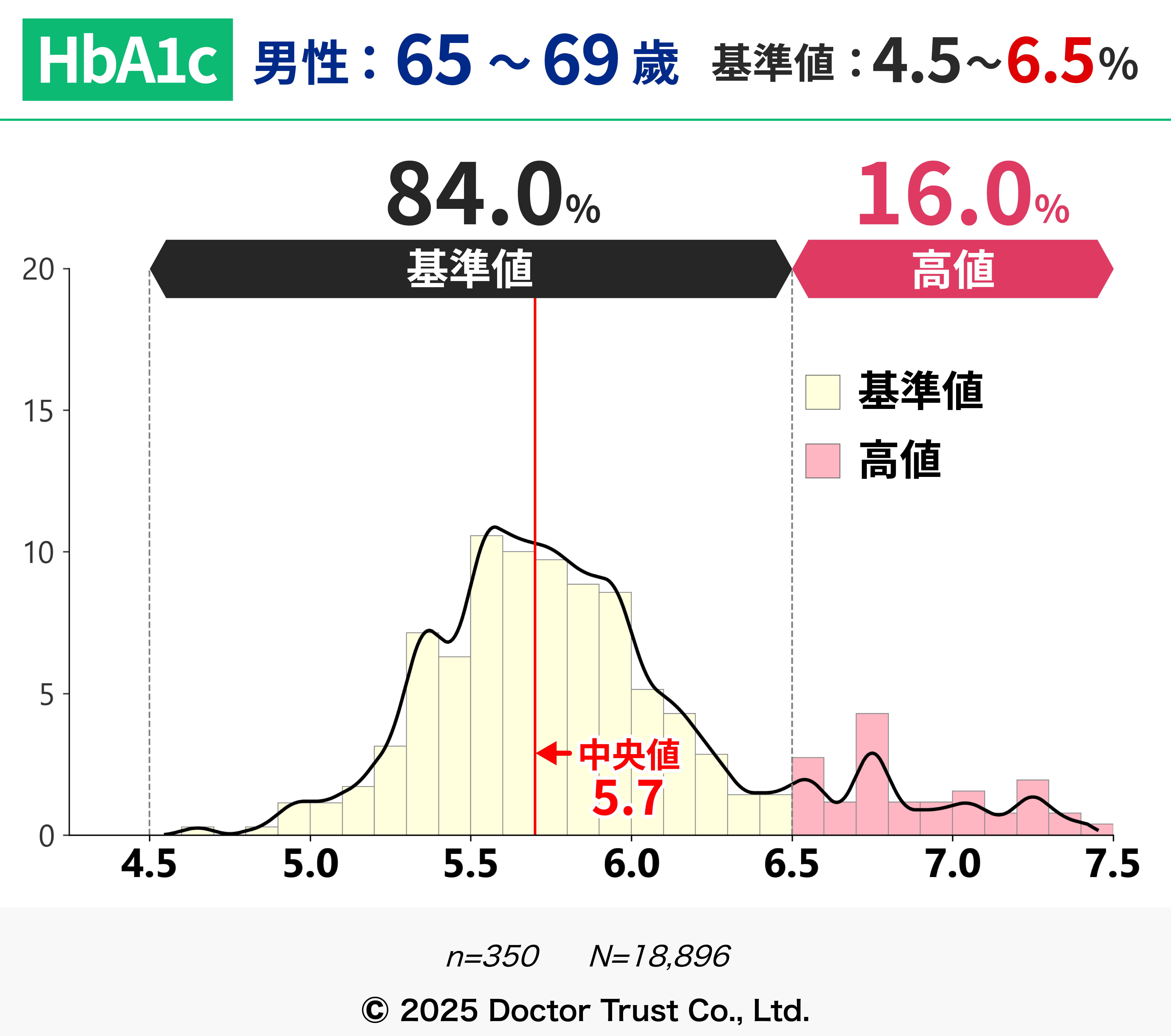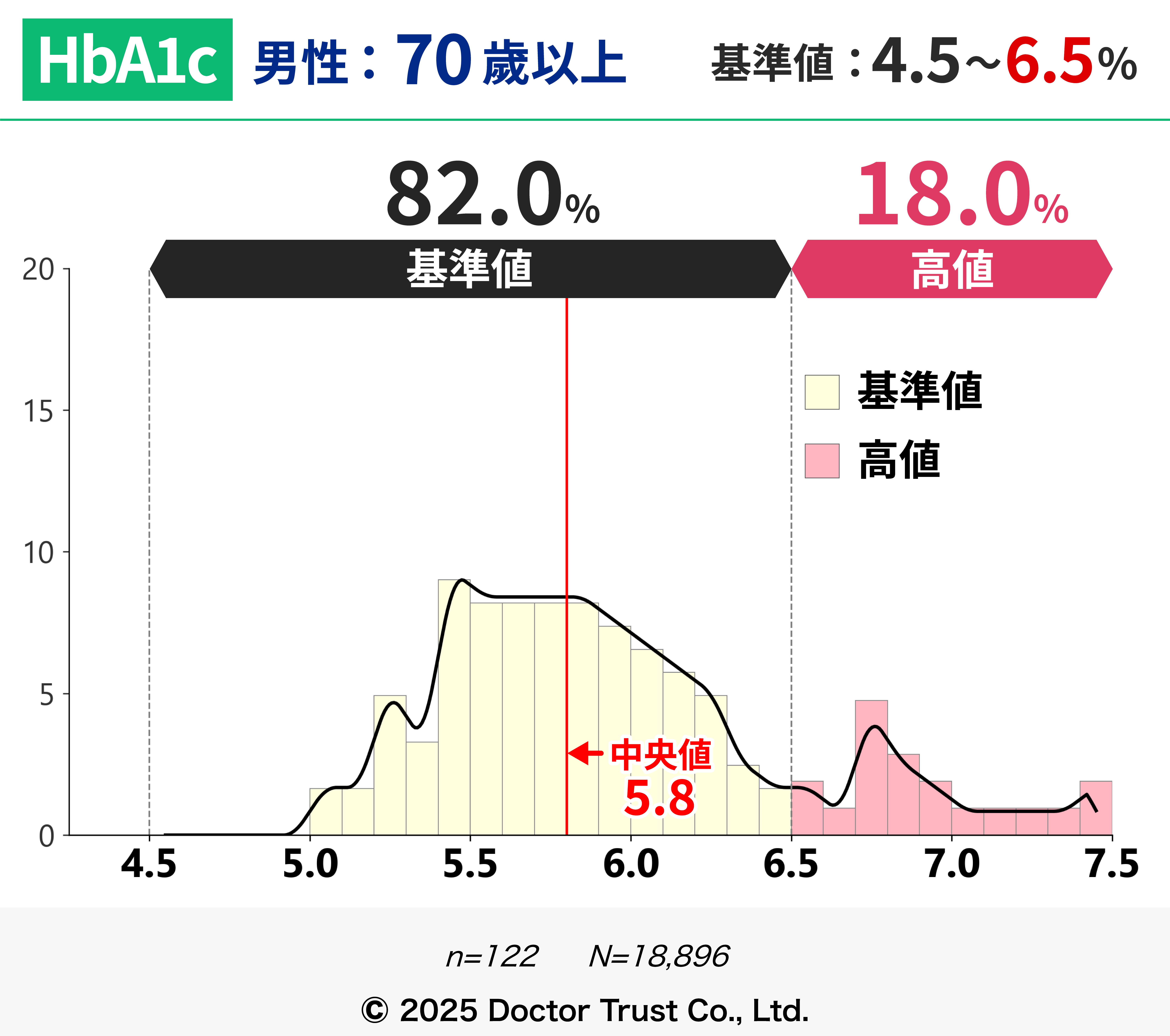 赤血球中のたんぱく質である「ヘモグロビン」にグルコース(ブドウ糖)が結合した割合を示します。赤血球のターンオーバーは約120日と言われ、長期(1〜2か月)の糖摂取を反映するため、血糖管理の経過指標として重要視されます(NGSP値)。