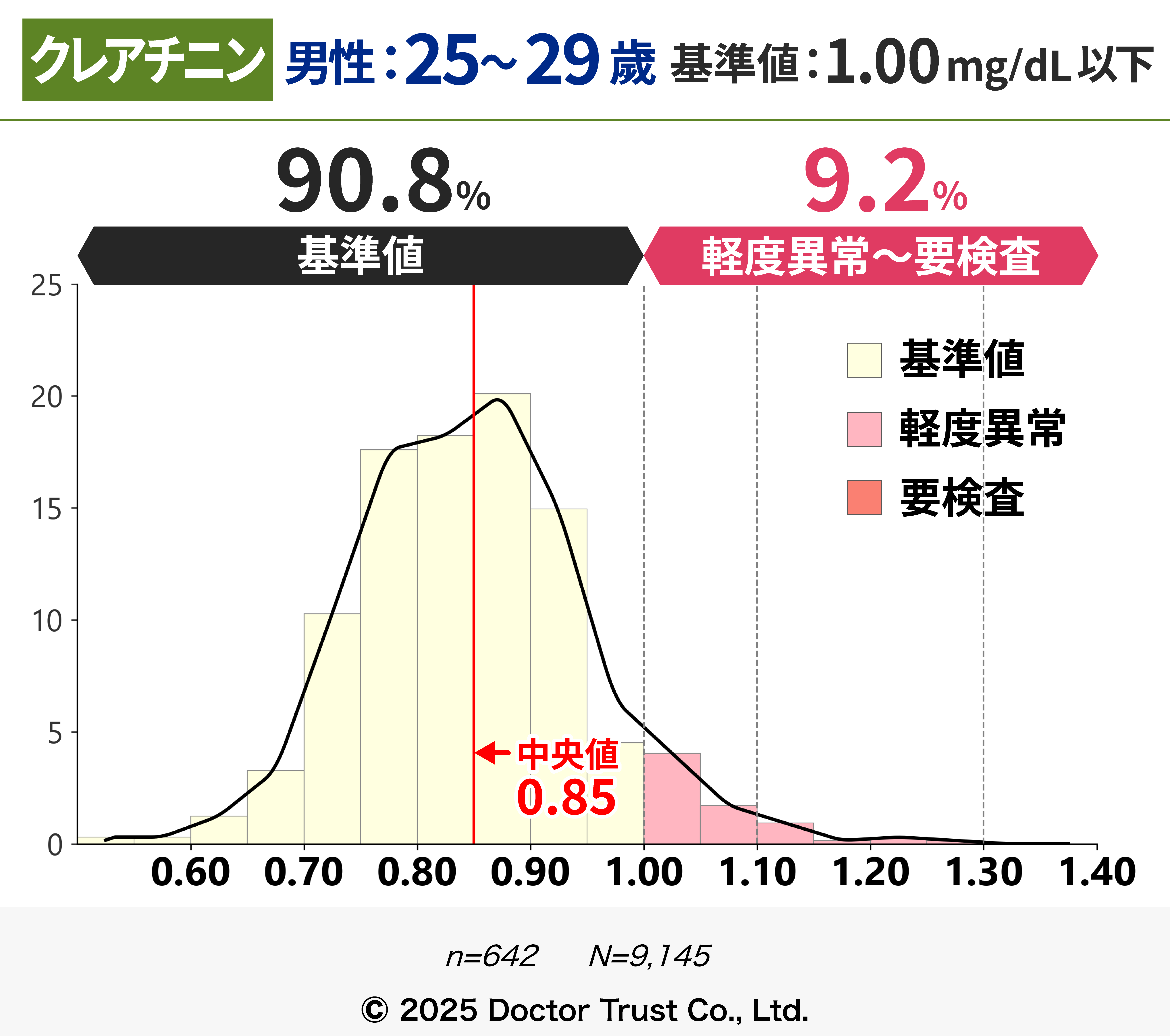 しかし、筋肉量が多い場合にも数値が高くなる傾向があるため、年齢や性別からクレアチニン値を補正したeGFRの結果も併せて見るようにしましょう。