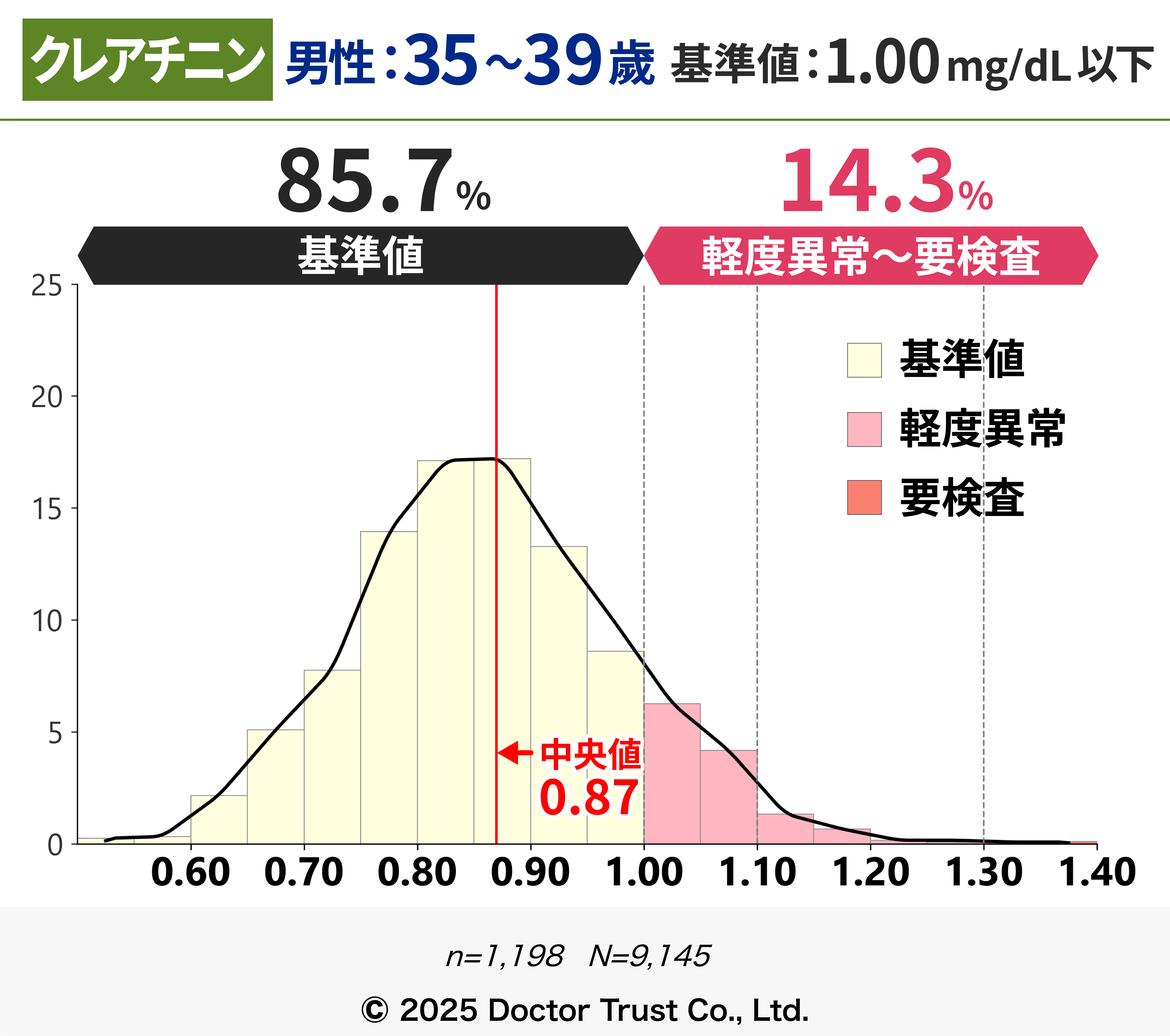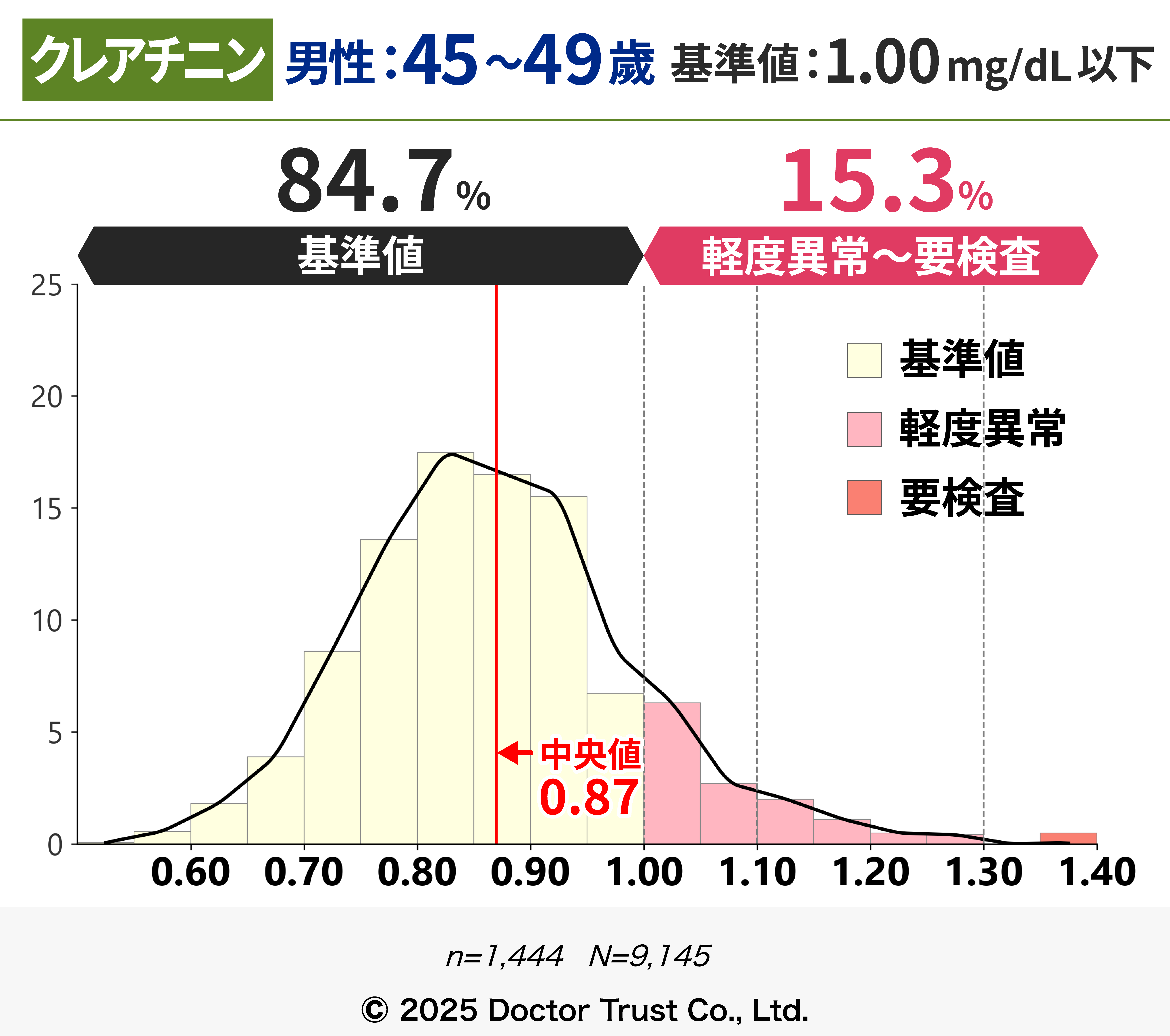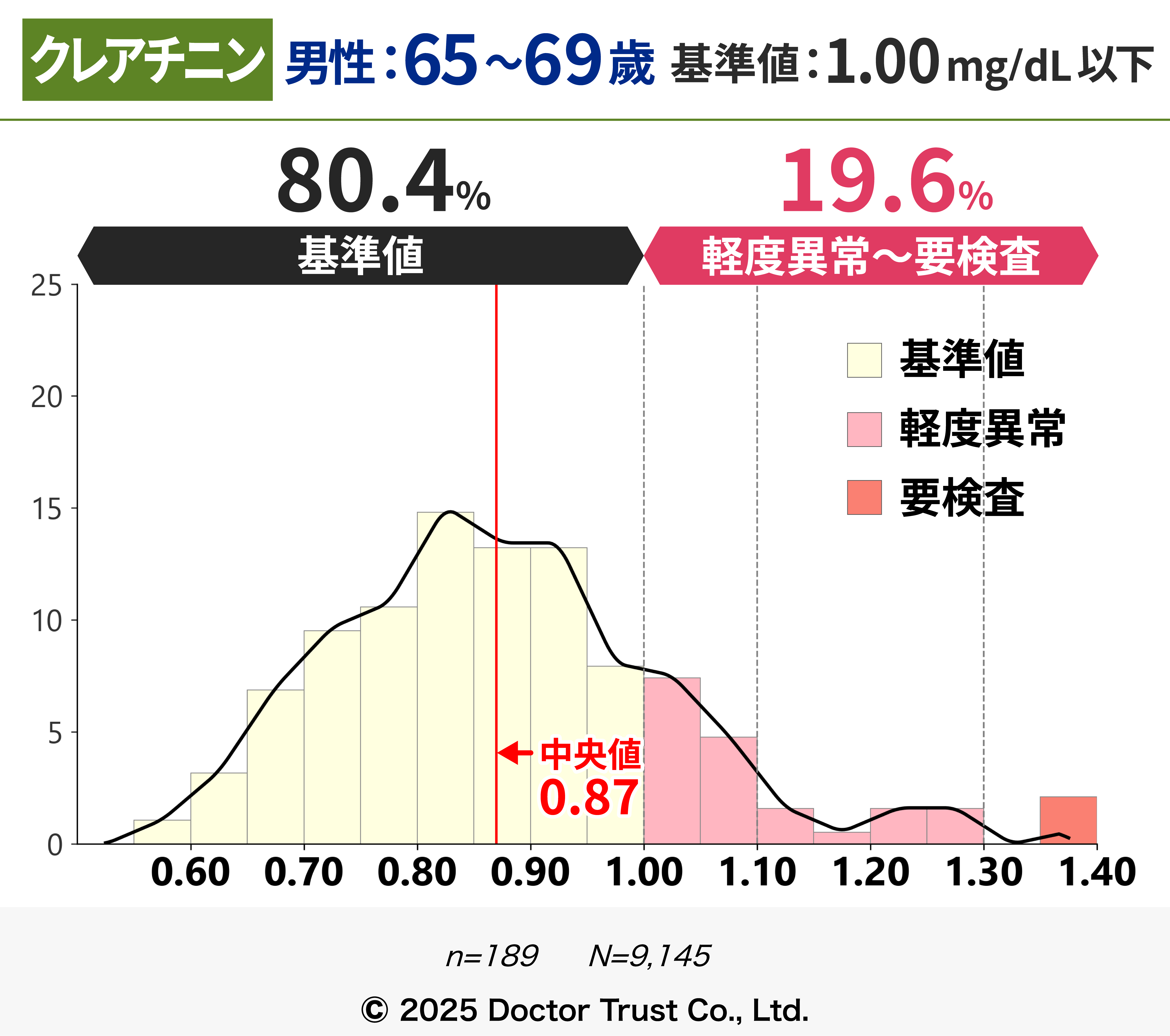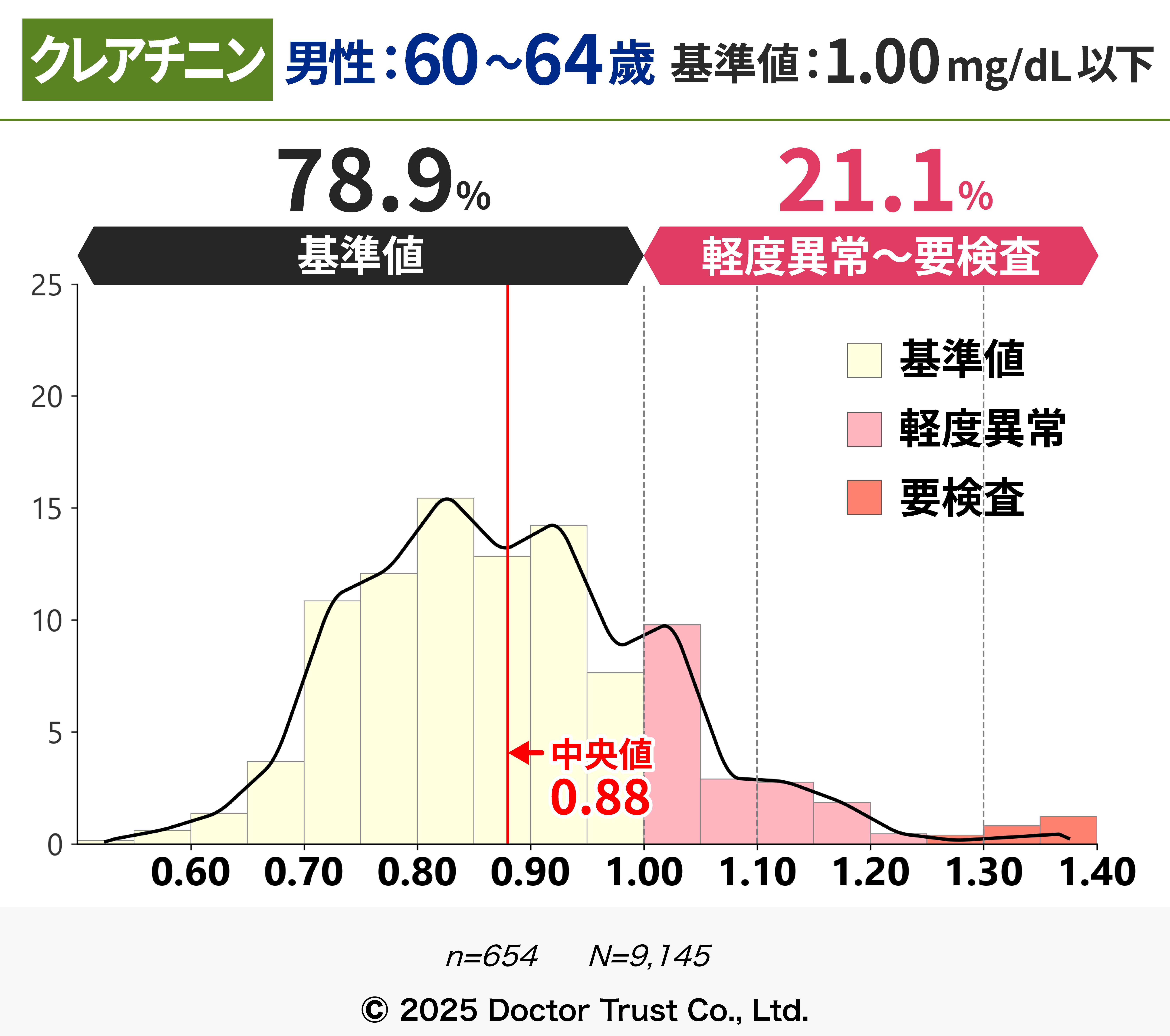 軽度異常~要検査の割合が20%を超えることから、50代以降は腎機能にも着目する必要があります。