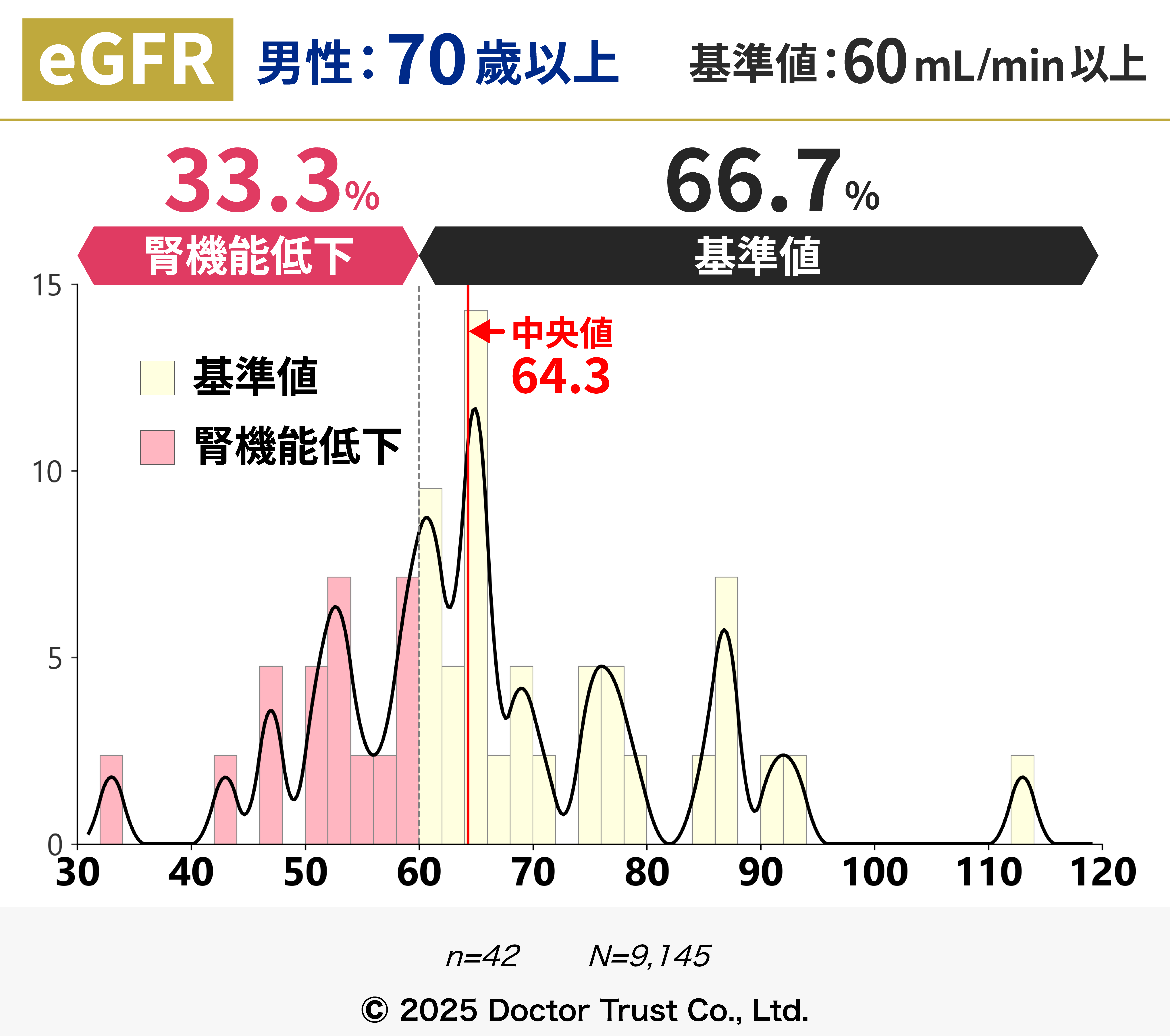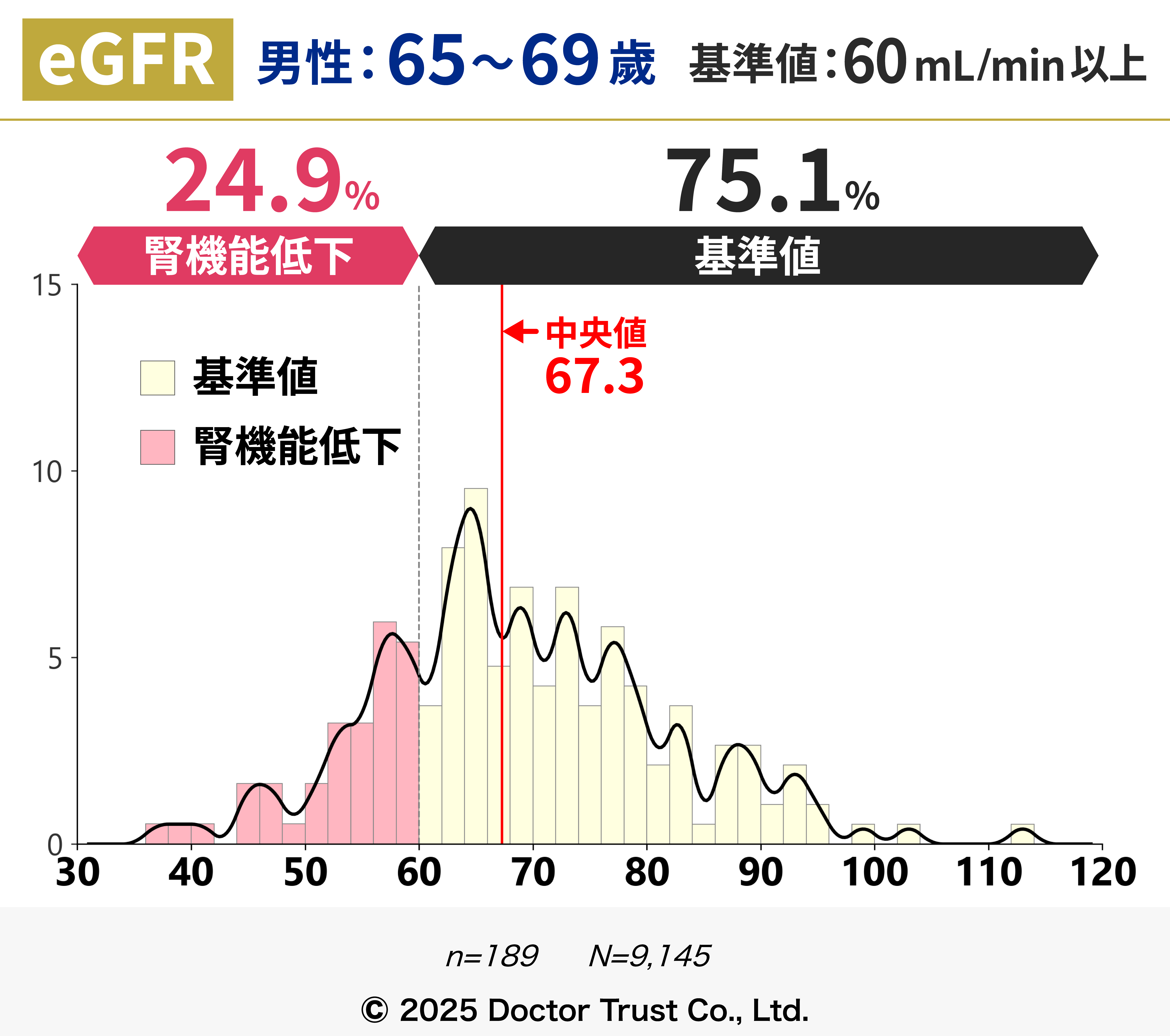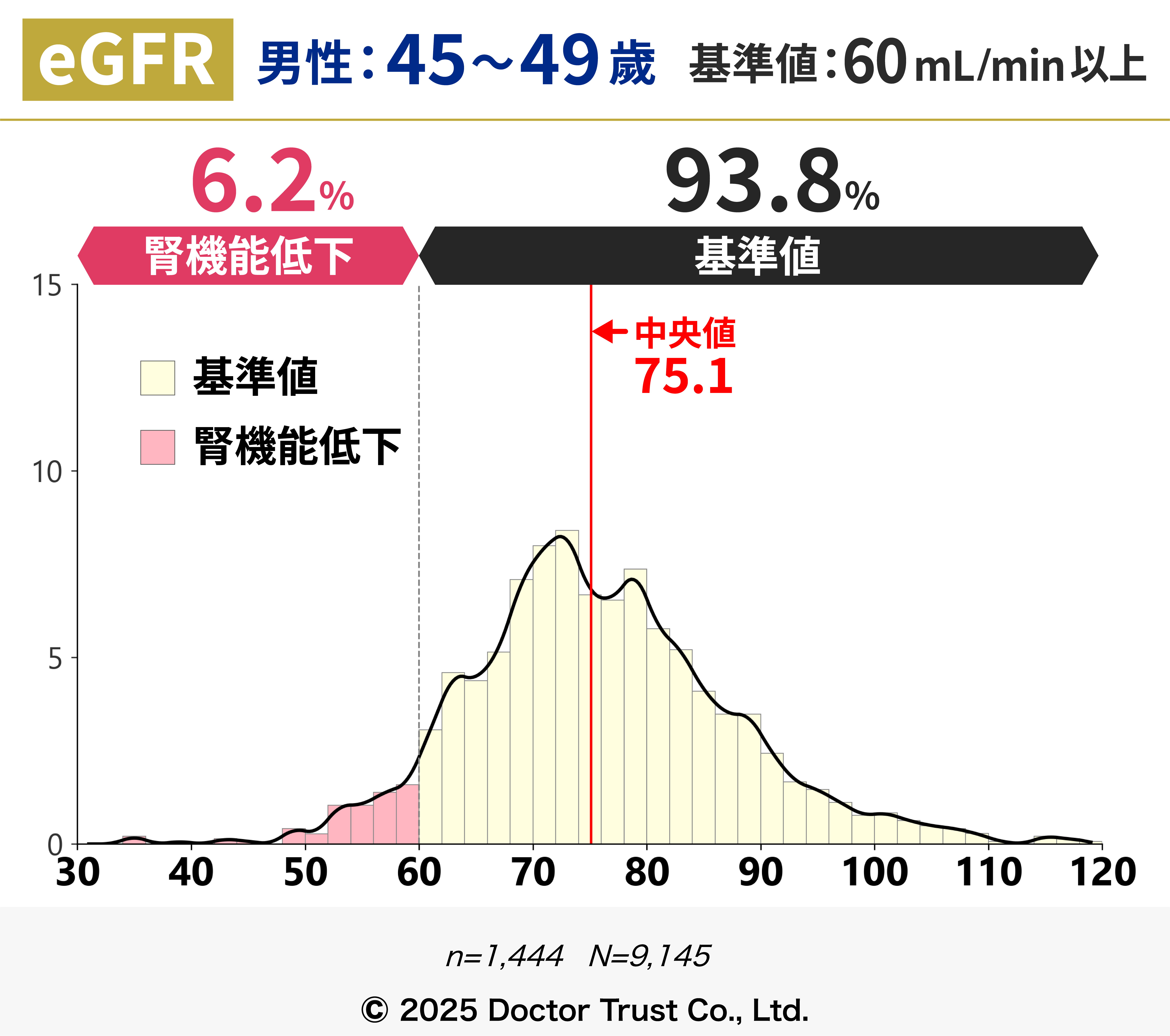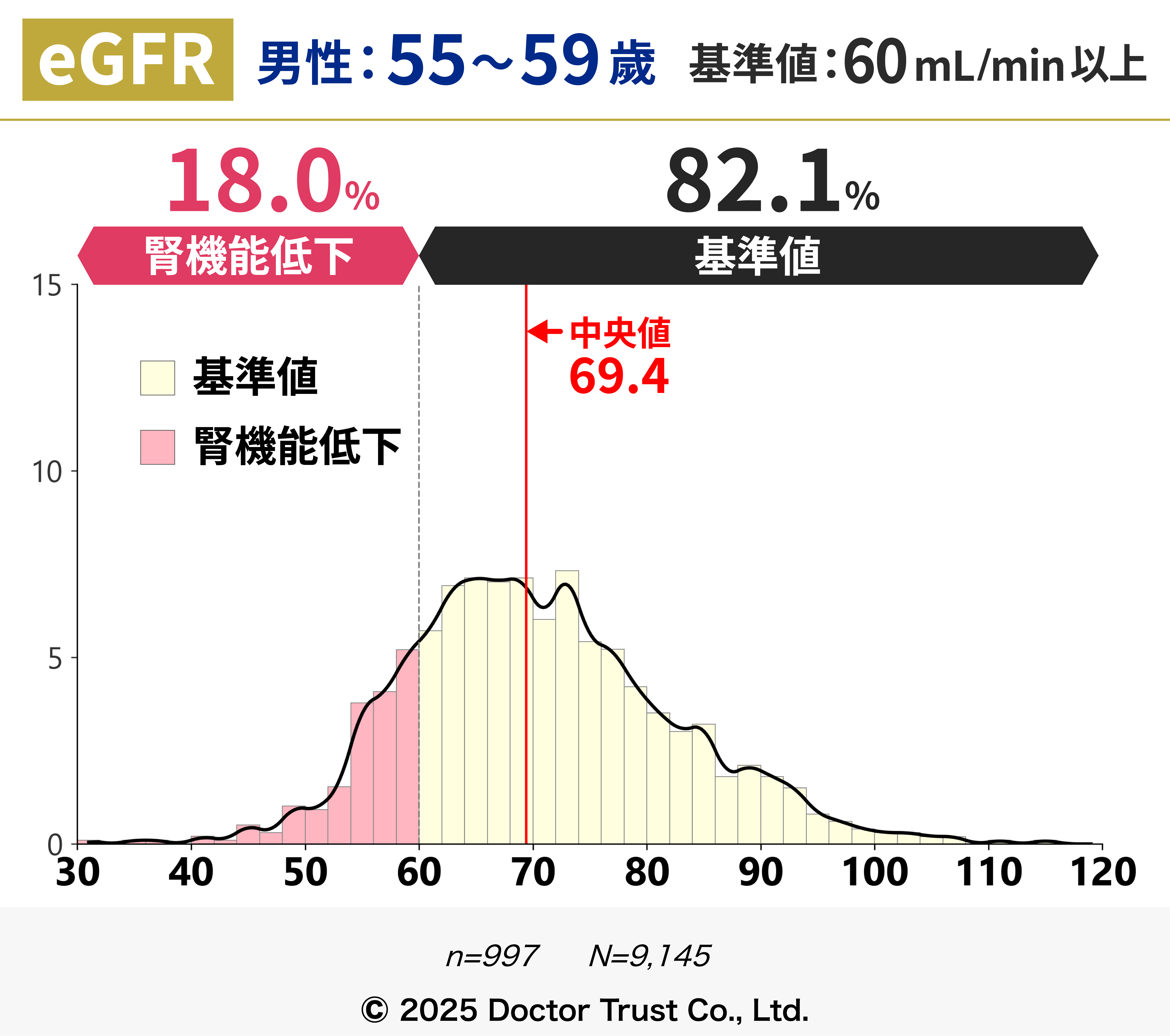 クレアチニン値をもとに腎臓の糸球体が血液を濾過する能力を推算した値です。クレアチニン基準値は男女で異なるため、計算方法には性別補正が入っています。男女ともに、60未満を示すと、腎機能低下と評価されます。