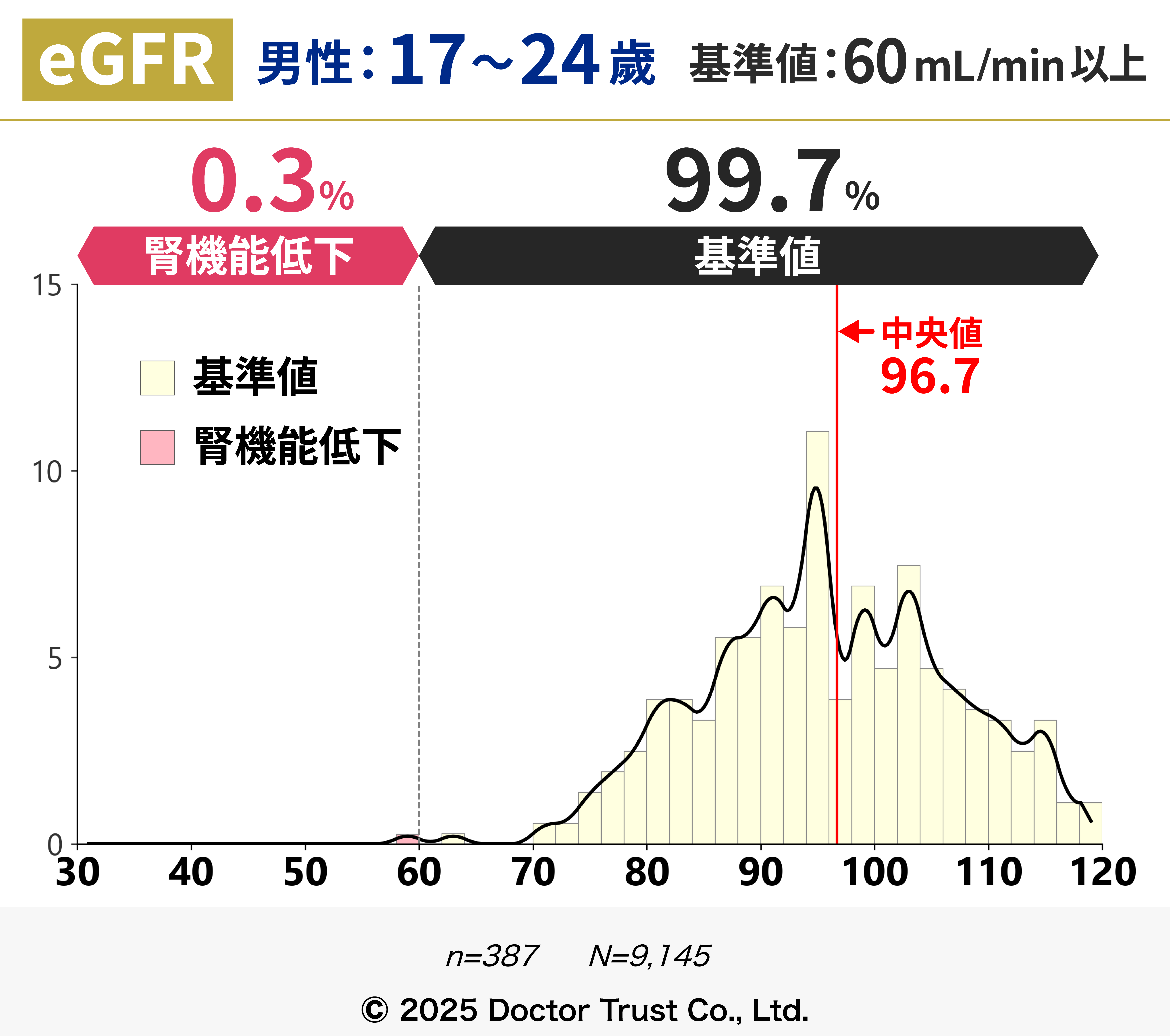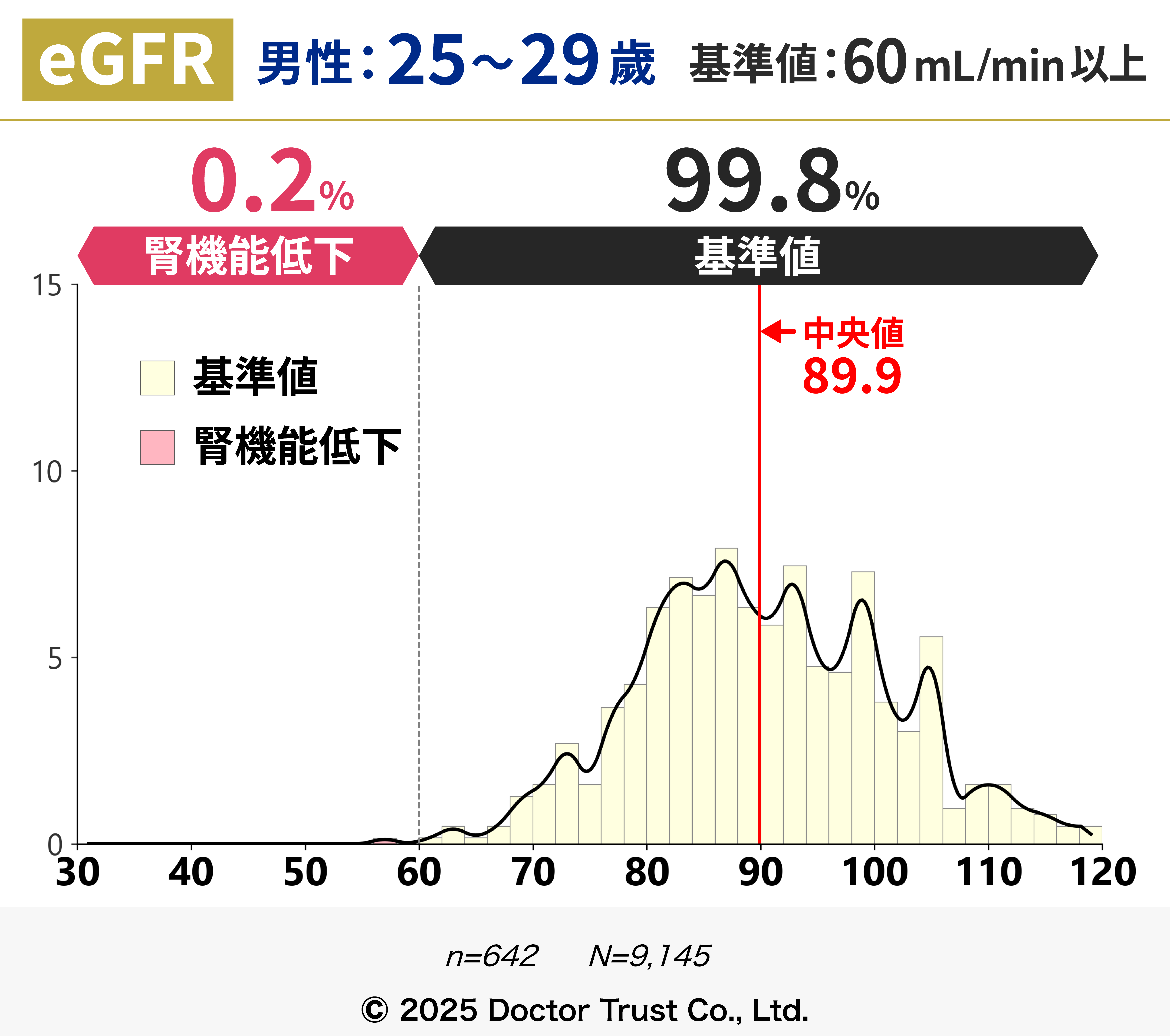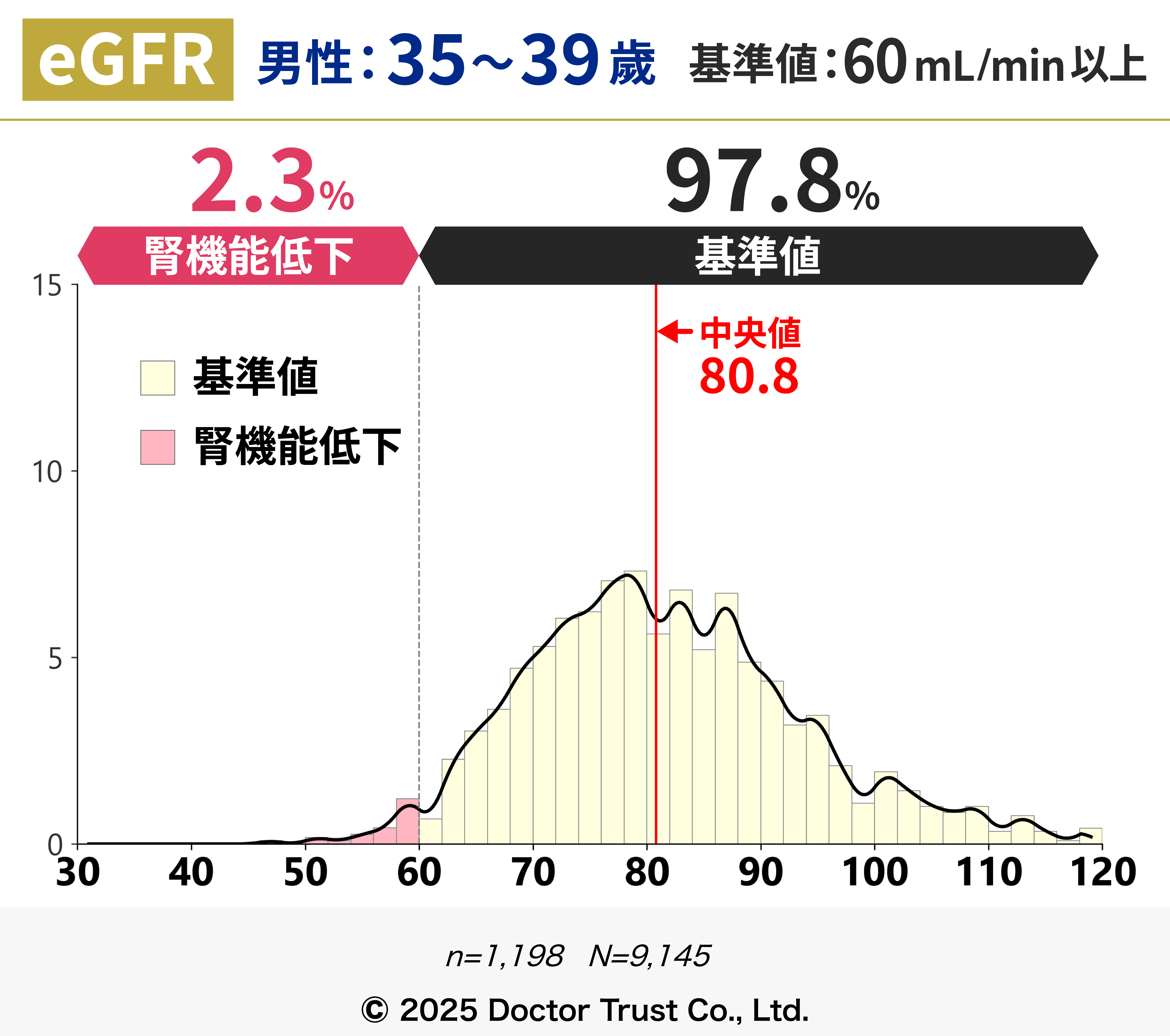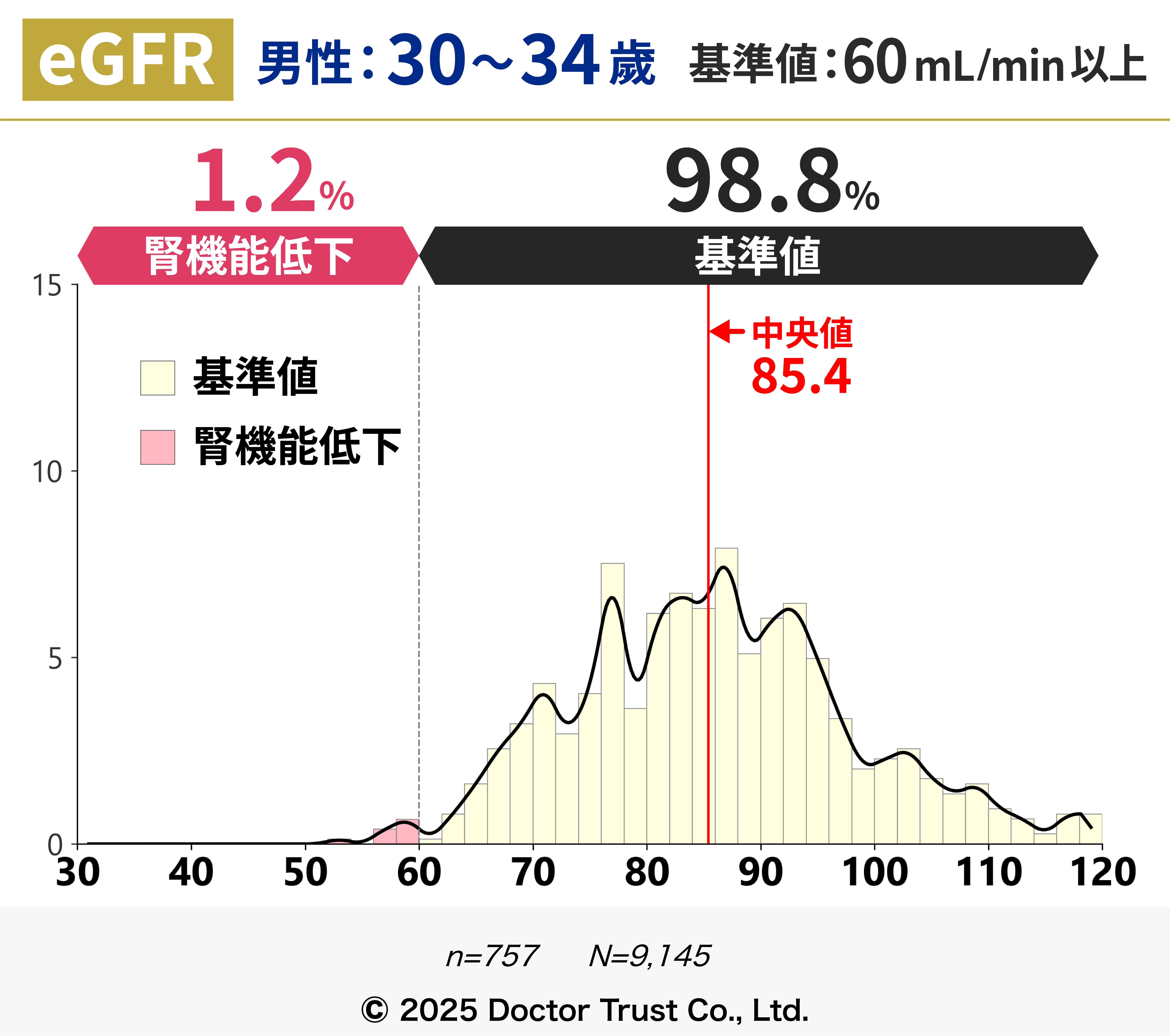 クレアチニン値をもとに腎臓の糸球体が血液を濾過する能力を推算した値です。クレアチニン基準値は男女で異なるため、計算方法には性別補正が入っています。男女ともに、60未満を示すと、腎機能低下と評価されます。