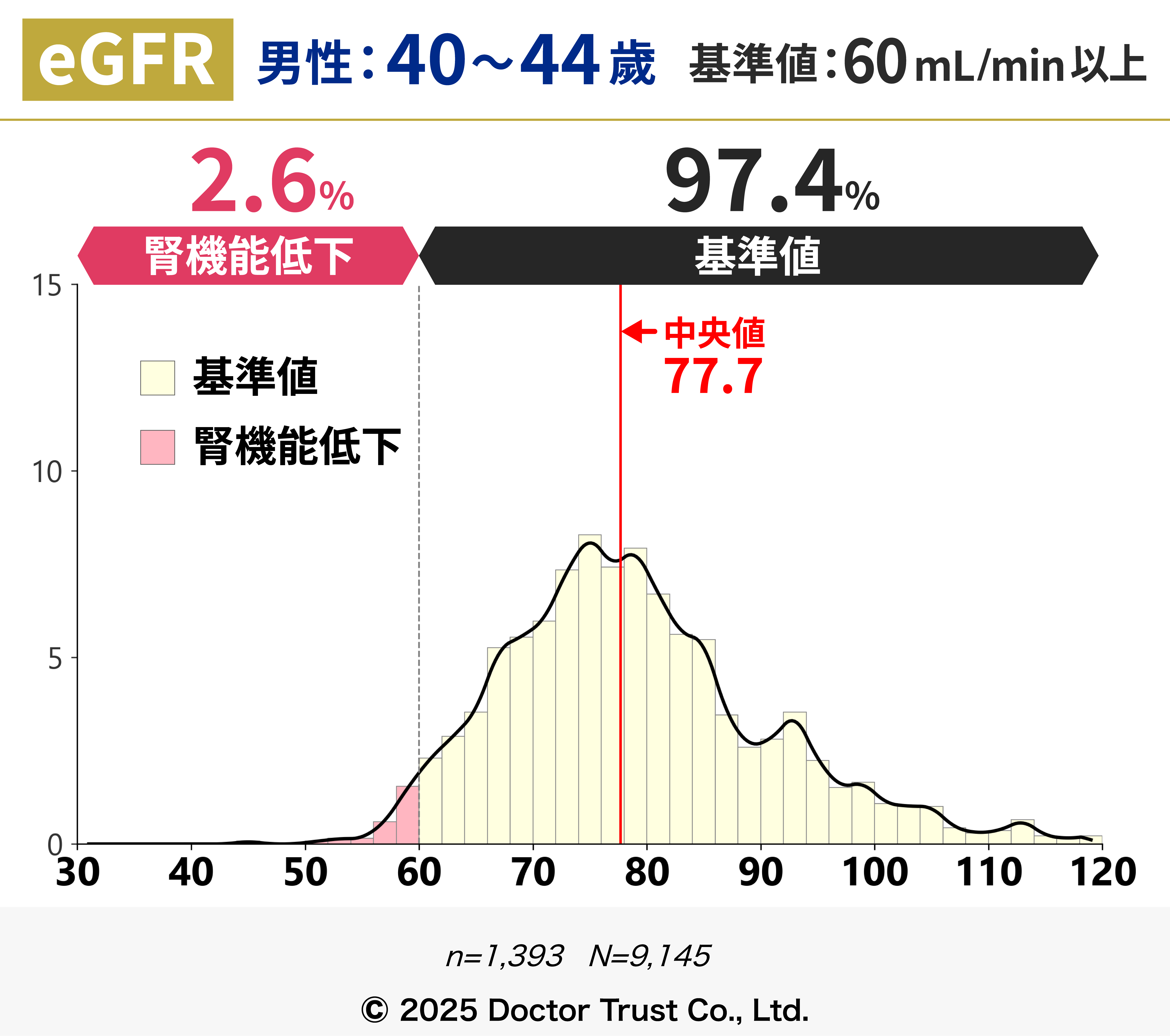 腎機能は一度悪くなると良くなりませんが、40代後半から急速に腎機能低下の割合が増えていることがわかります。