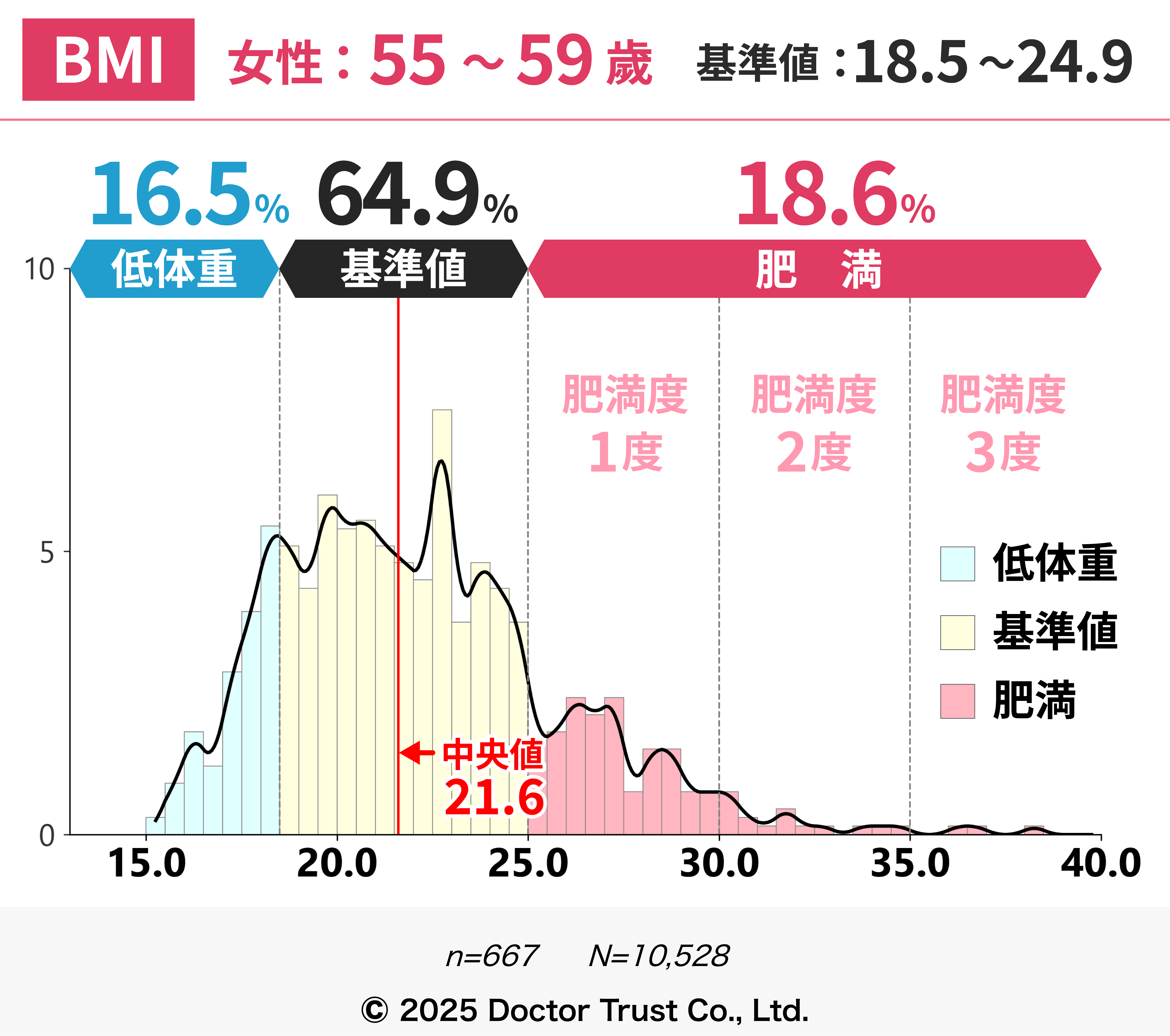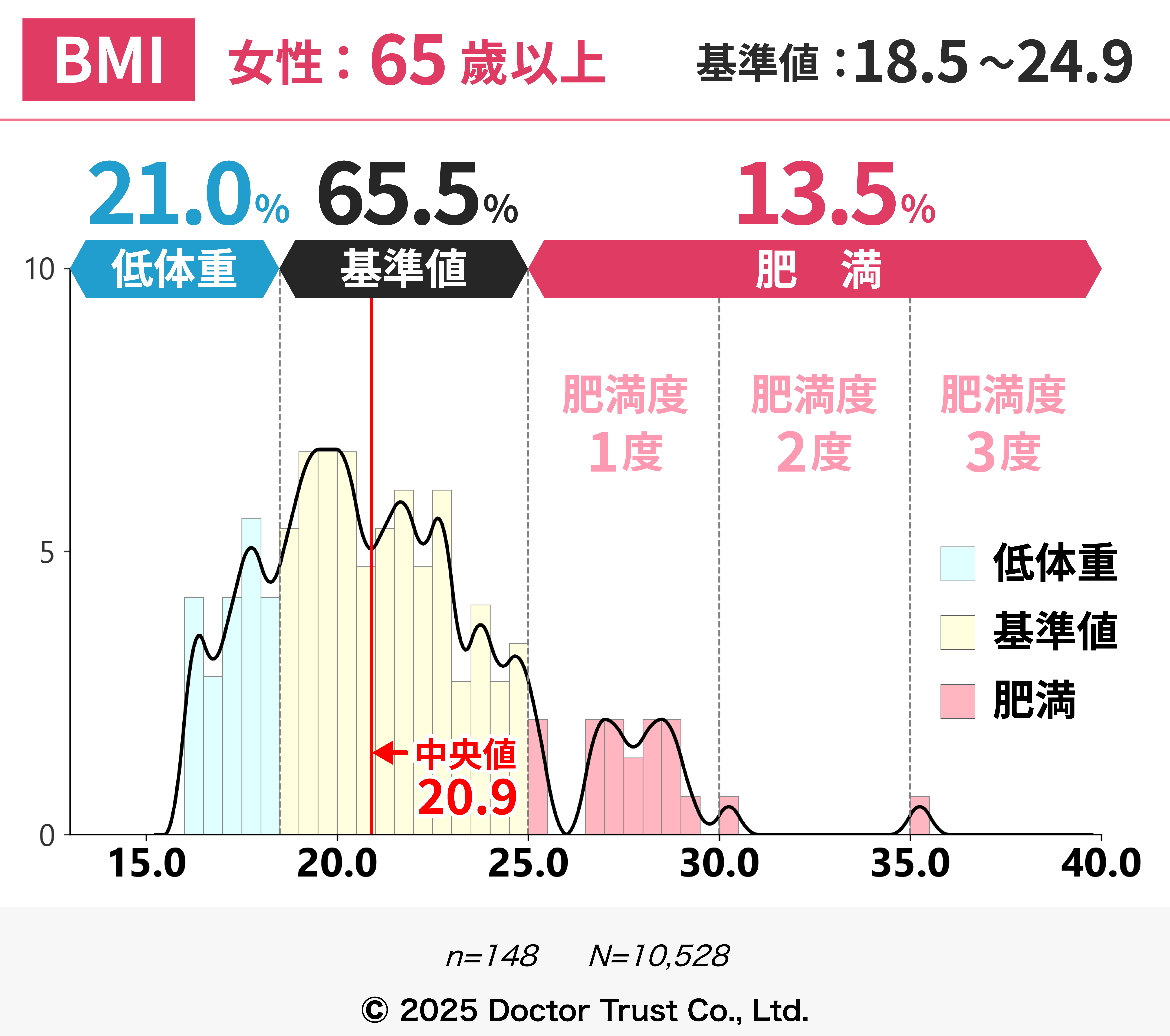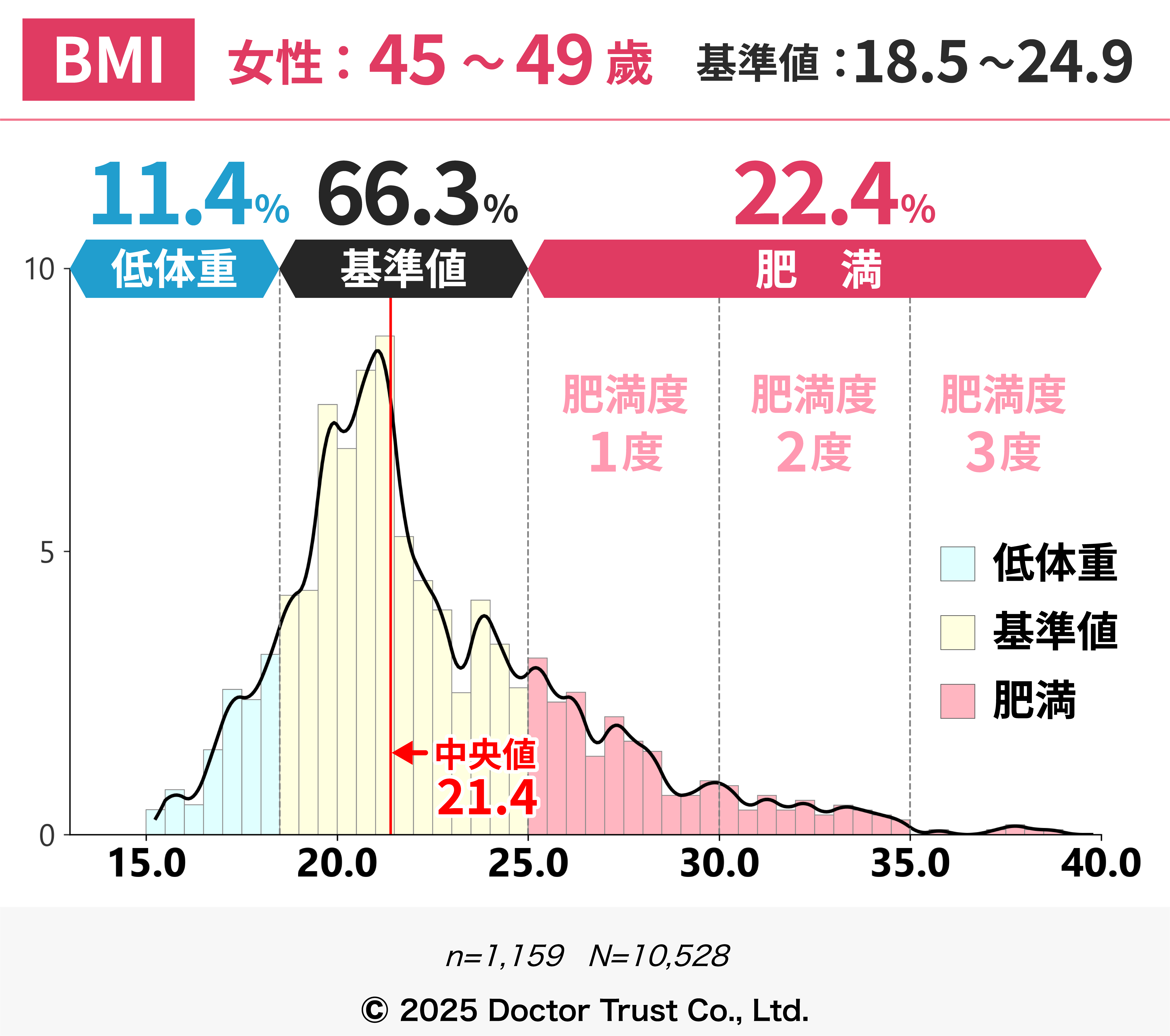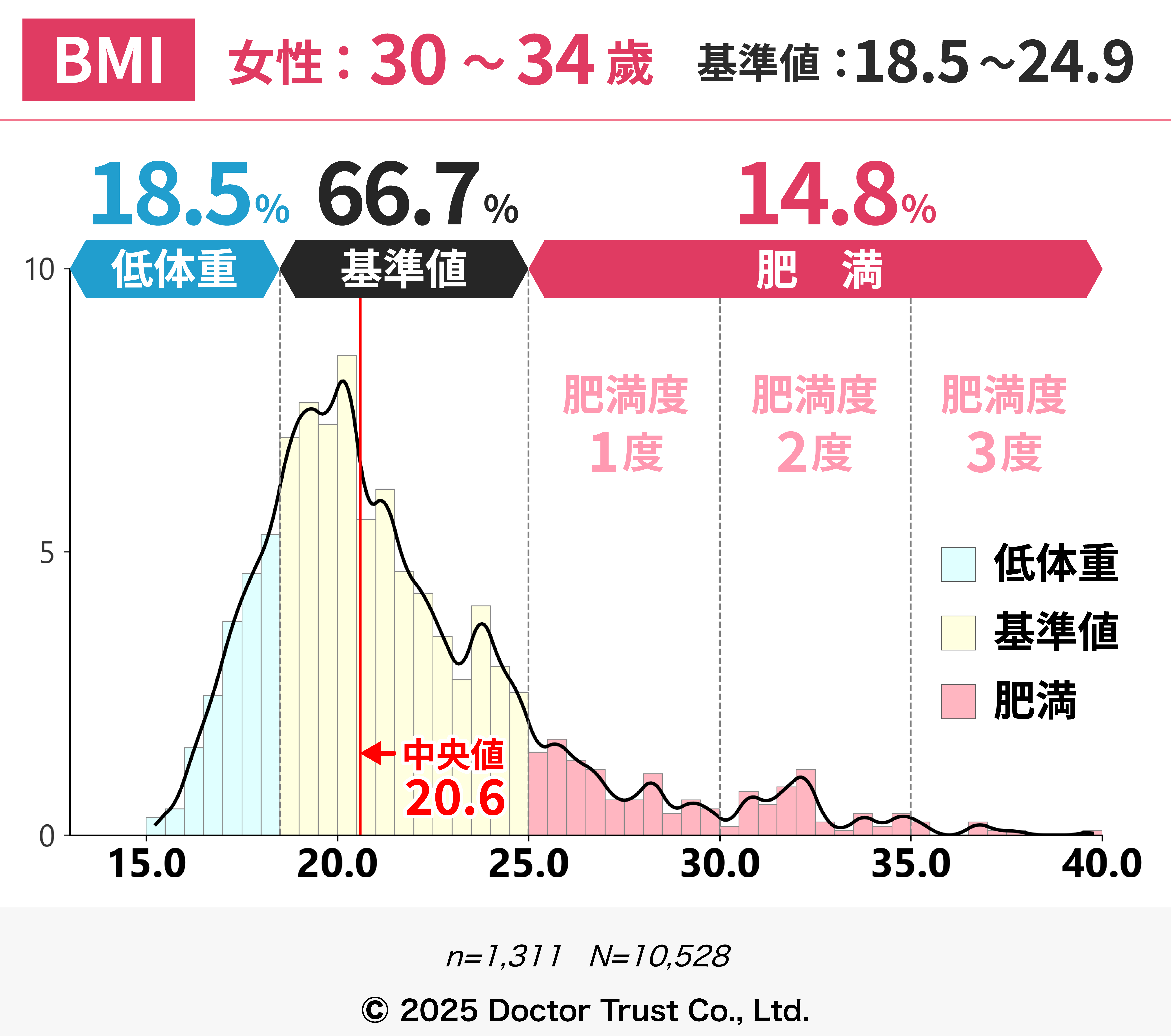 一方で基準値以下ではやせすぎと判断されます。女性の低体重者の割合の多さが気になります。