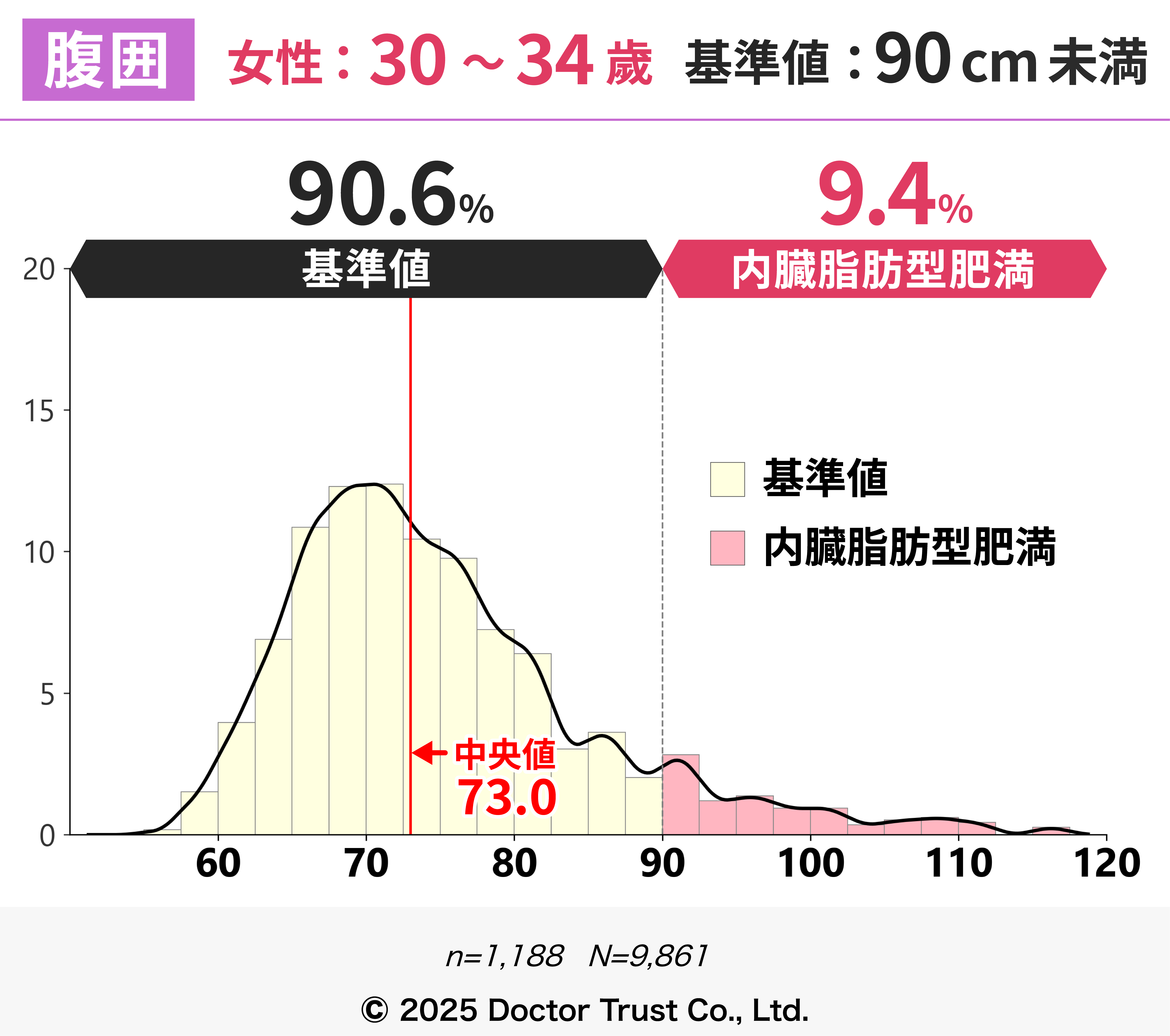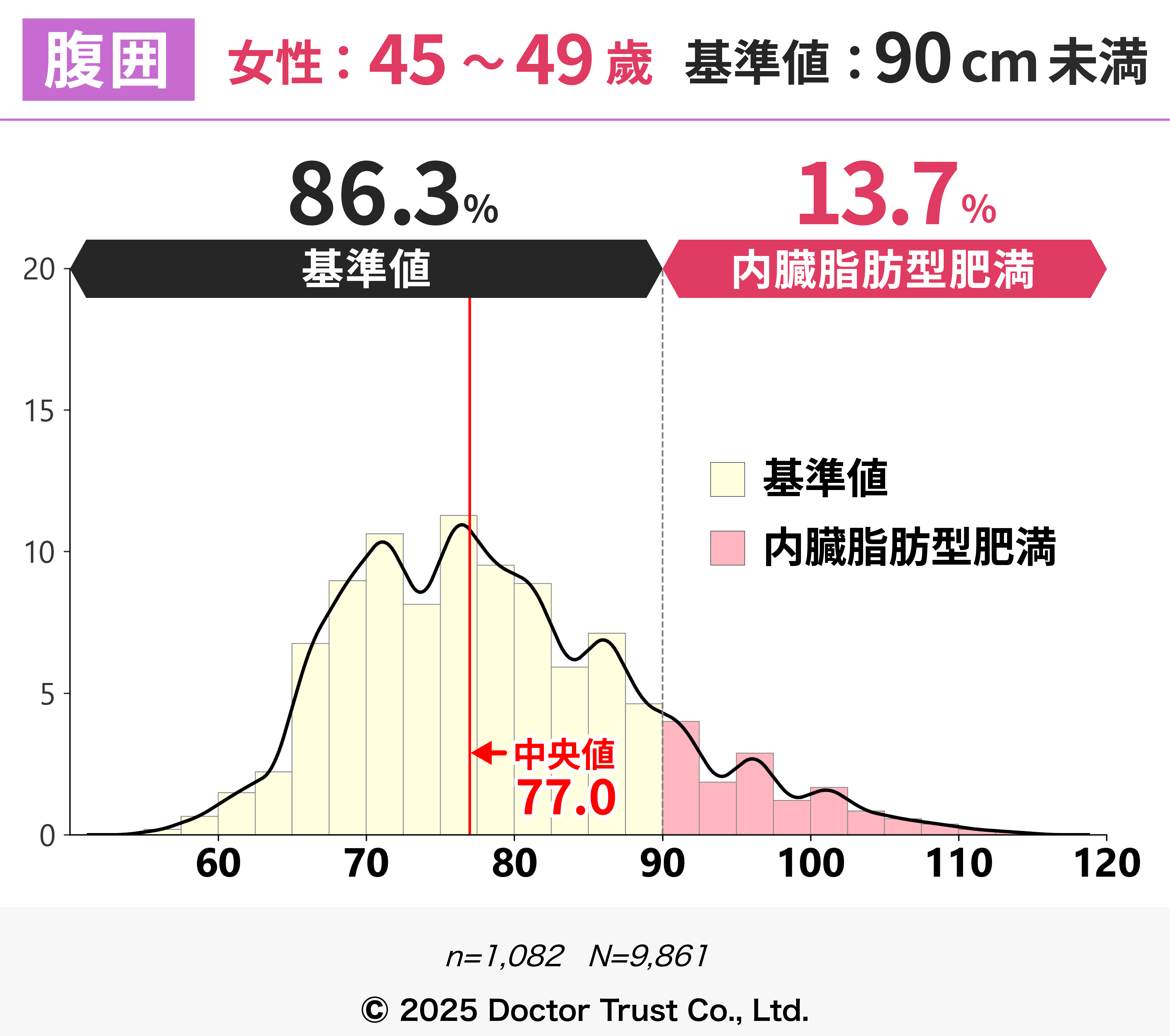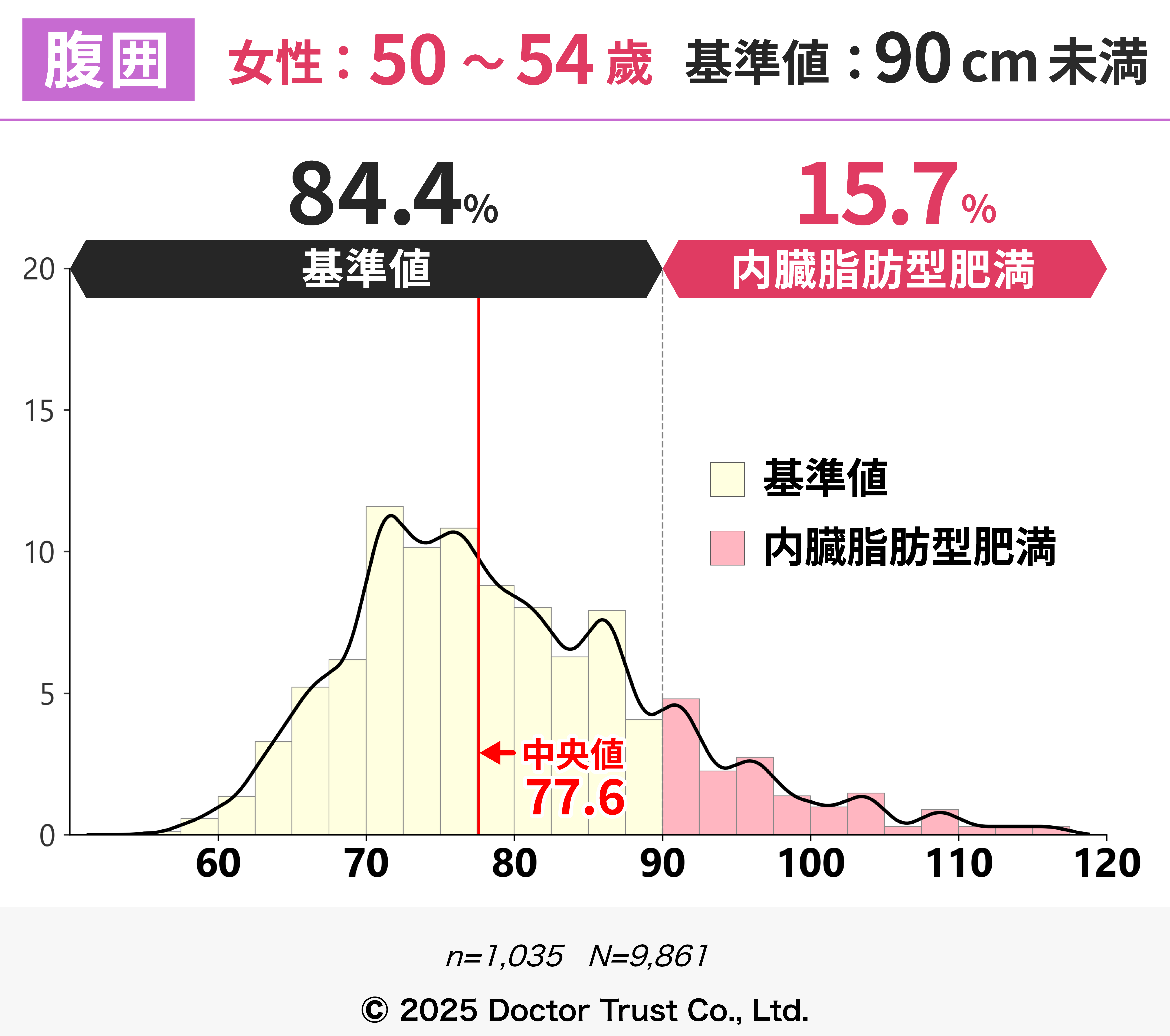 この年代から、内臓脂肪型肥満の人が増えているのがわかります。年齢とともに代謝が落ちてくるので注意が必要です。