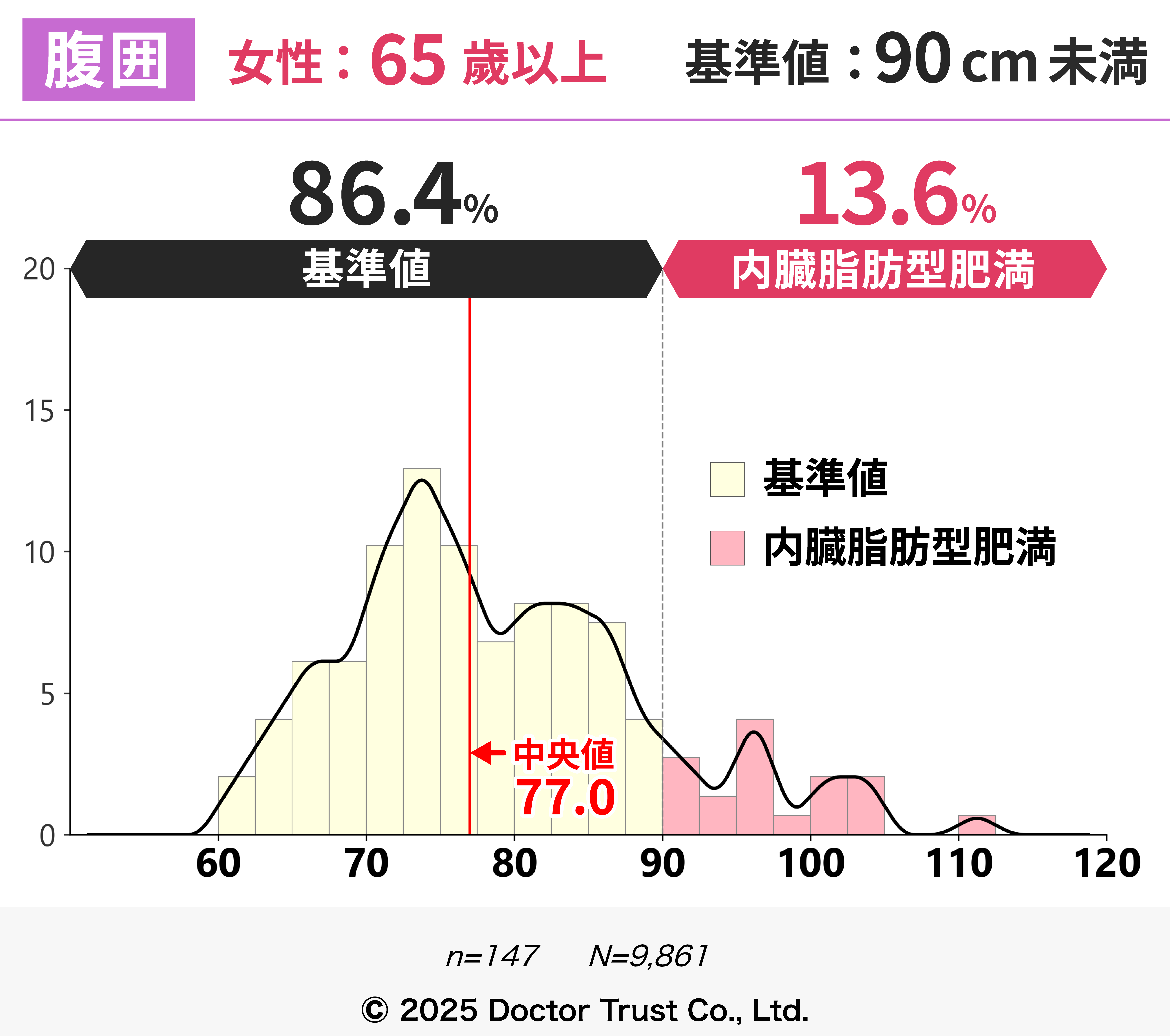 臍の高さの腹囲を測ります。内臓脂肪の量を推定する指標とされます。女性は皮下脂肪があるため、男性よりも5cm基準が高くなっています。
