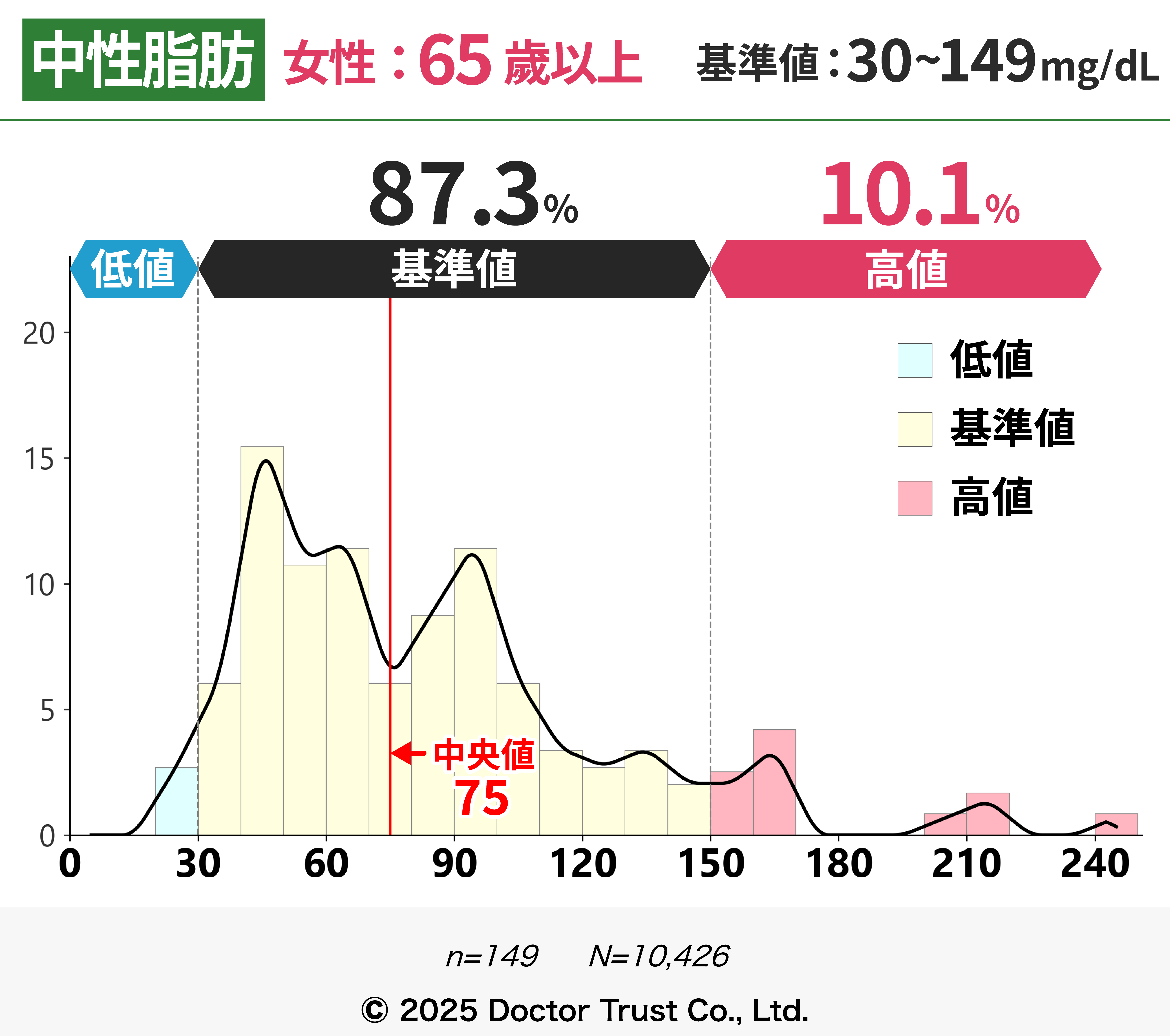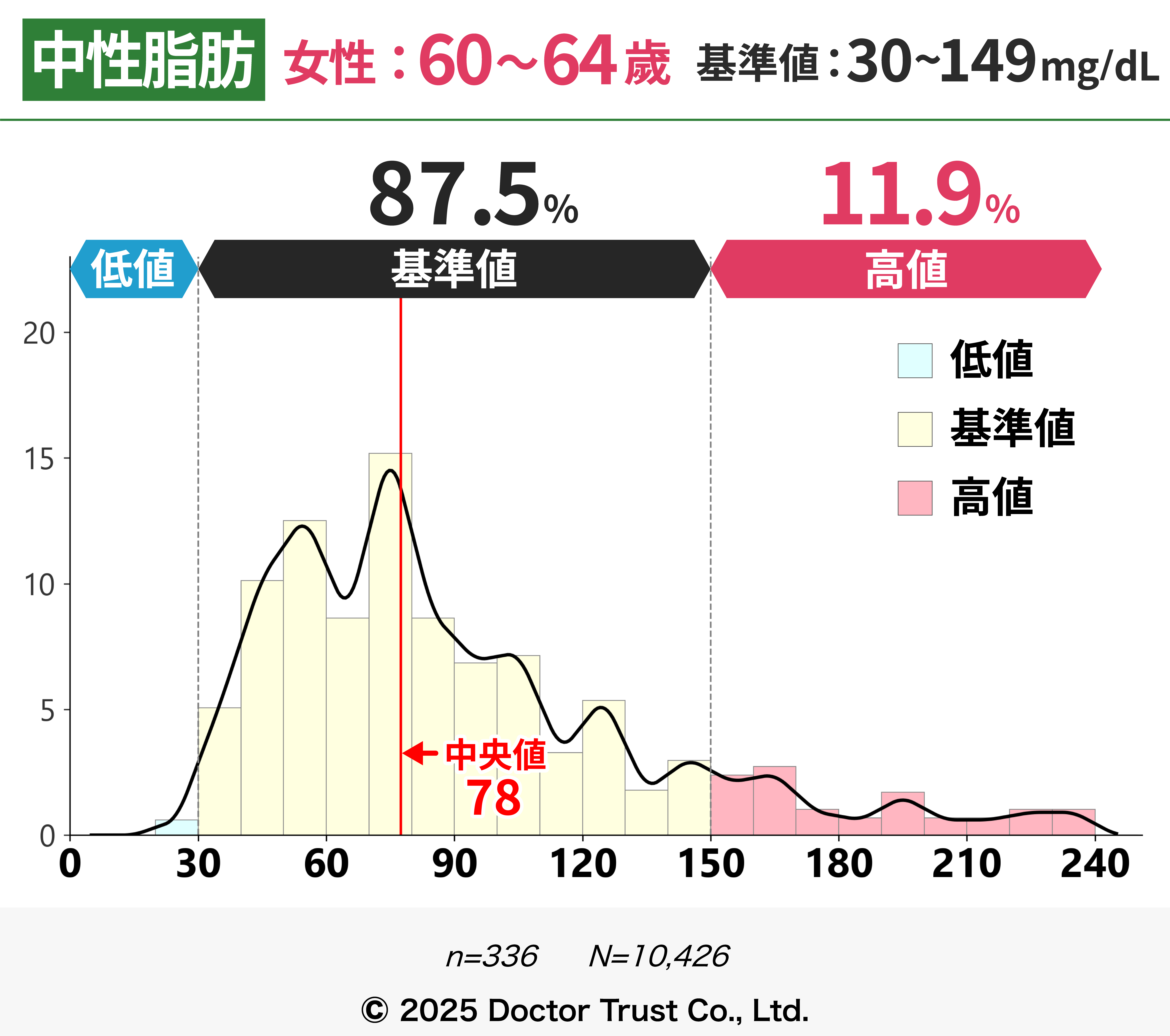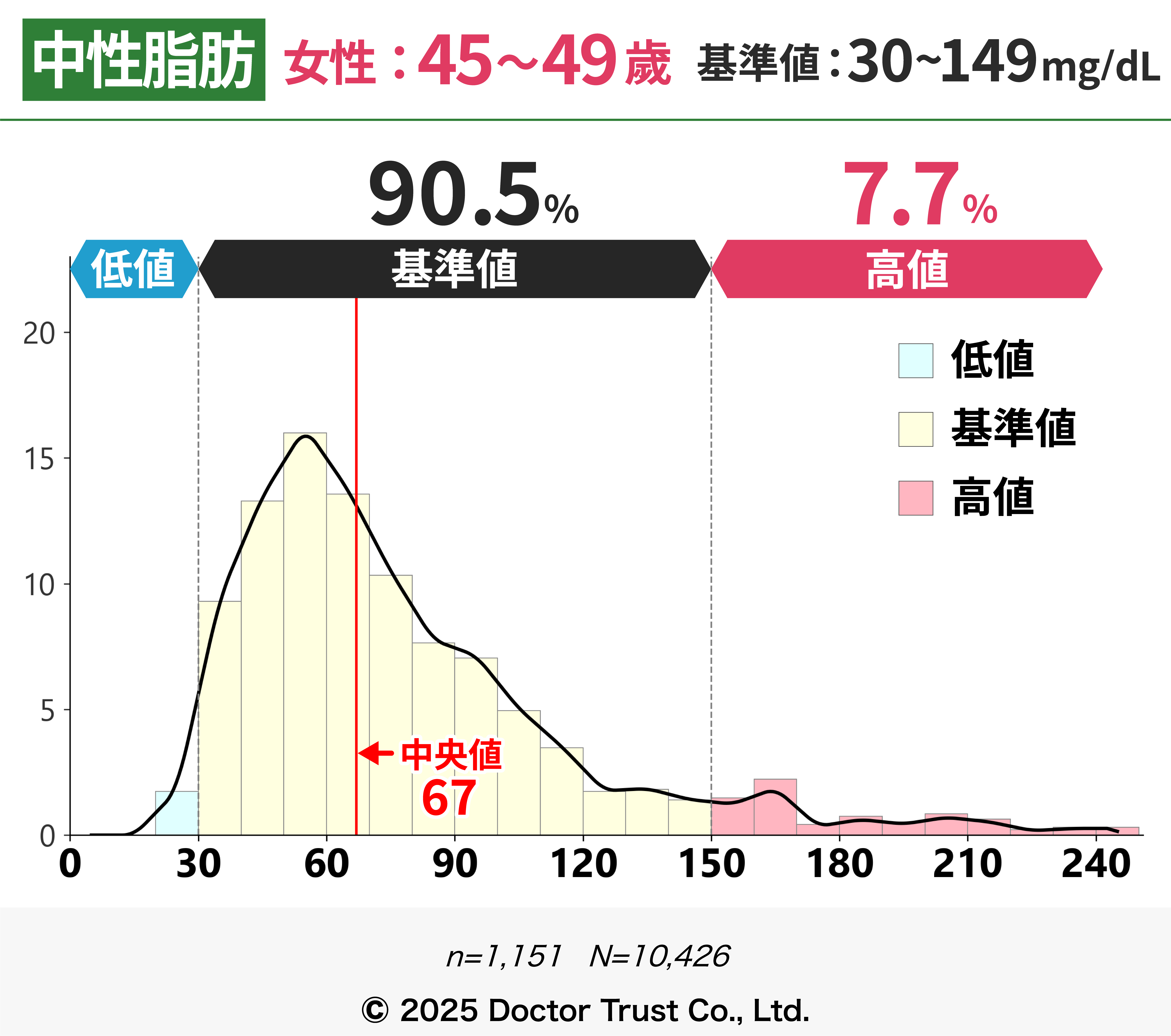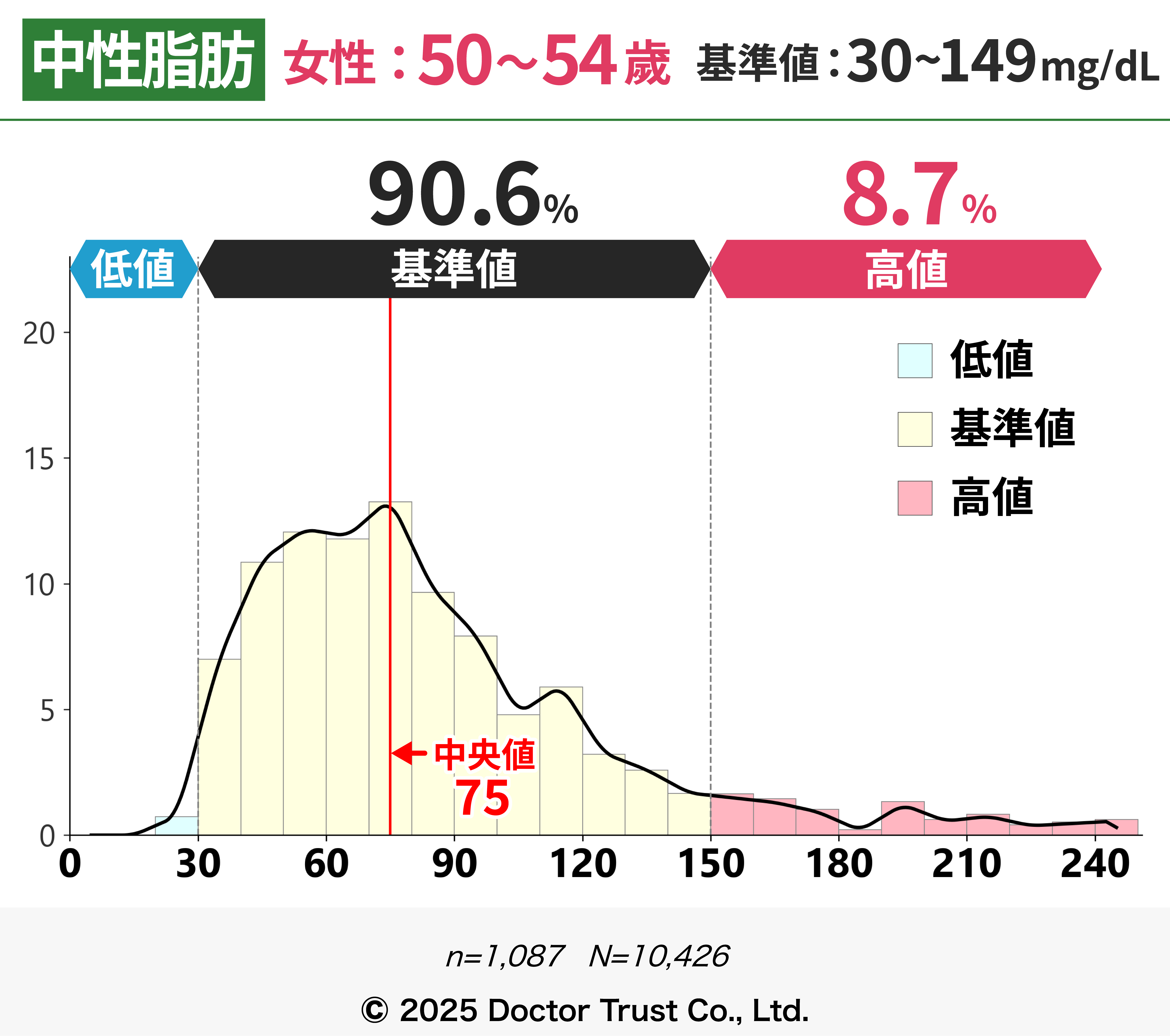 更年期に当たる方が多く、女性ホルモンの急激な減少から中性脂肪が増加しやすい年代です。