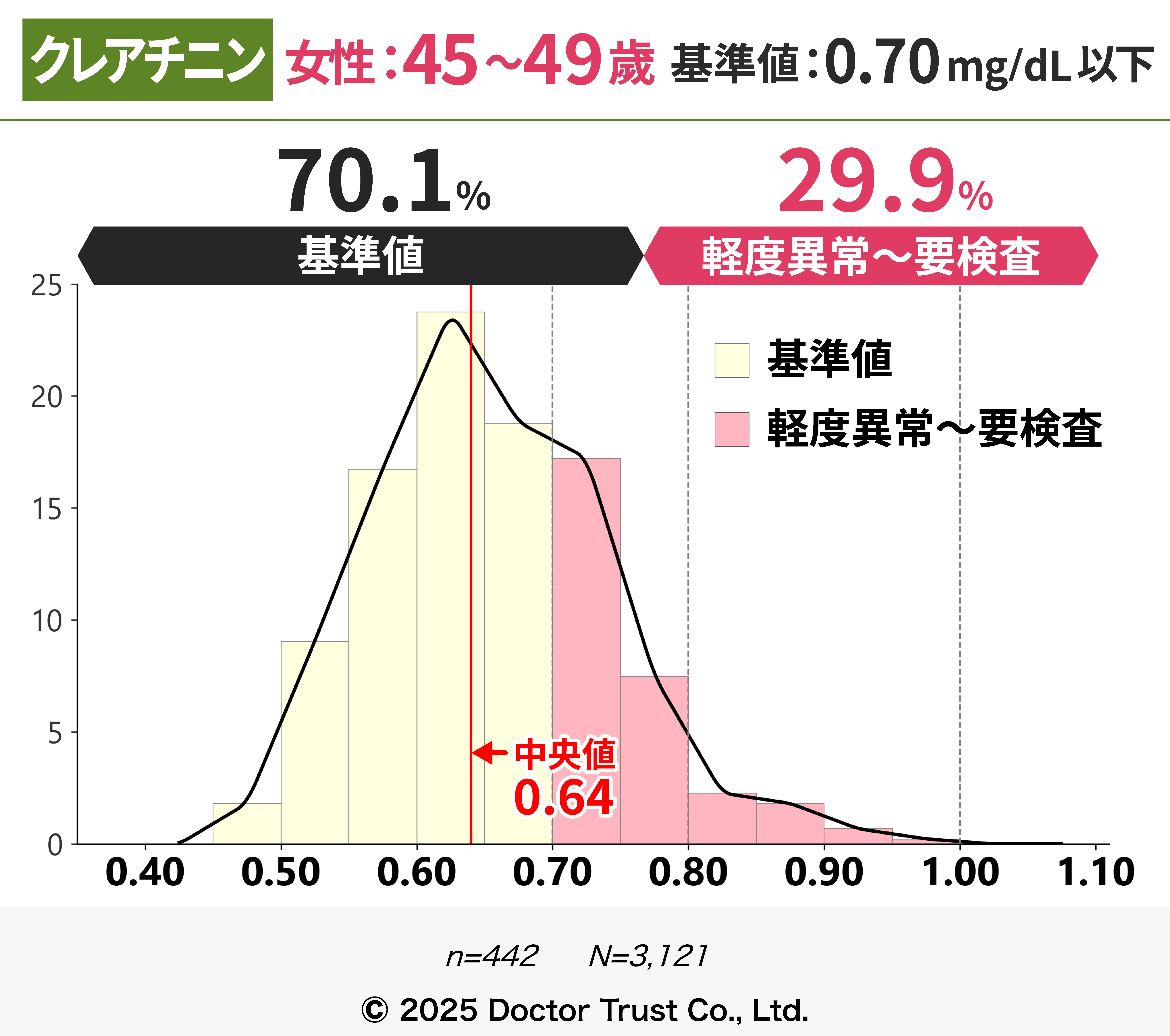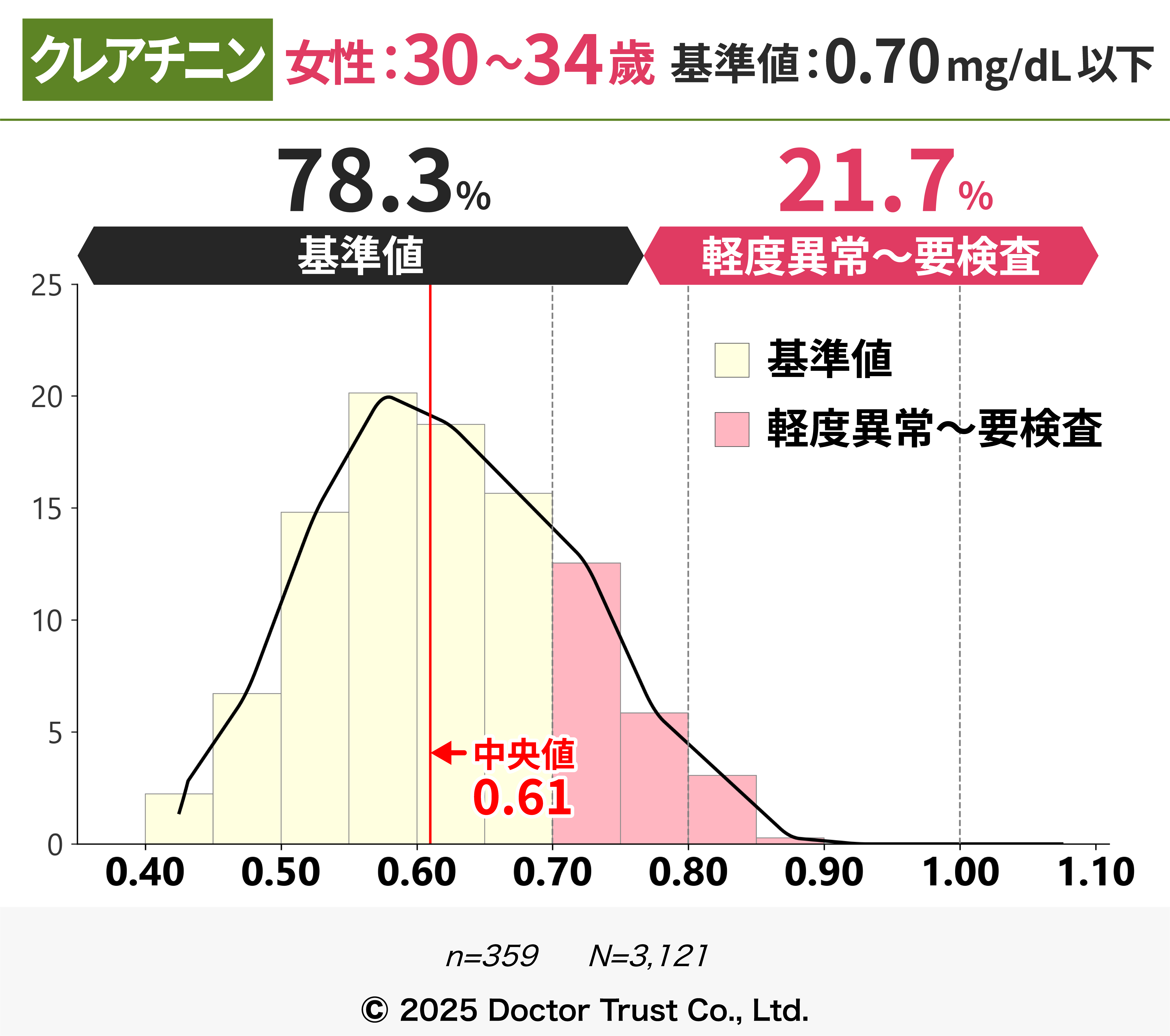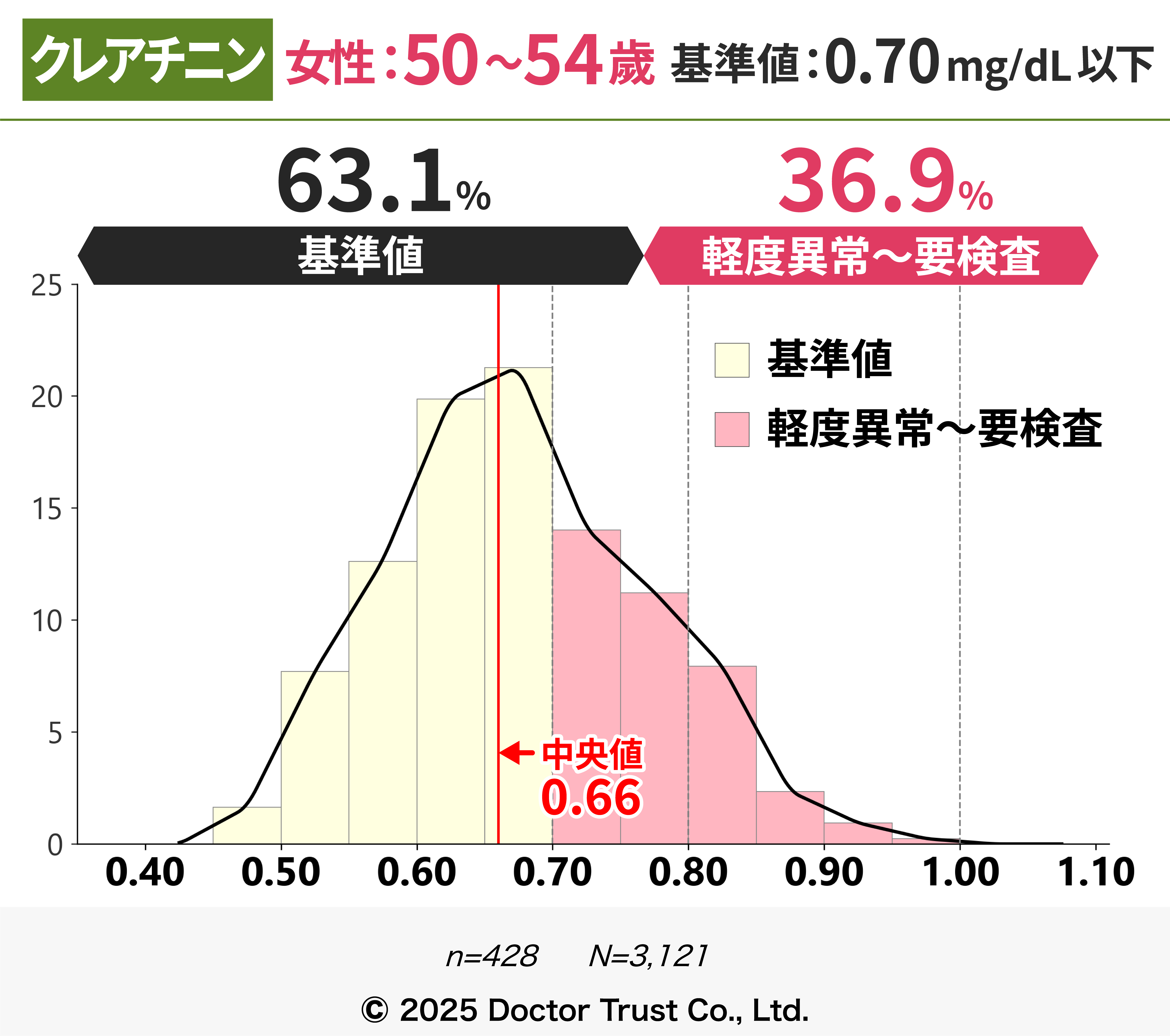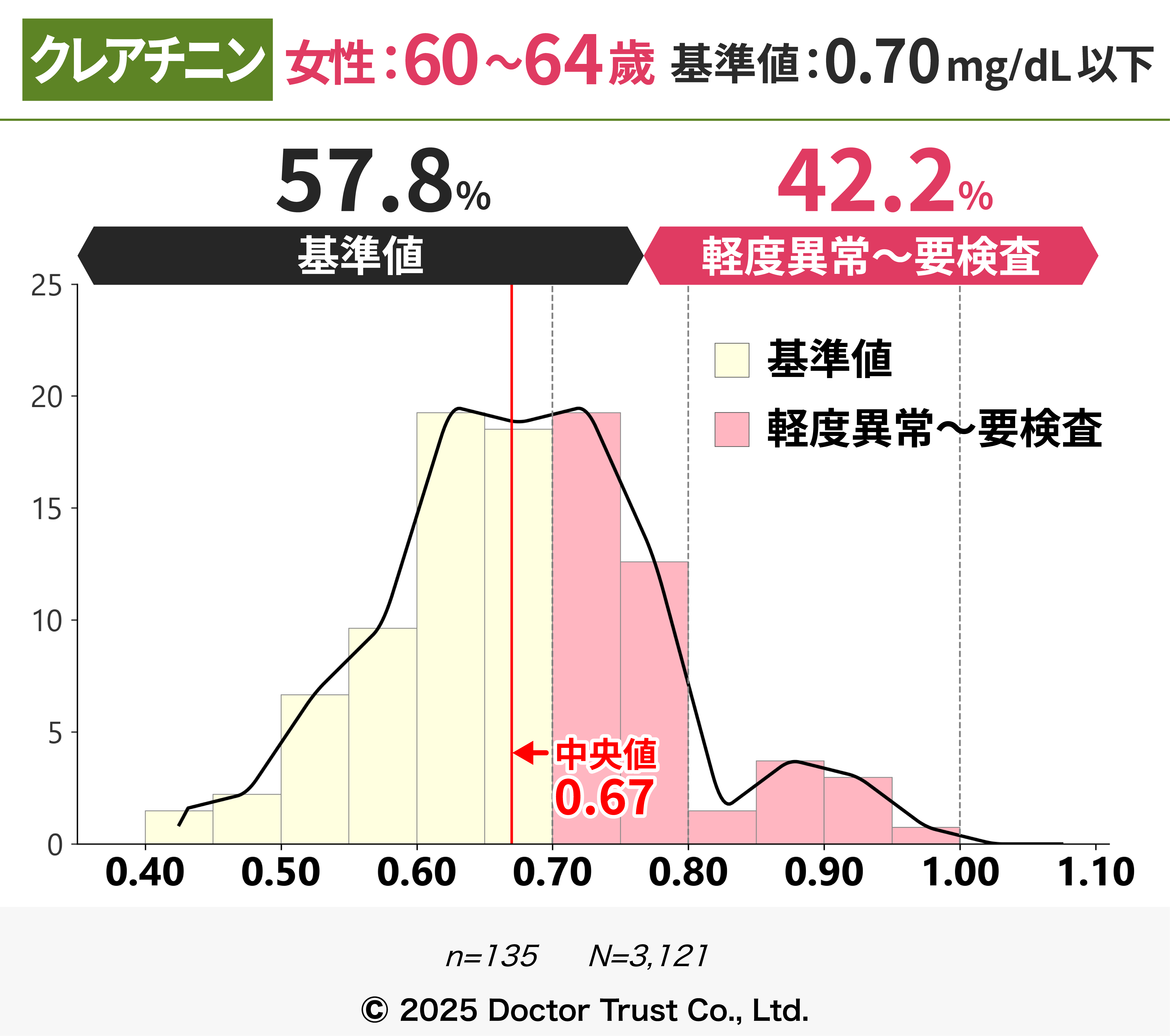 クレアチニンは本来排泄されるはずの老廃物のため、血液中の濃度が高いほど体内に老廃物が残存していることを指します。40代までは7割以上の方が基準値内ですが、50代以降から基準値超えの割合が増え、中央値が基準値に限りなく近くなっています。