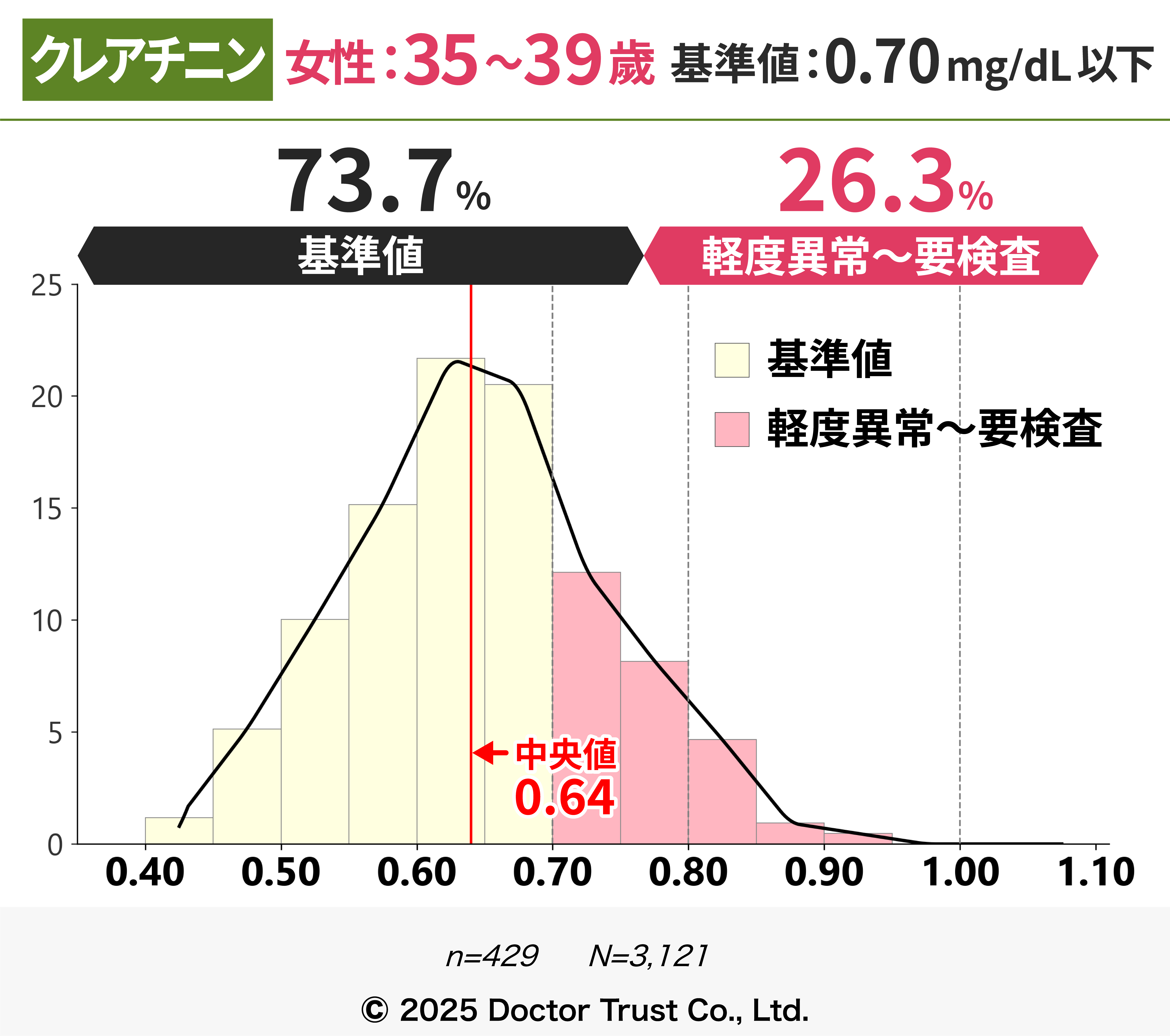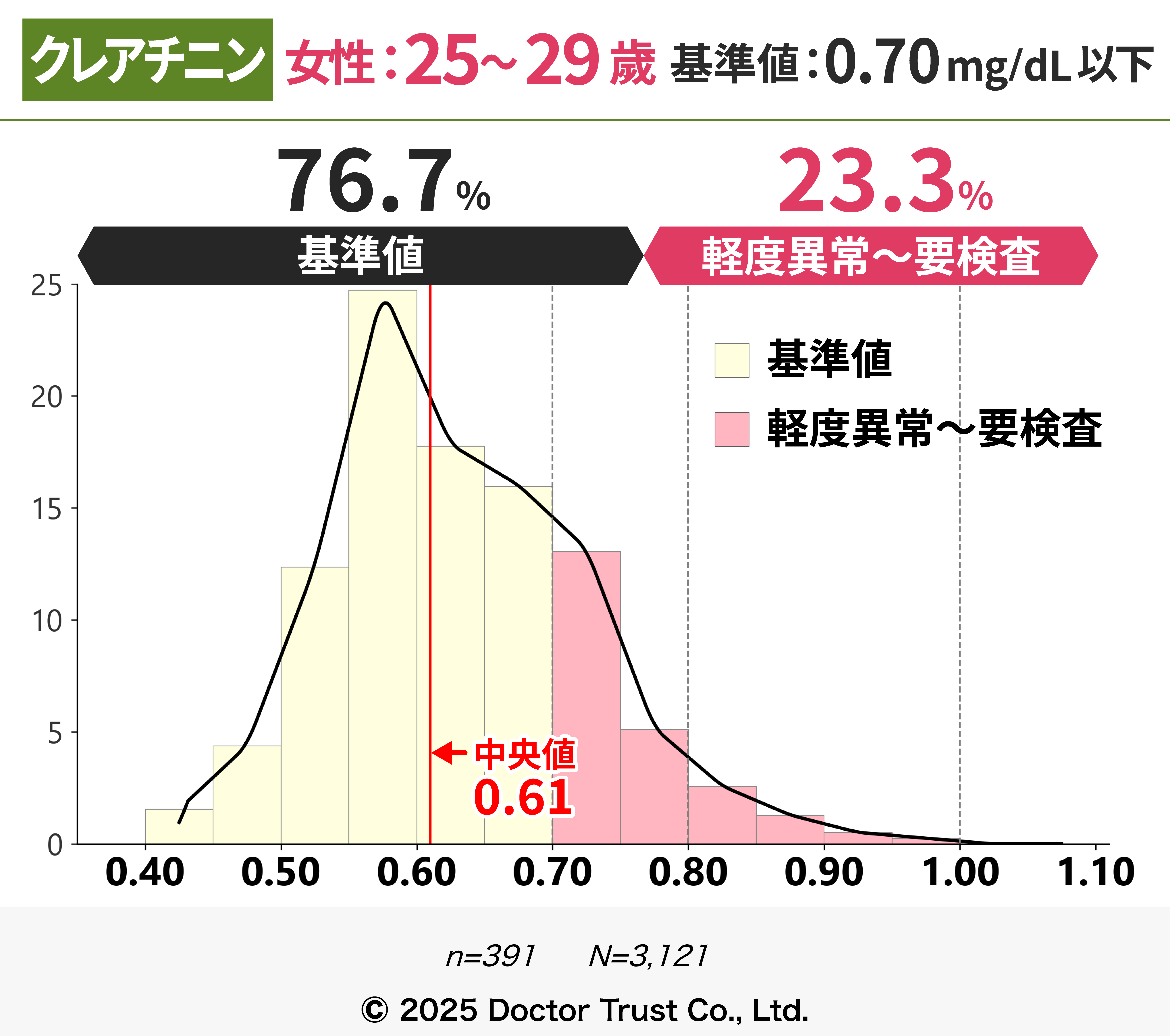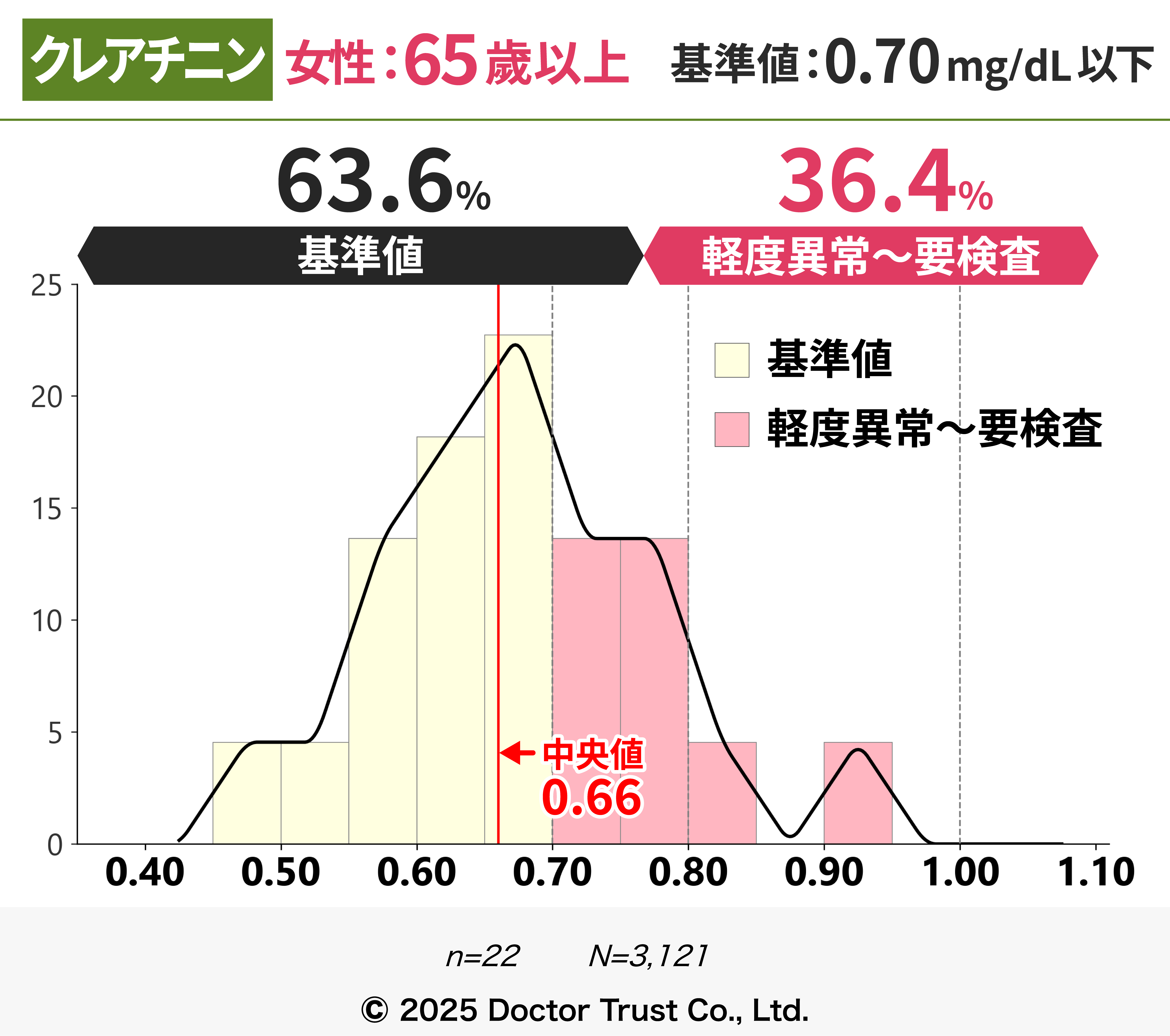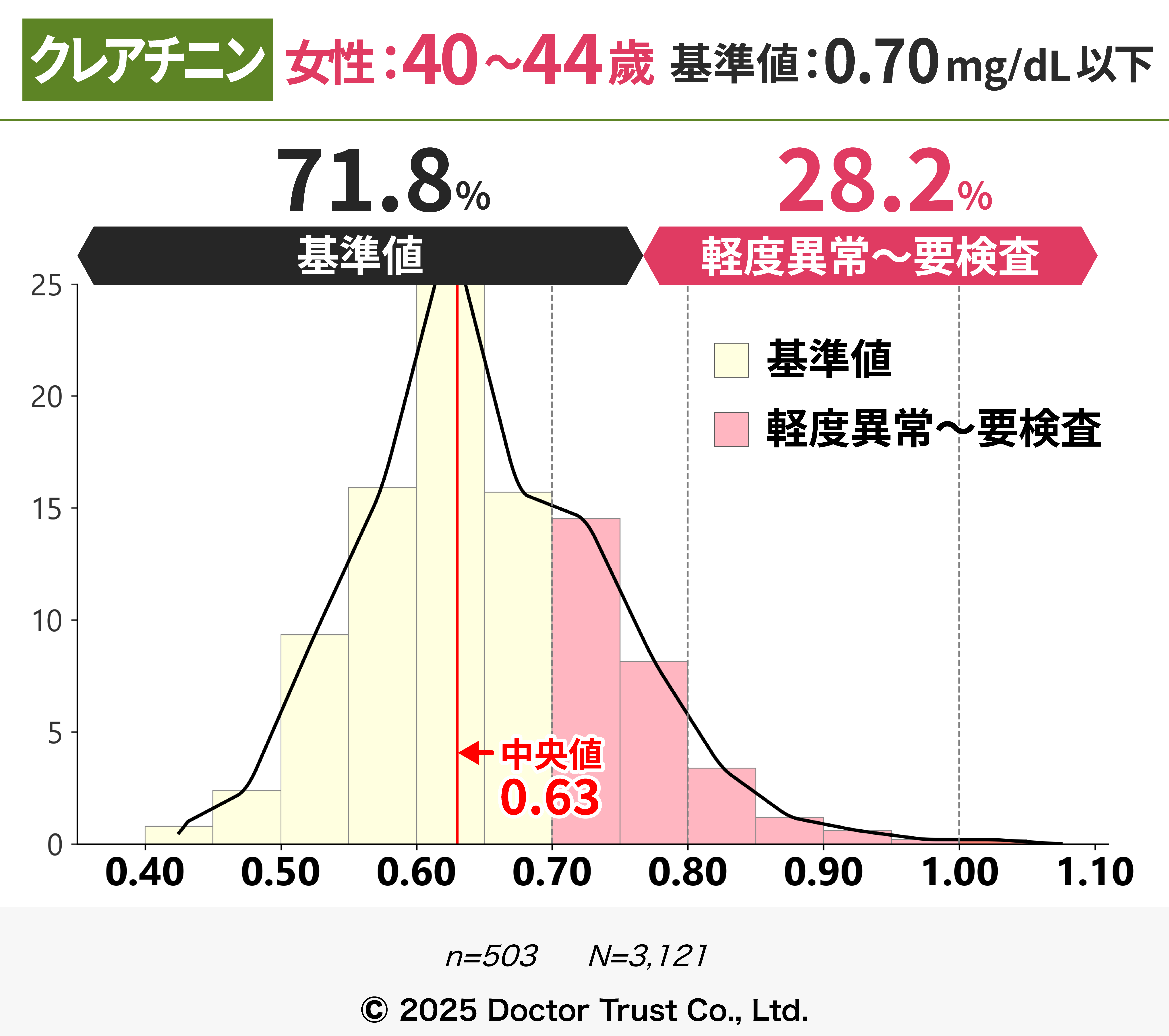 クレアチニンは本来排泄されるはずの老廃物のため、血液中の濃度が高いほど体内に老廃物が残存していることを指します。40代までは7割以上の方が基準値内ですが、50代以降から基準値超えの割合が増え、中央値が基準値に限りなく近くなっています。