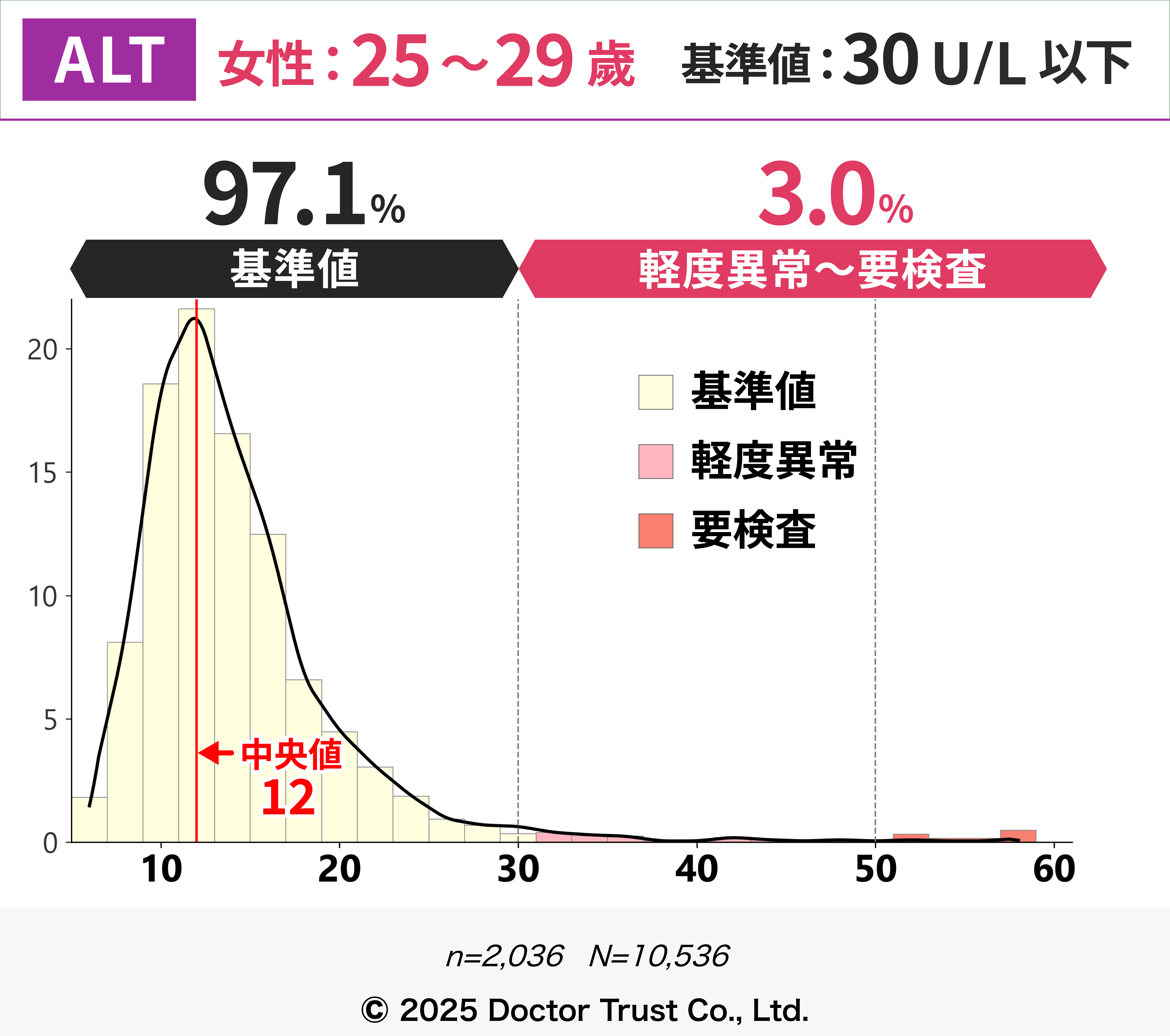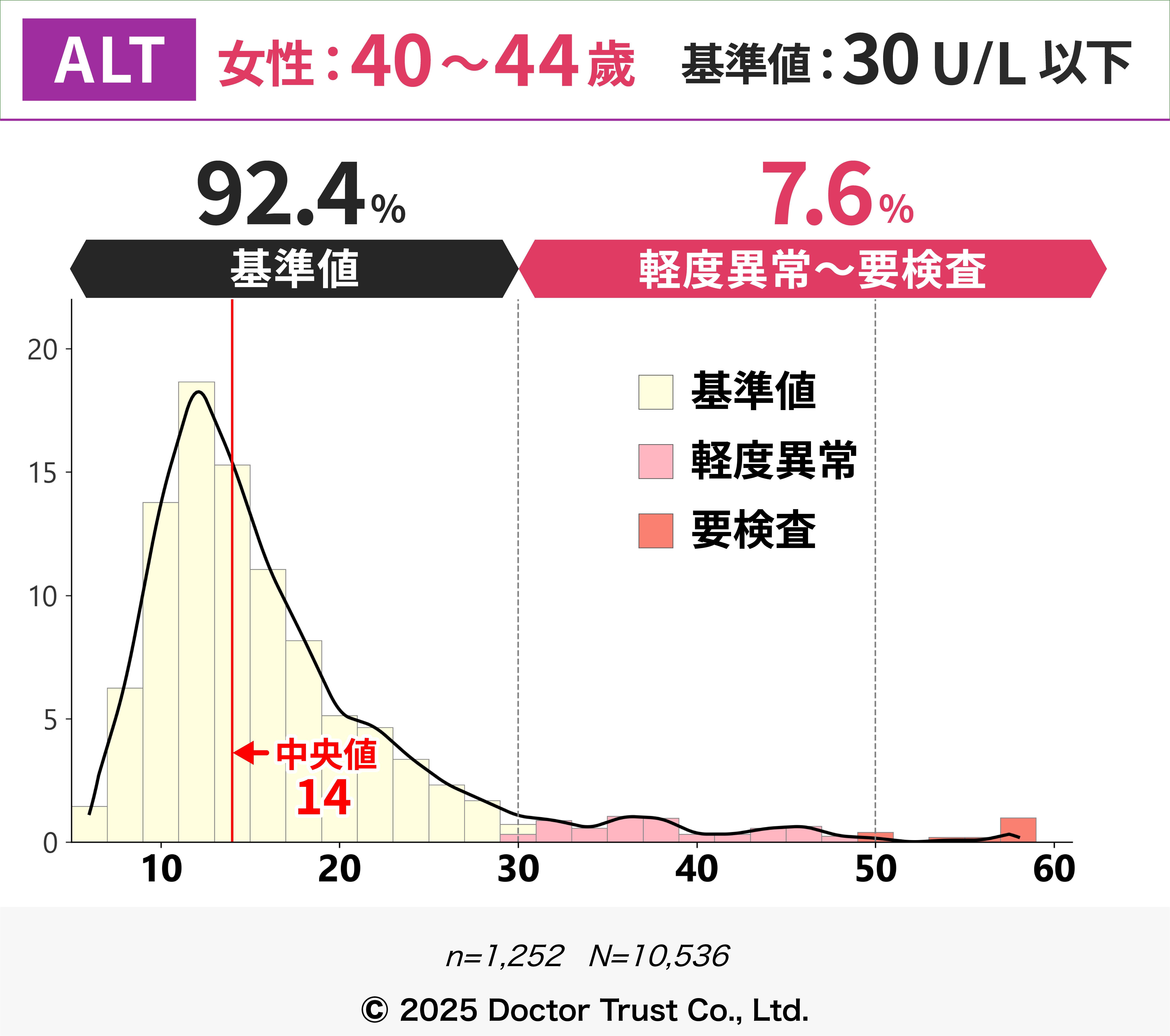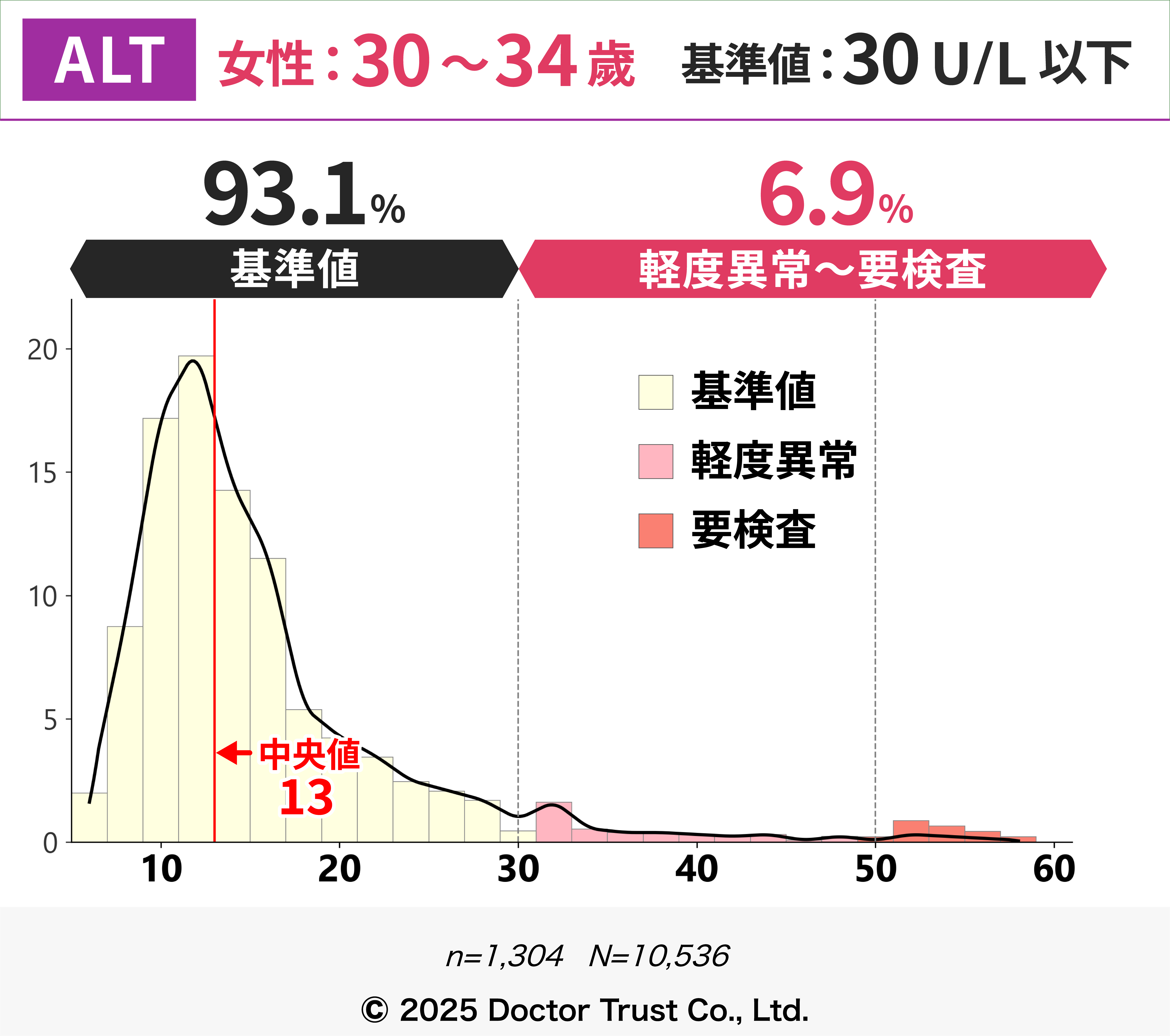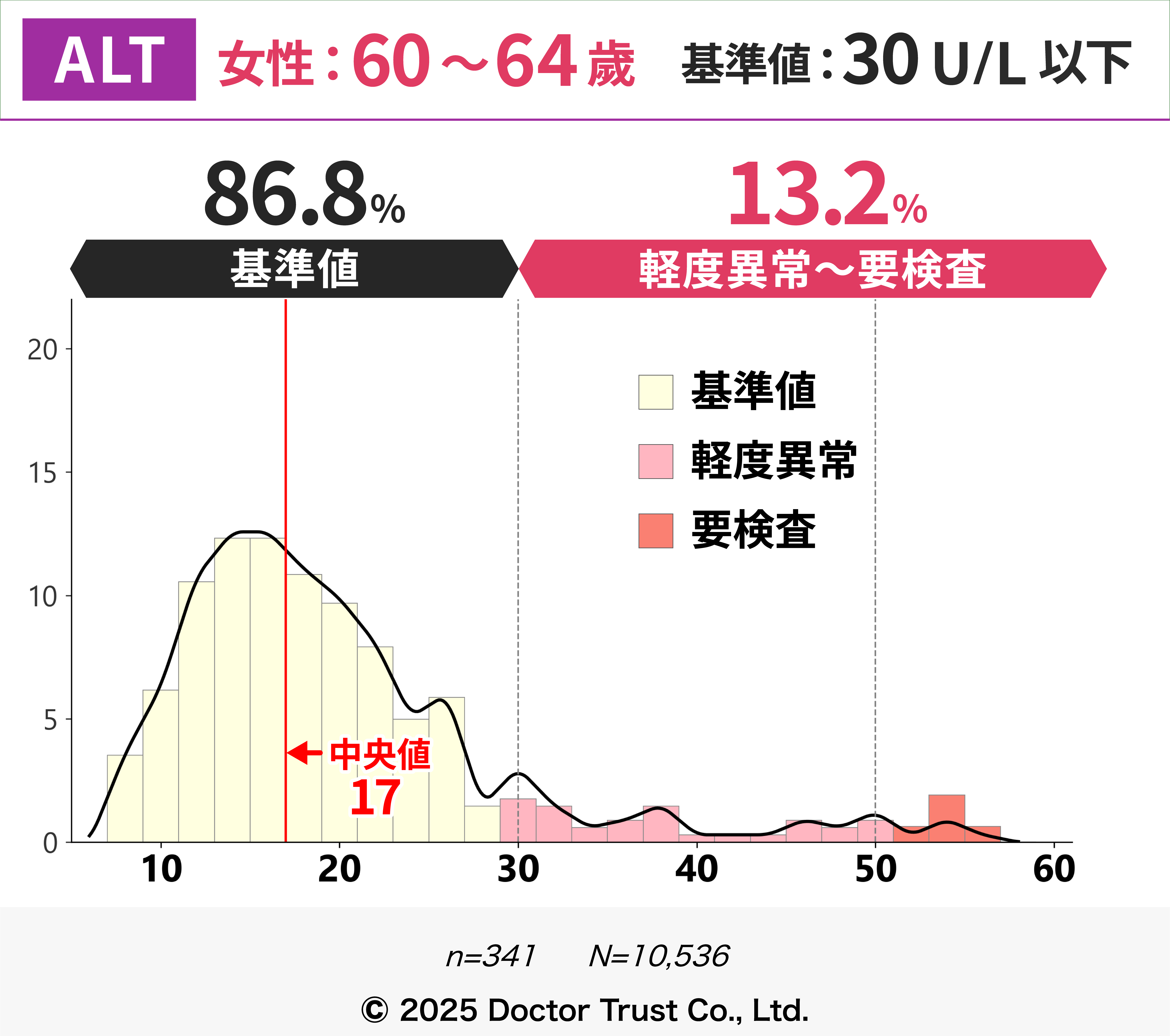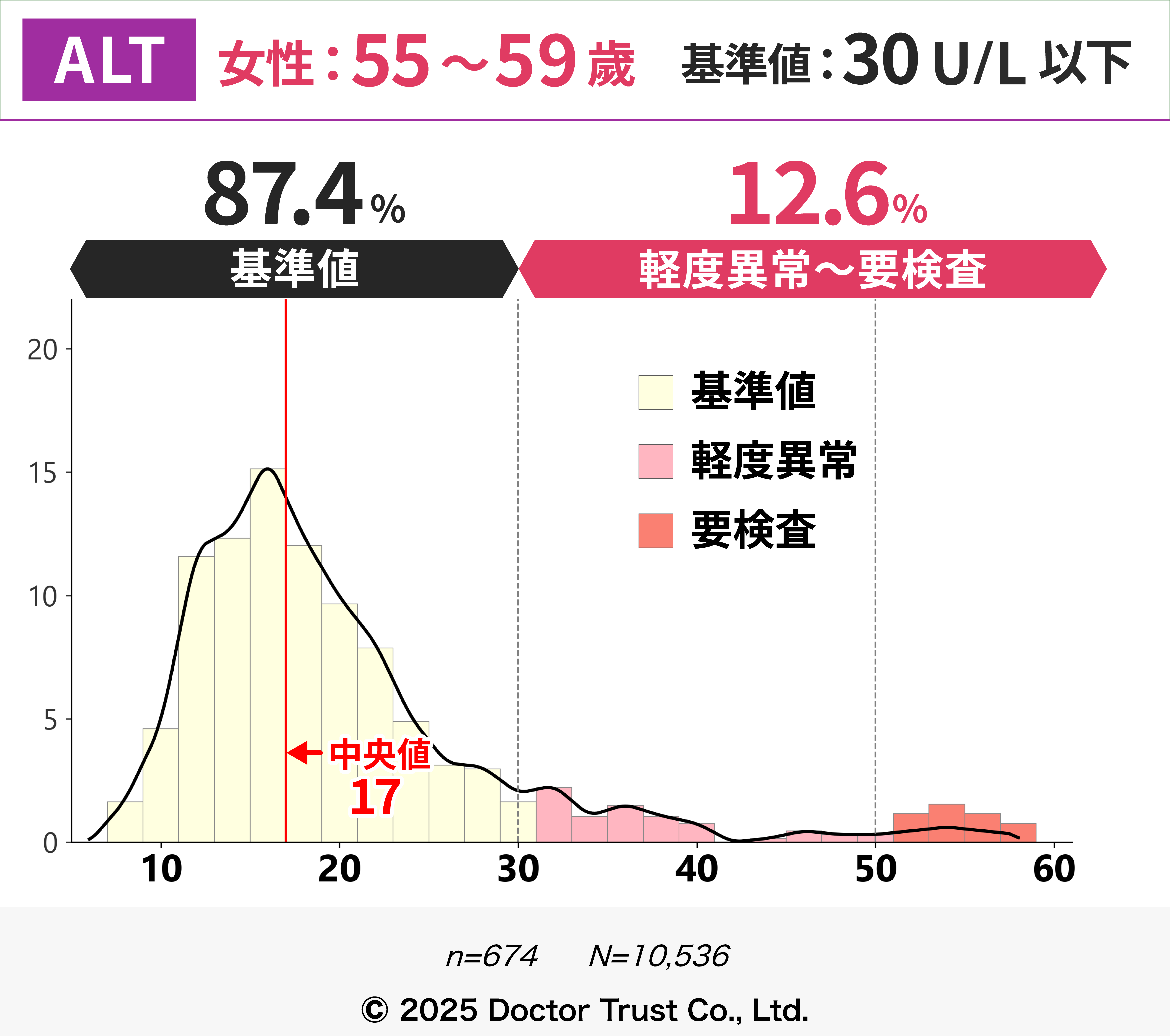 50歳以降は、閉経や更年期に伴うホルモンの変化により脂肪肝や代謝が変化し、ALT上昇の一因となっている可能性があります。