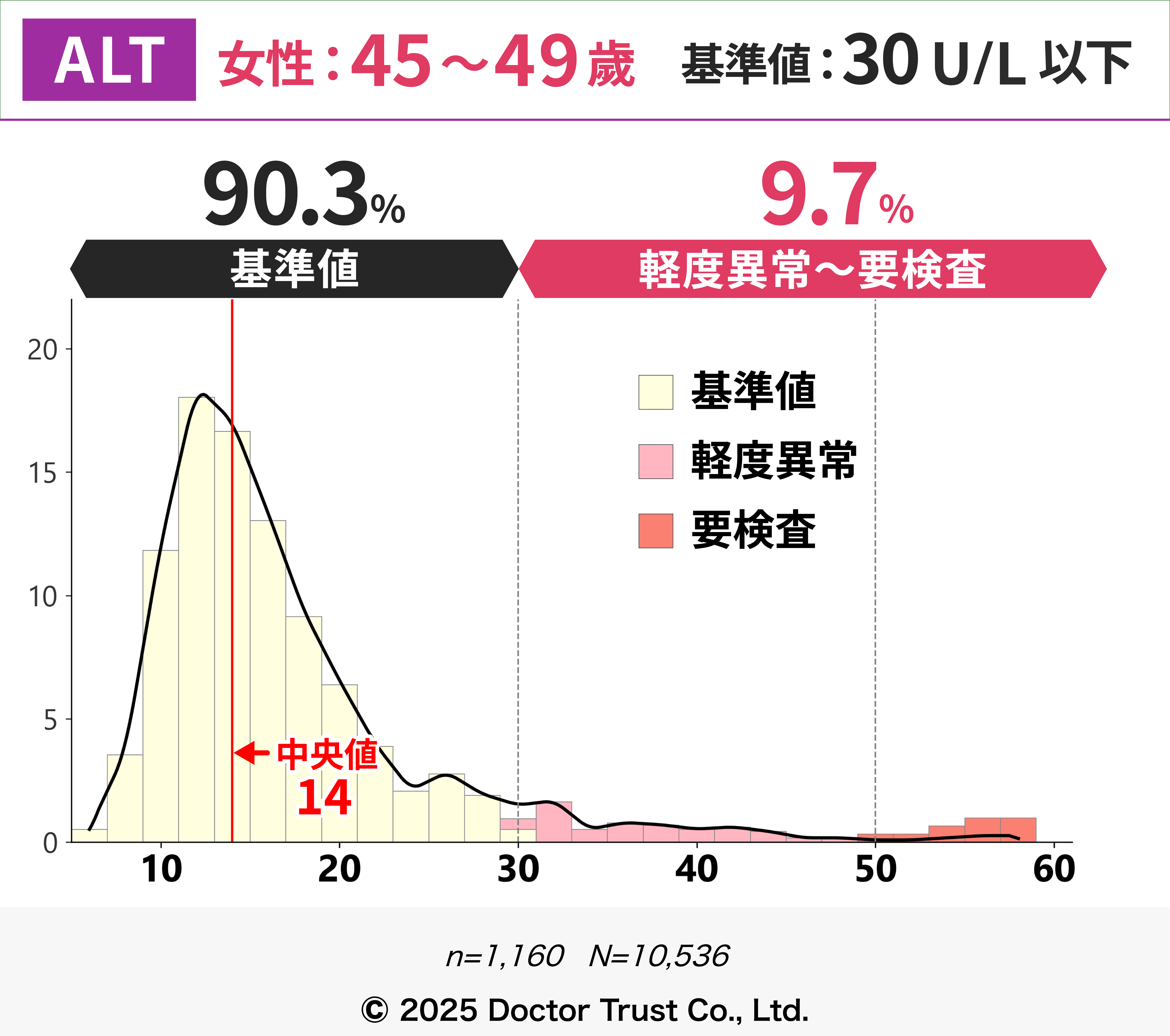 女性では45歳頃から肥満や脂質代謝異常が増え、それに伴いALTの軽度上昇がみられる方も増加します。