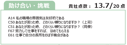 「助け合い・挑戦」の軸は設問数80問版ストレスチェックの以下から構成されています。