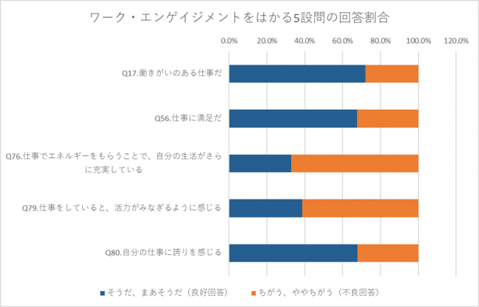 ストレスチェック80項目版のうち、「ワーク・エンゲイジメント尺度※」に該当するものは前編で示したとおり、「仕事をしていると、活力がみなぎるように感じる」「自分の仕事に誇りを感じる」の2問です。
