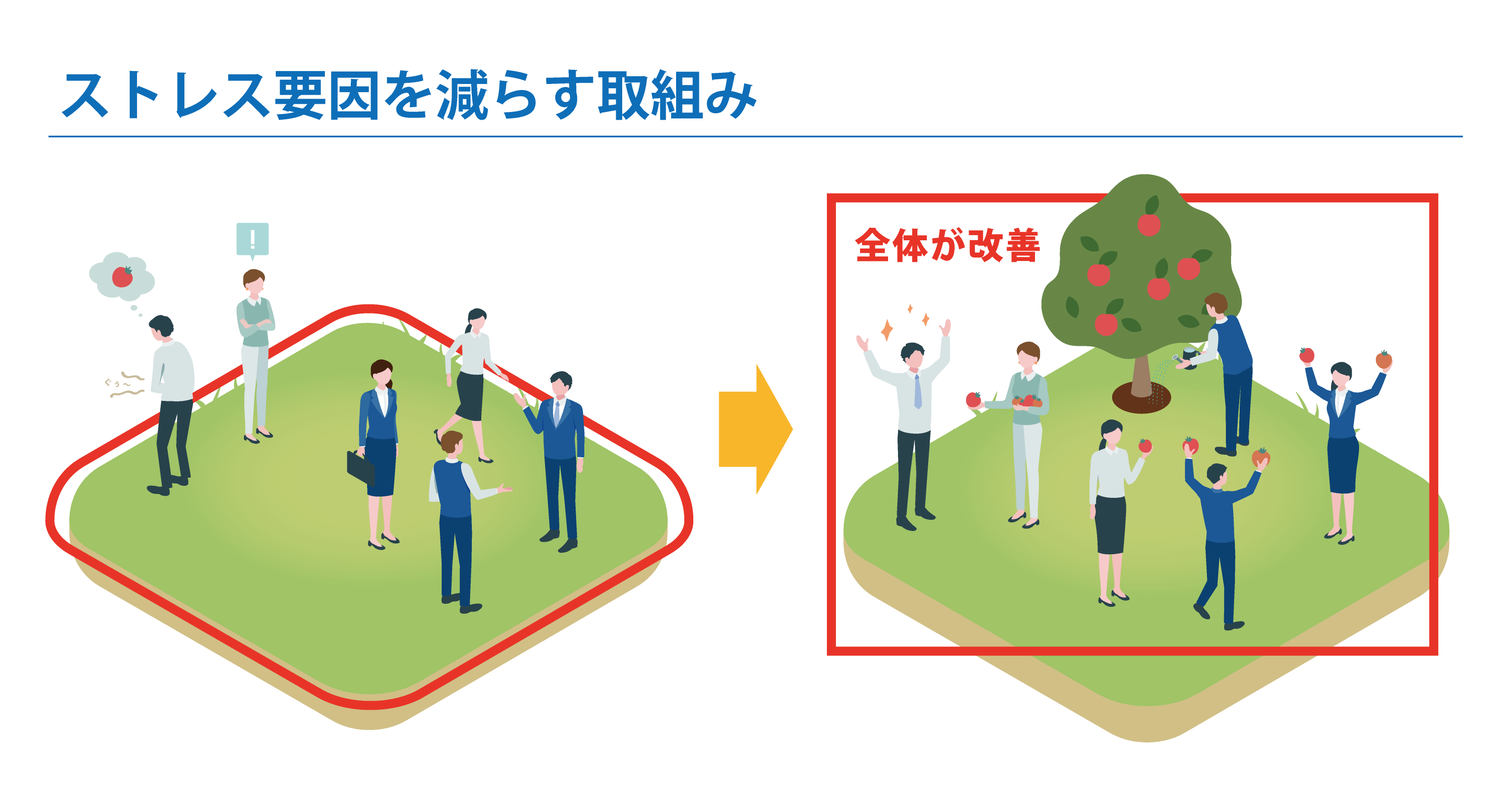 下の図のように、空腹の人をケアすることを目的とするのでなく、皆が自由に木の実を食べることができるよう木を植えることで、環境全体が改善し、それが空腹を訴えている人の改善にもつながります。職場環境改善において、すでに発生しているストレスに対処するのでなく、予防的観点から環境全体に目を向けるべき理由です。