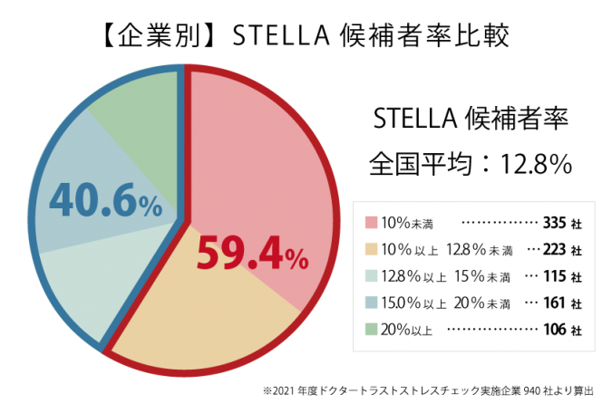 2021年度ドクタートラストでストレスチェックを受検した940社において最も高ストレス者率が高かった企業は39.4%でした。当然STELLA率が20%以上の企業においては高ストレス者がいない企業も8社程度存在することからもその差は歴然です。
