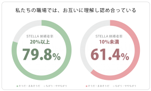 またコミュニケーションが活性化されることからストレスの原因について話す機会や、改善に向けて意見を言うことのできる環境も整っているのではないかと考えられ、まずSTELLAを増やすという行動自体が従業員全体に良い影響を及ぼすのです。