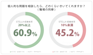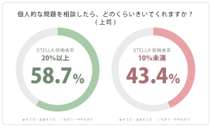 前述の回答差からも、個人的な問題を相談できるような信頼関係の深さは、STELLAが多い職場ほど深いのはもちろん、STELLAが少ない職場では50%を下回る結果であったことには注目せざるを得ません。