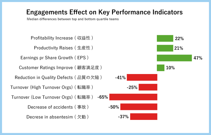 上図Gallup社の調査により従業員エンゲイジメントの高いチームは、低いチームより以下が大幅に上回る結果が出ています。