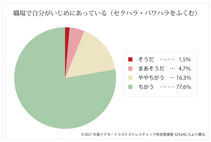 2021年度ドクタートラストでストレスチェックを受検した32万人のデータでは、「そうだ」は1.5%、次いで「まあそうだ」4.7%、「ややちがう」16.3%、「ちがう」77.6%でした。
