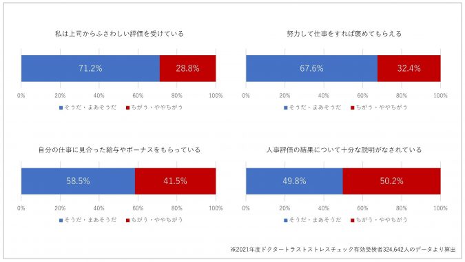 また、努力しても褒めてもらえないと感じている人が32.4%、自分の仕事に見合った給与やボーナスをもらっているかについては41.5%がちがう・ややちがうと感じていました。