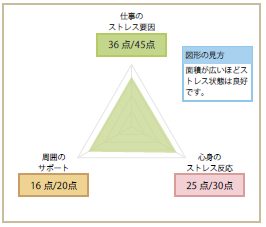 図のように領域ごとに点数化することで自身のストレス度合を可視化し、把握することが出来るのがストレスチェックの利点だと考えられます。