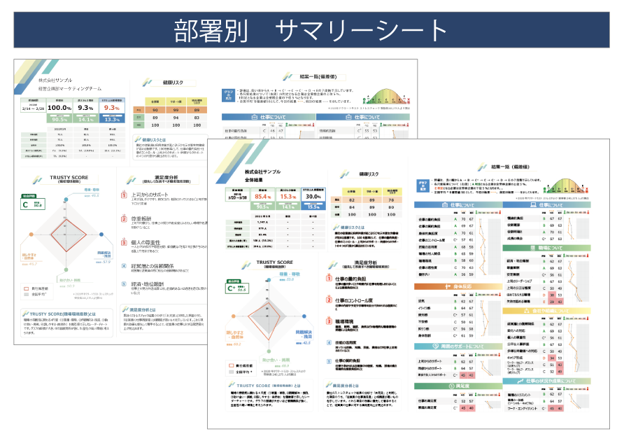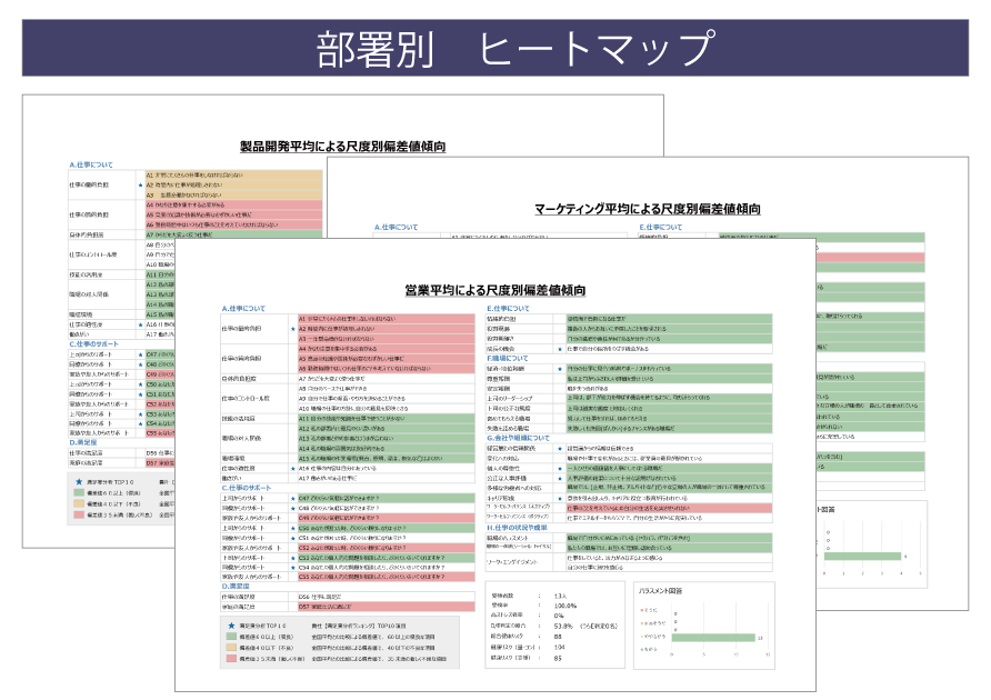 ドクタートラストのストレスチェックでは、部門長への共有や経営層が部署ごとの結果比較を行うための資料として、ヒートマップや部署別サマリーシートを作成しています。