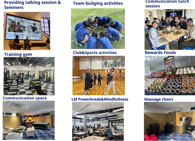 郡山工場では、「Evolve」の「Mental Wellbeing」の結果を基に、トレーニングジムやコミュニケーションスペースの設置、グローバル各地域の製造拠点合同で「Power break」や「Mindfulness」のセッションの開催、社内ランチ会の開催など様々な取り組みを行ってまいりました。